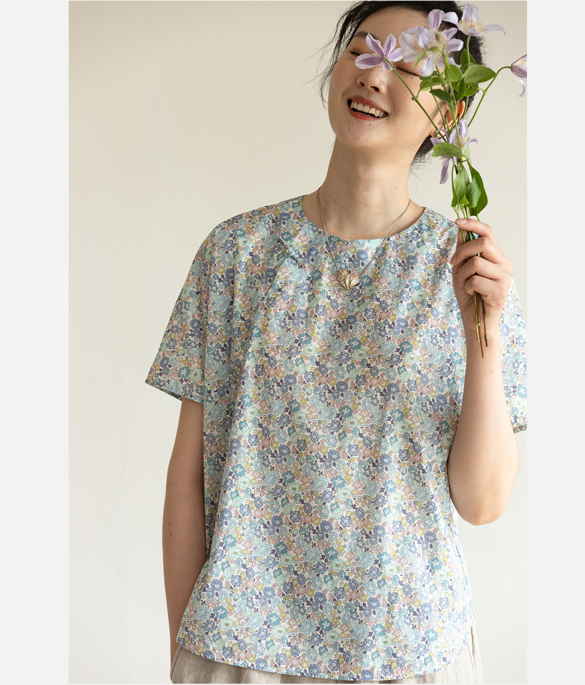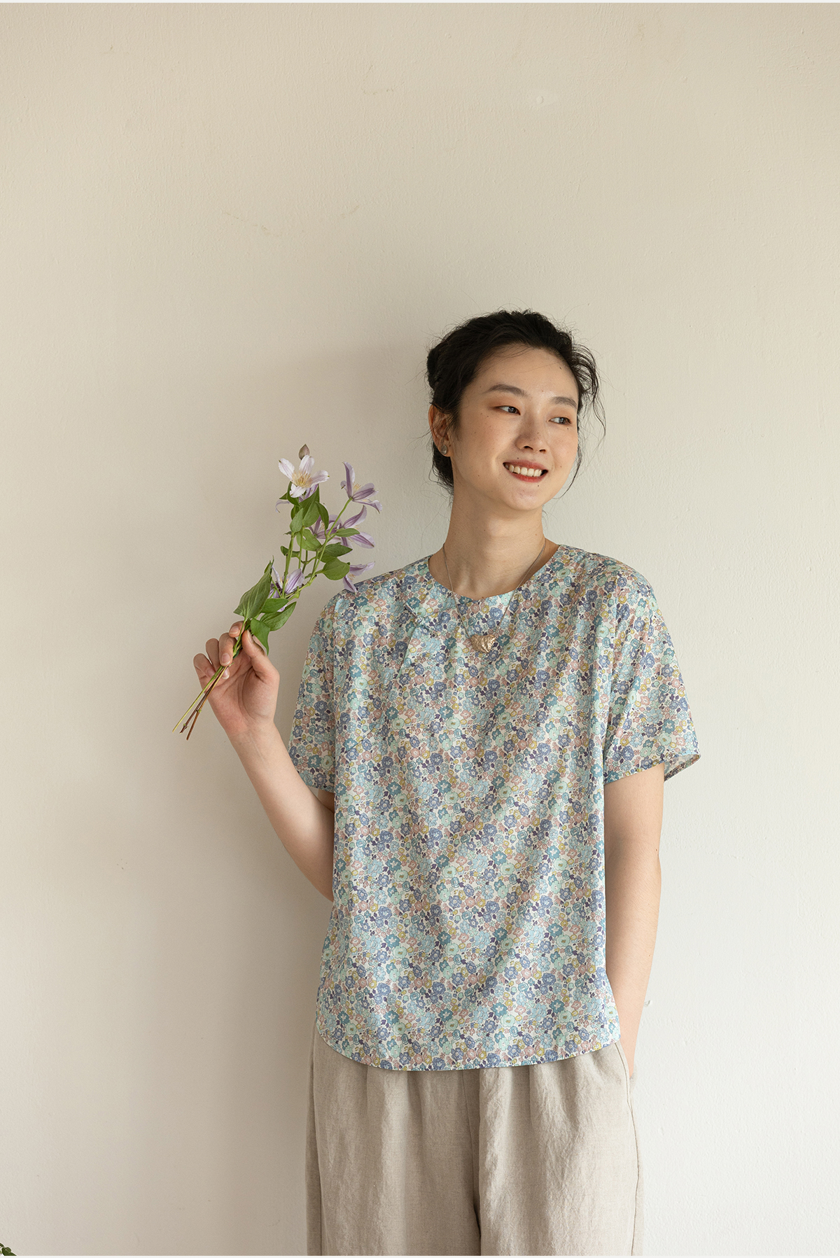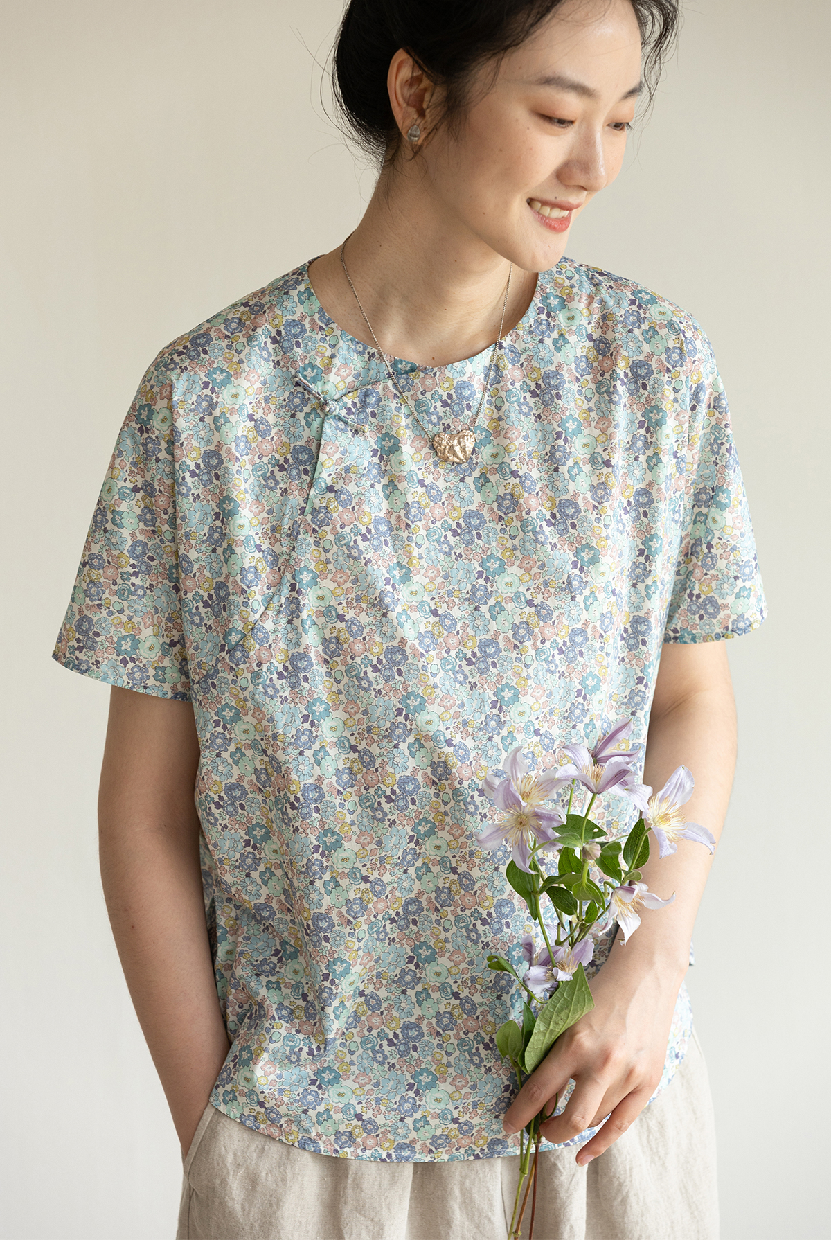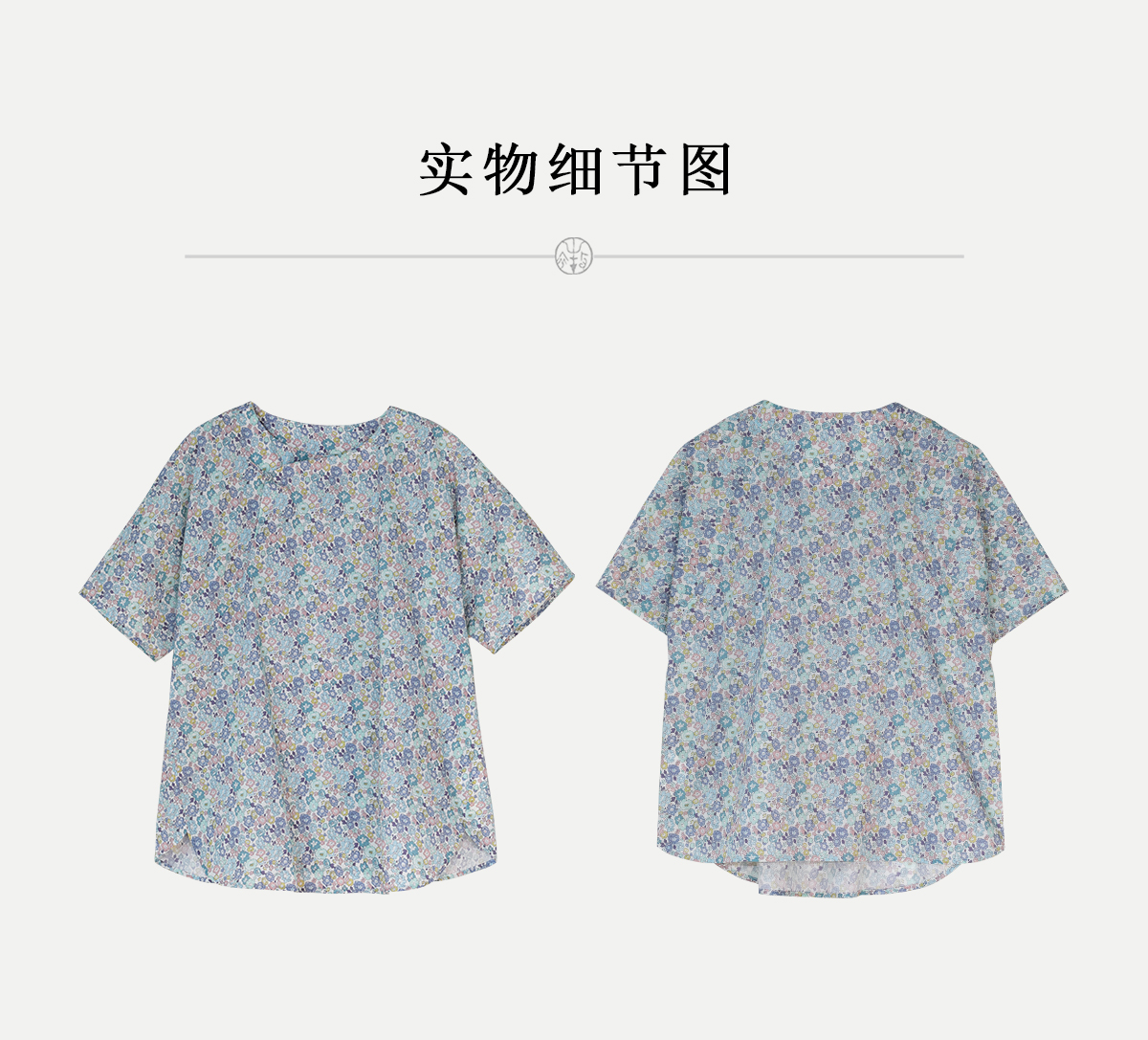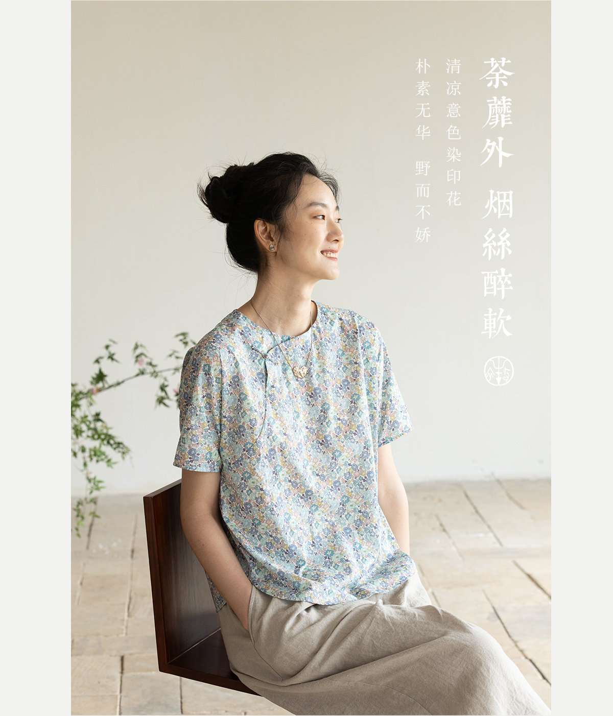 牧衣游原创夏花印花纯棉套头衫轻薄文艺碎花新中式上衣小衫 满弦