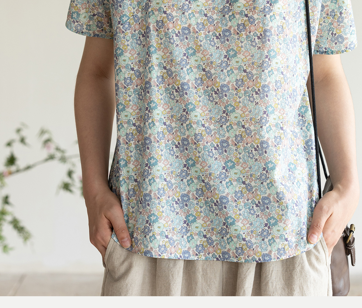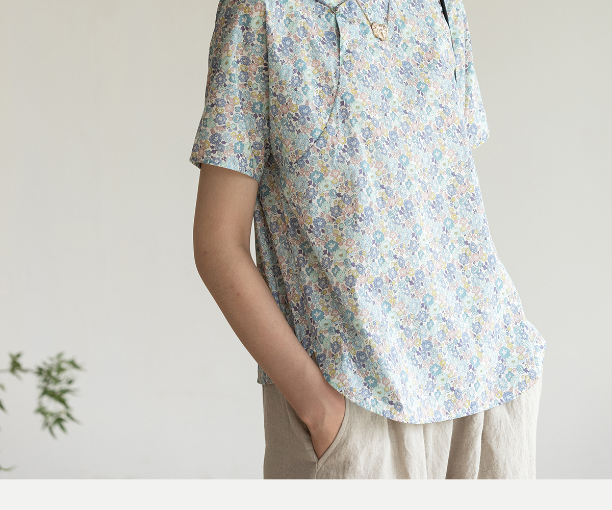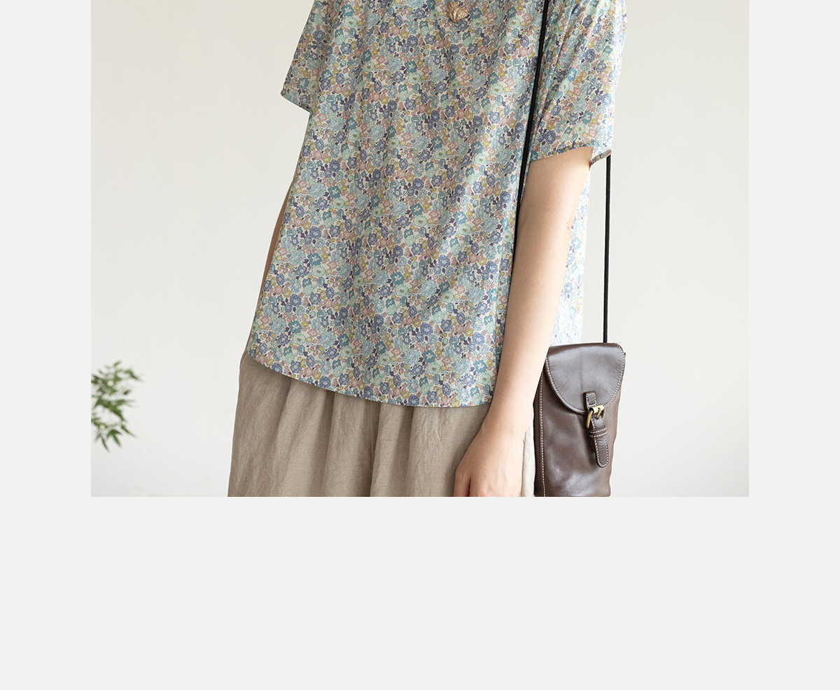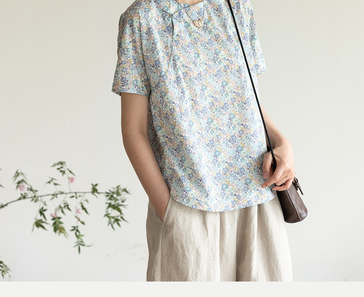 牧衣游原创夏花印花纯棉套头衫轻薄文艺碎花新中式上衣小衫 满弦
