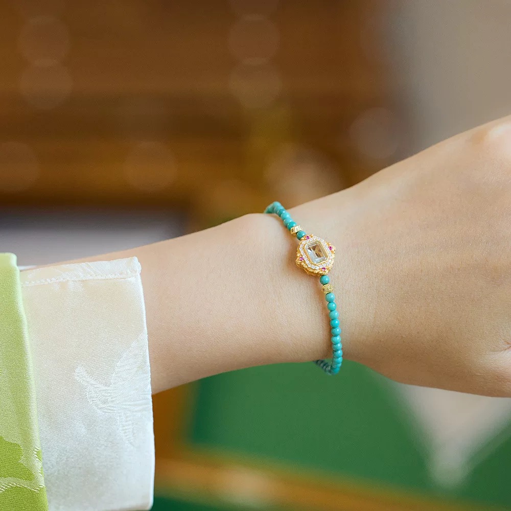 【材质】925银镀金镶嵌蓝水翡翠、原矿湖北绿松石、925银镀金配件