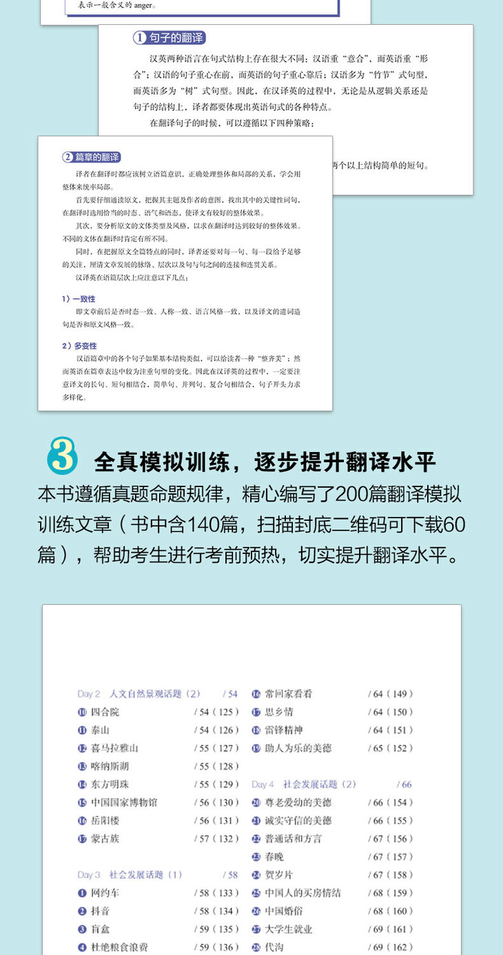 本书遵循真题命题规律,精心编写了200篇翻译模拟训练文章(书中含140篇,扫描封底二维码可下载60篇),帮助考生进行考前预热,切实提升翻译水平。