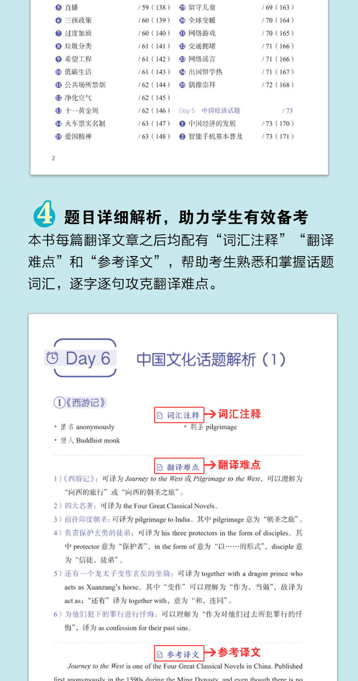 每篇翻译文章均配有“词汇注释”“翻译难点”和“参考译文”,帮助考生掌握和认知话题词汇,逐字逐句攻克翻译难点。考生可以自己先练习翻译,根据自己遇到的难点,有针对性地与“参考译文”进行对照,更高效地提高自己的翻译水平。