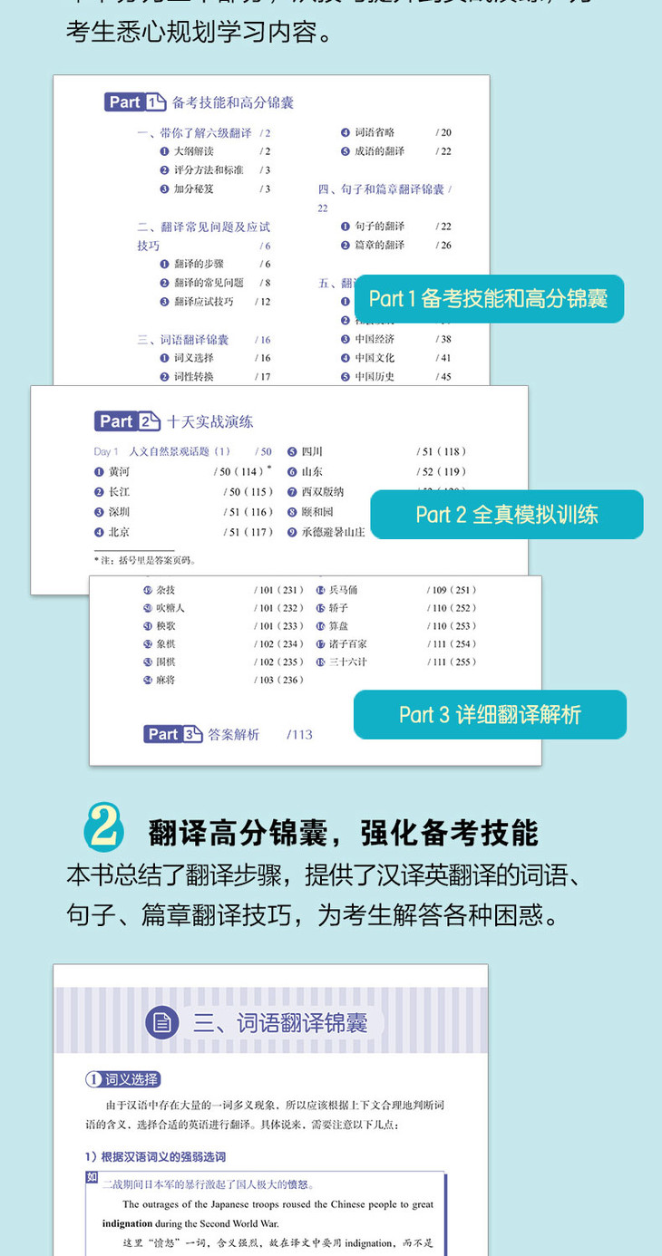 Part 1是六级翻译理论指导,包括六级翻译扫盲、翻译步骤以及词语、句子、篇章的翻译锦囊和热门话题词汇。
