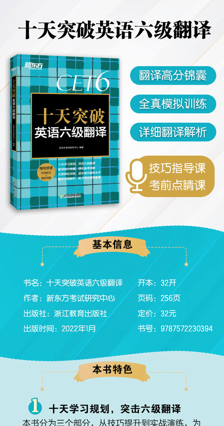 《十天突破英语六级翻译》是新东方十天突破专项系列图书之一,助力考生短期有效攻破六级翻译难关。