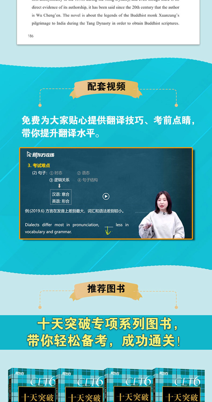 技巧点拨易学实用,翻译选材贴合真题、紧追当下热点、新颖多样,*在用较短的时间提升考生的学习效果和得分率。下面总结一下本书特色: