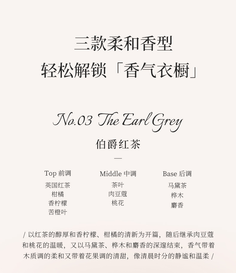 红茶柑橘调香型,以红茶的醇厚和香柠檬、柑橘的清新为开篇,随后继承肉豆蔻和桃花的温暖,又以马黛茶、桦木和麝香的深邃结束,香气带着木质调的柔和又带着花果调的清甜,像清晨时分的静谧和温柔