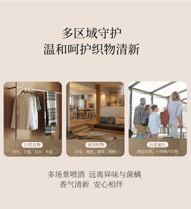 其细腻喷雾不仅能即时中和包裹织物的尼古丁、汗味等尴尬异味,更能深入纤维根源,实现长效抑菌除螨。