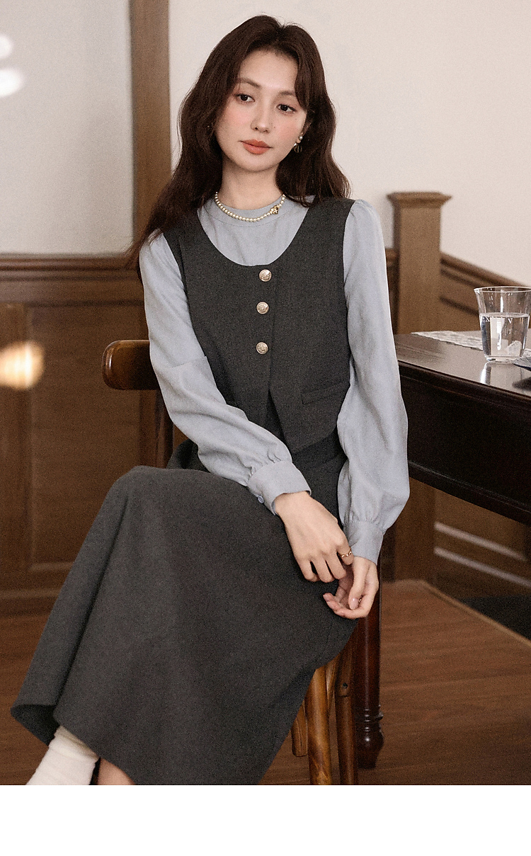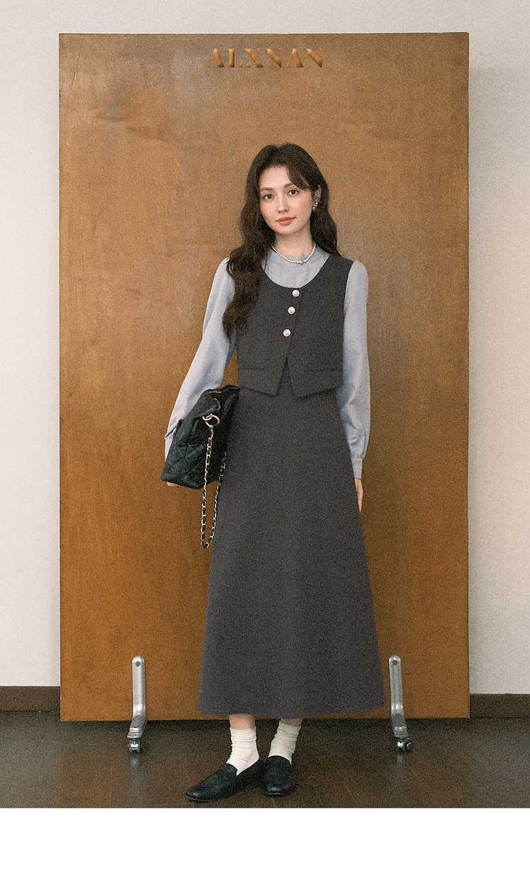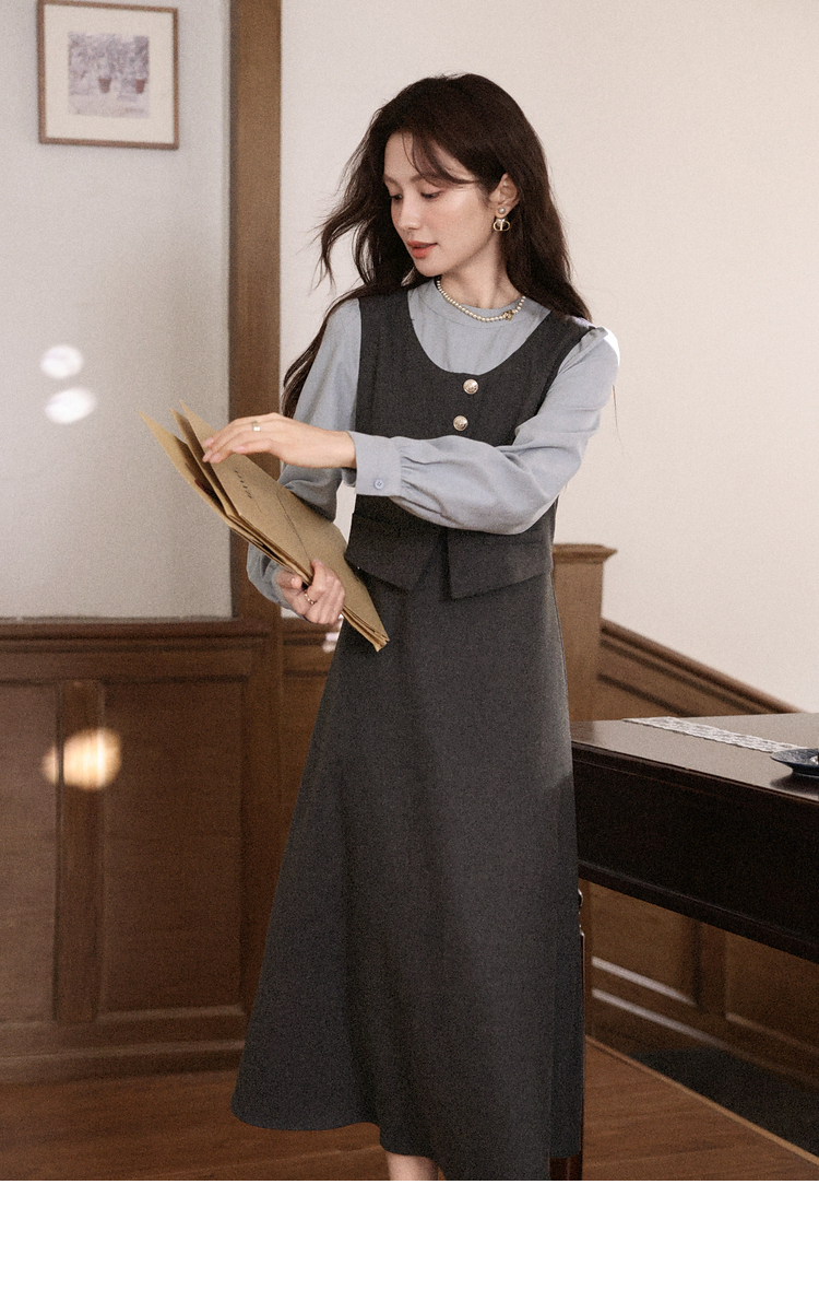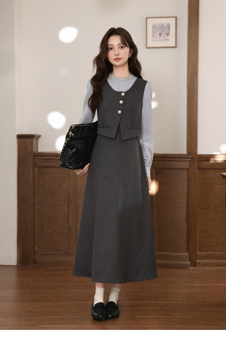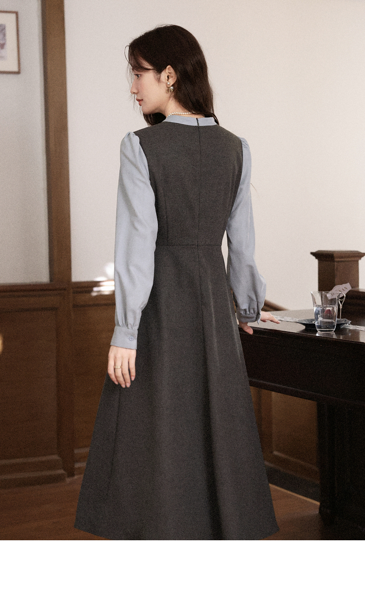 鹿向南「雾灰河畔」深灰色假两件连衣裙女秋冬气质设计感长款裙子