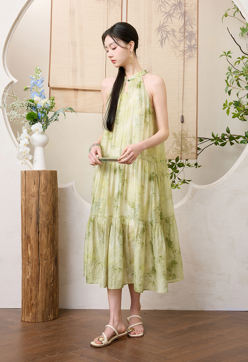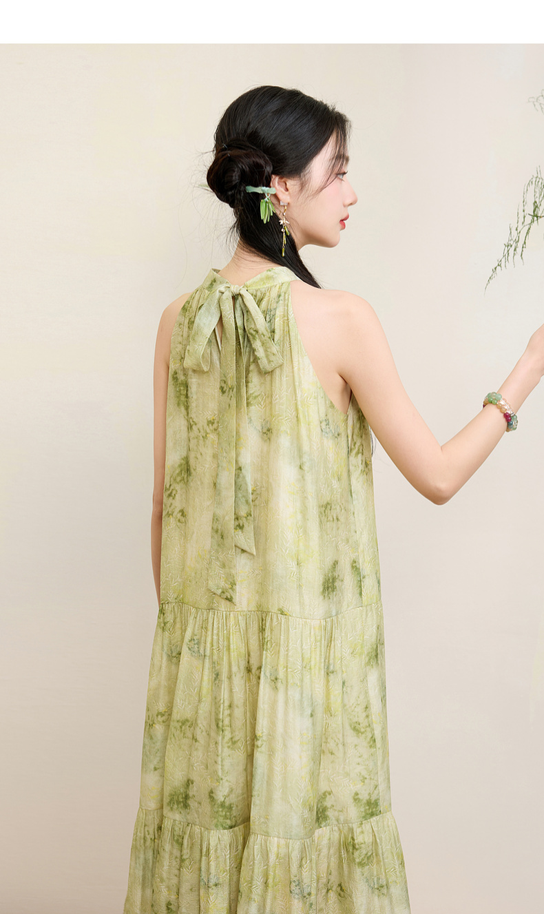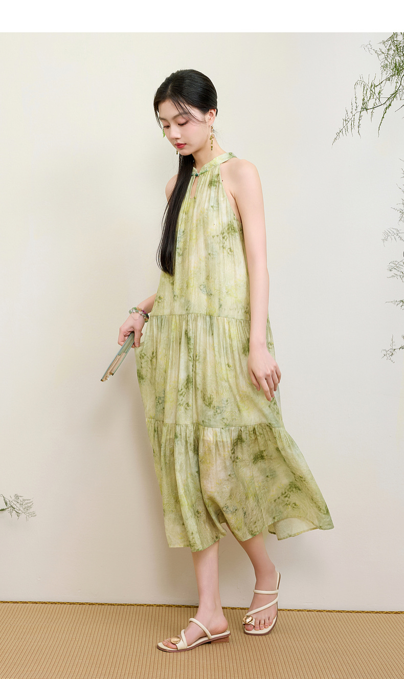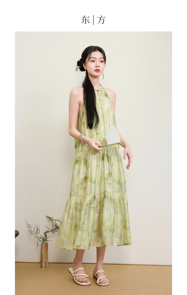 三彩【一念清心】2025夏新款新中式挂脖连衣裙印花大摆宽松长裙C