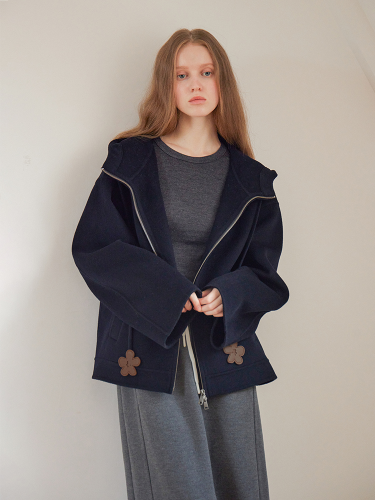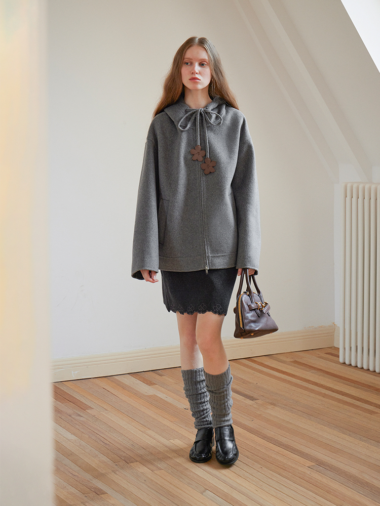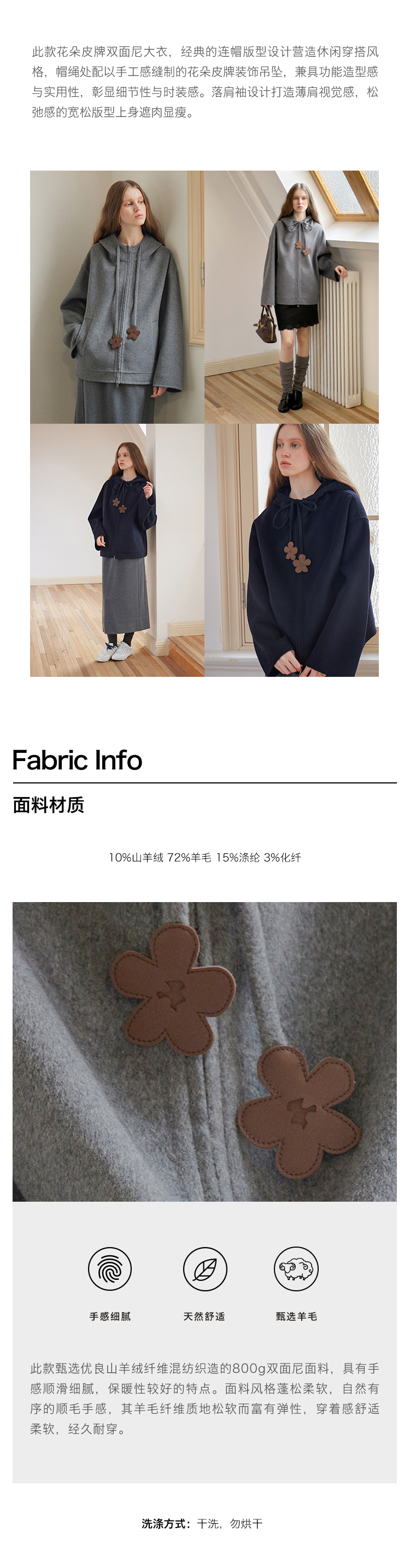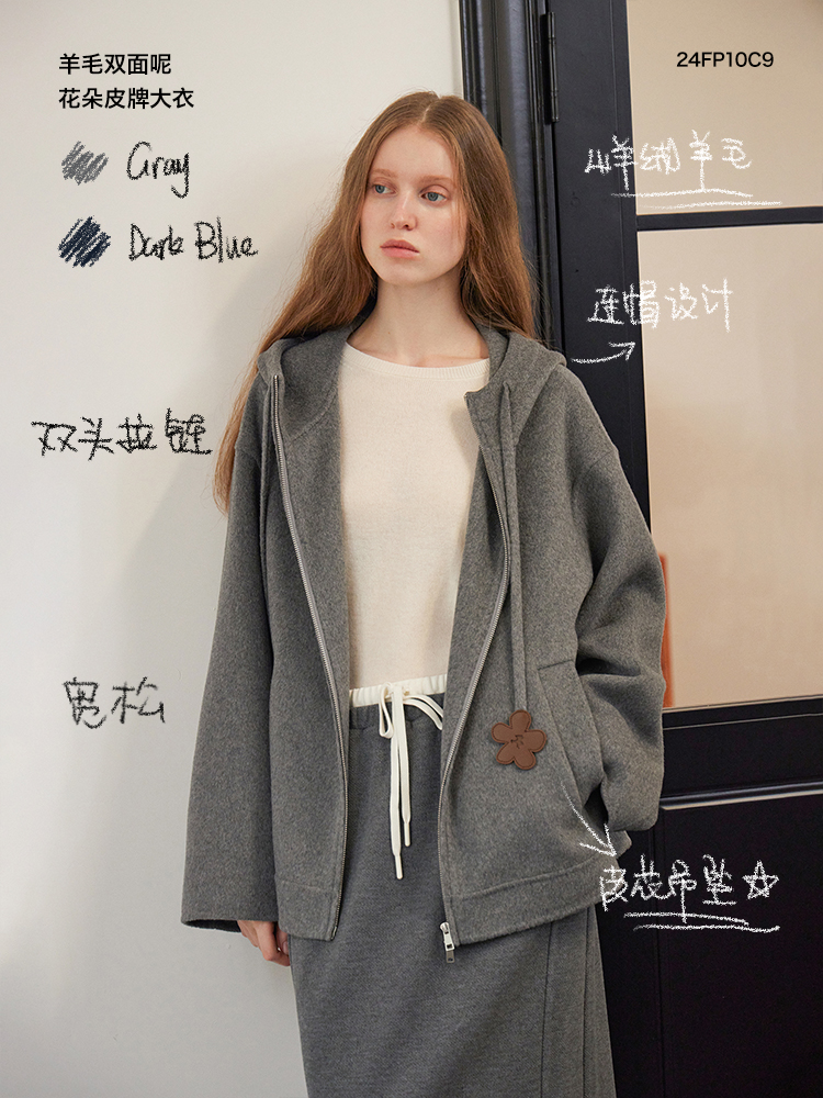 ForPoem 24/FW原创设计羊绒羊毛花朵皮牌连帽拉链休闲双面尼大衣