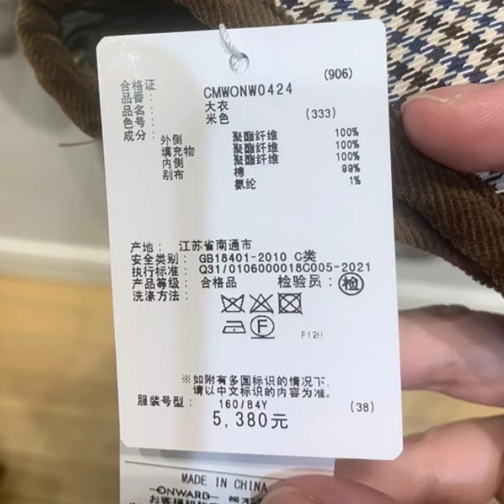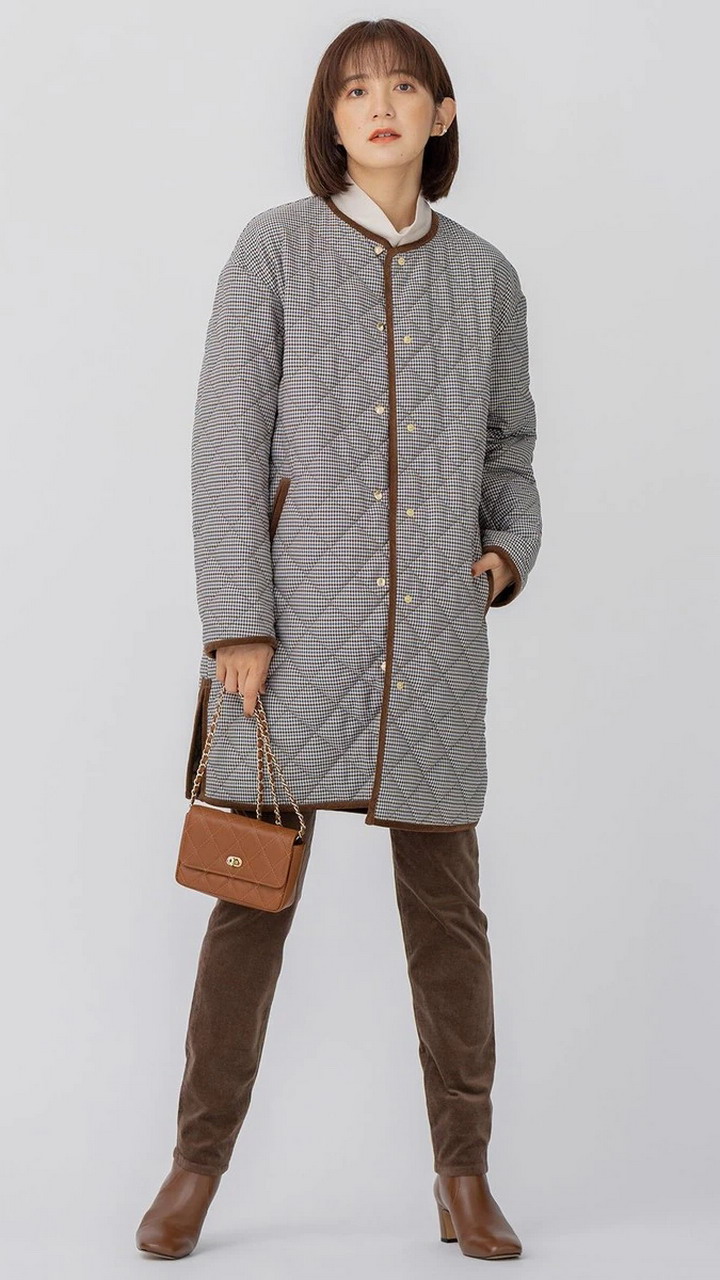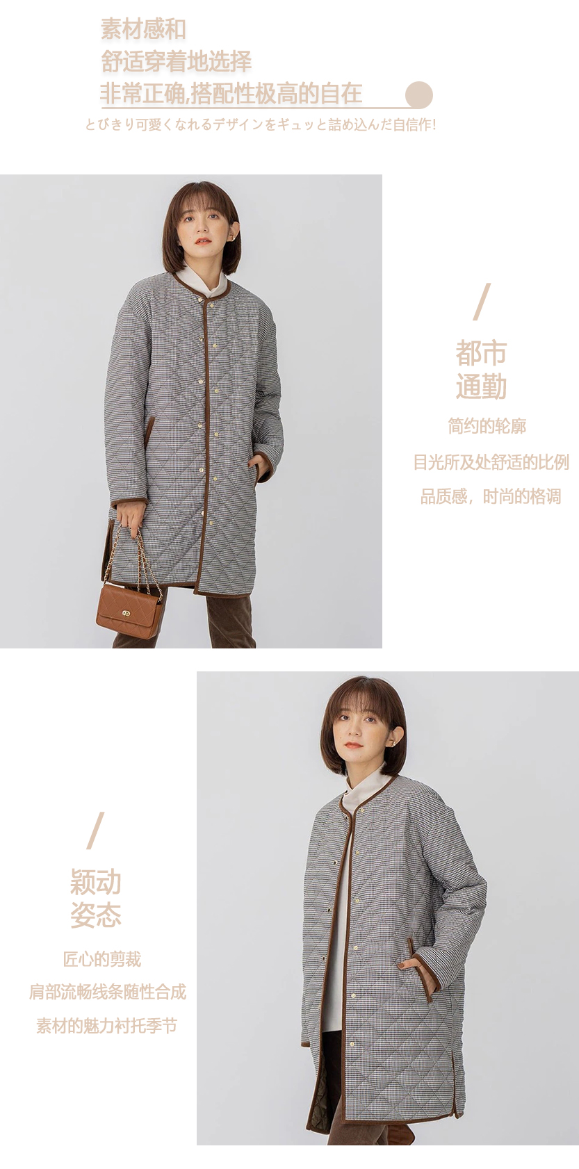 23区日系秋冬季通勤宽松款圆领中长款棉衣千鸟格厚棉袄商场同款