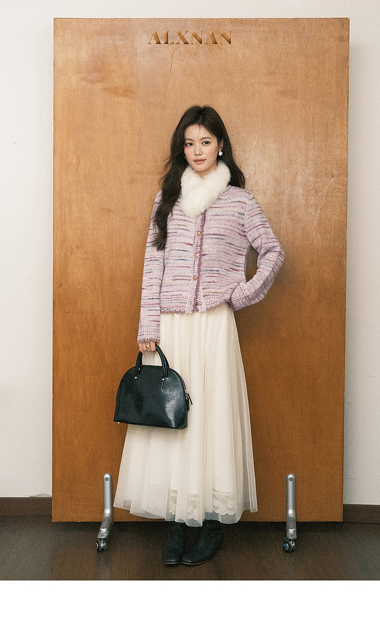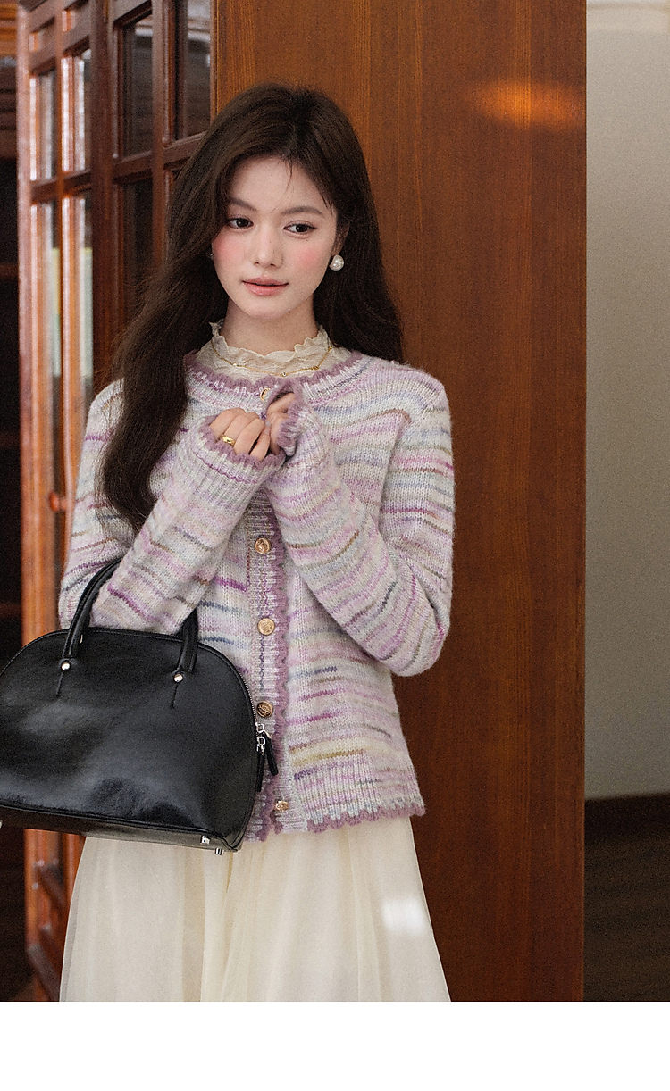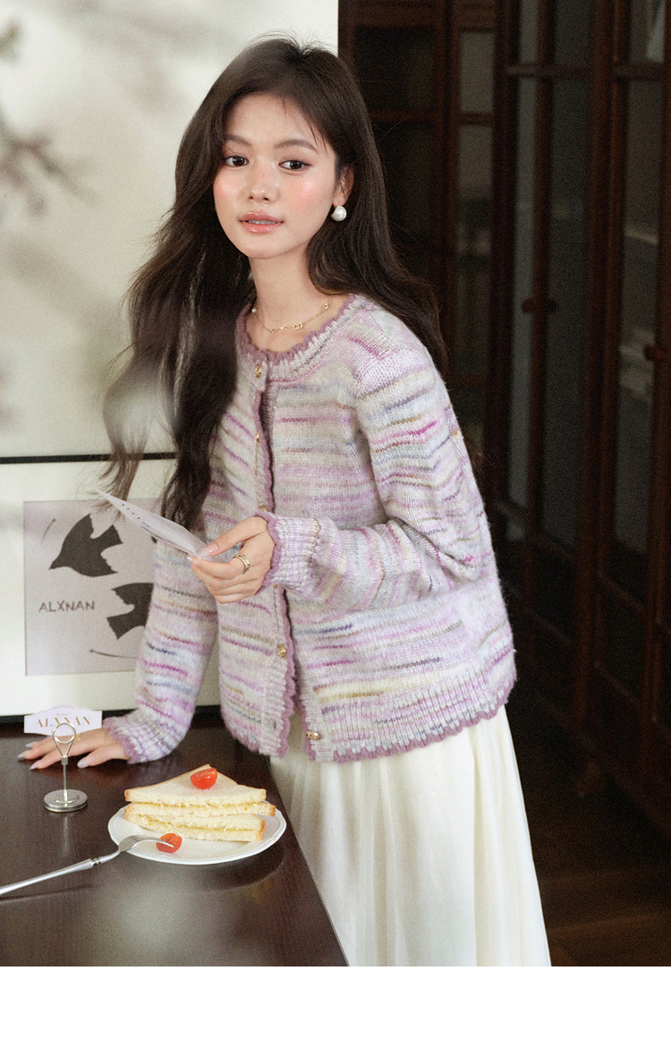 鹿向南「缎带情书」小香风条纹紫色圆领针织毛衣女秋季巨显瘦上衣L59007