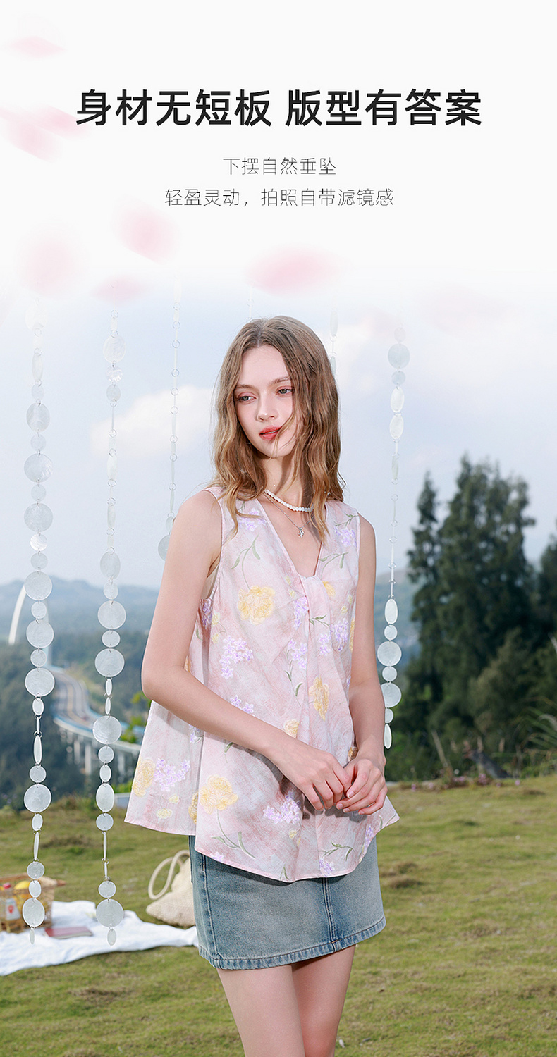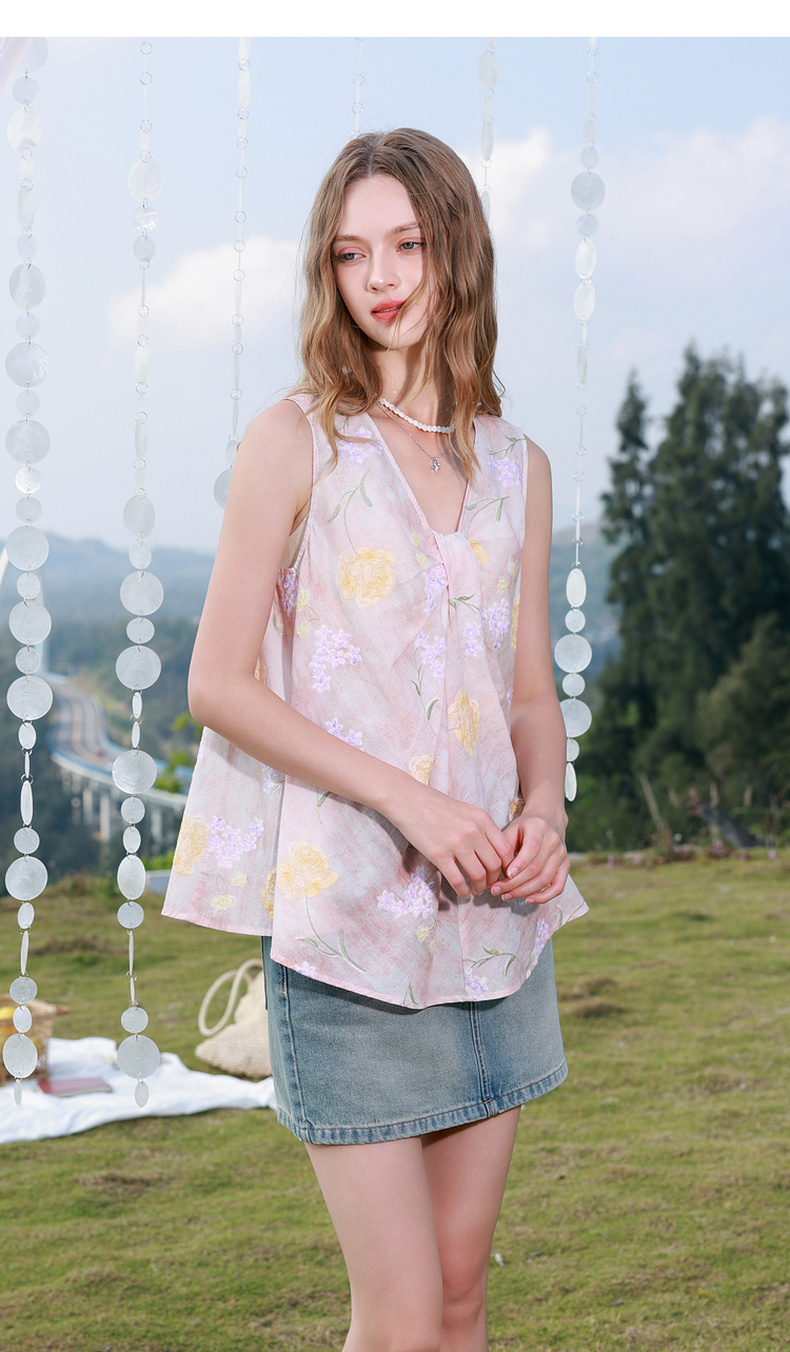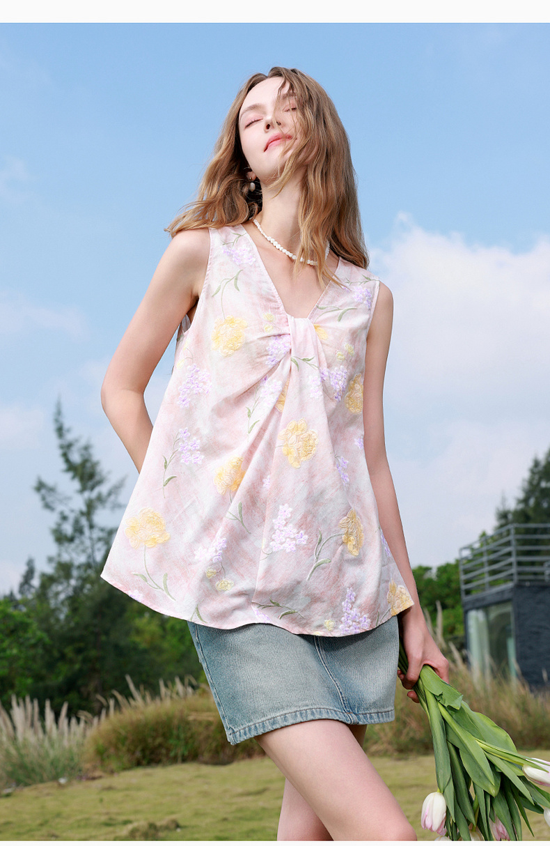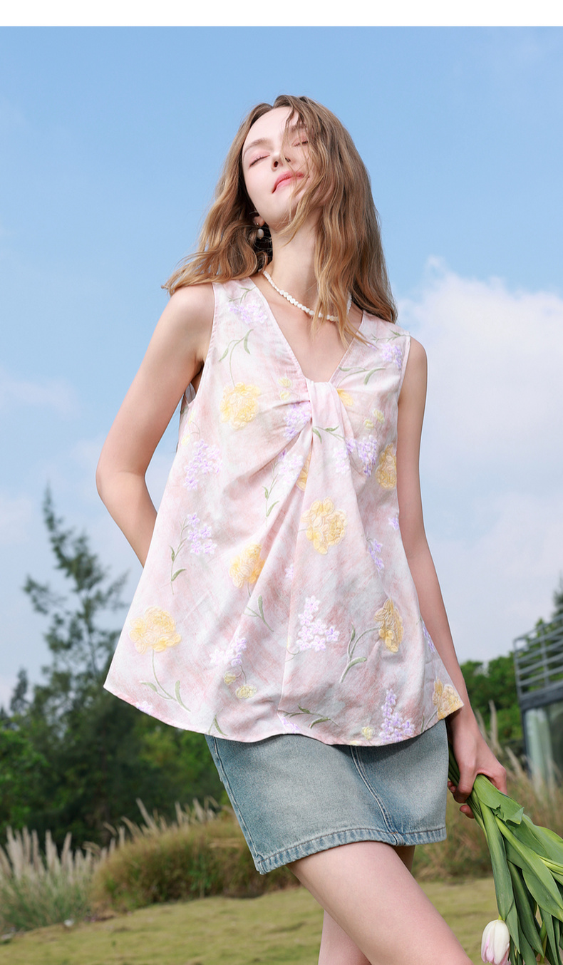 【100棉】三彩2026春季新款V领印花绣花小衫衬衣宽松娃娃衫M