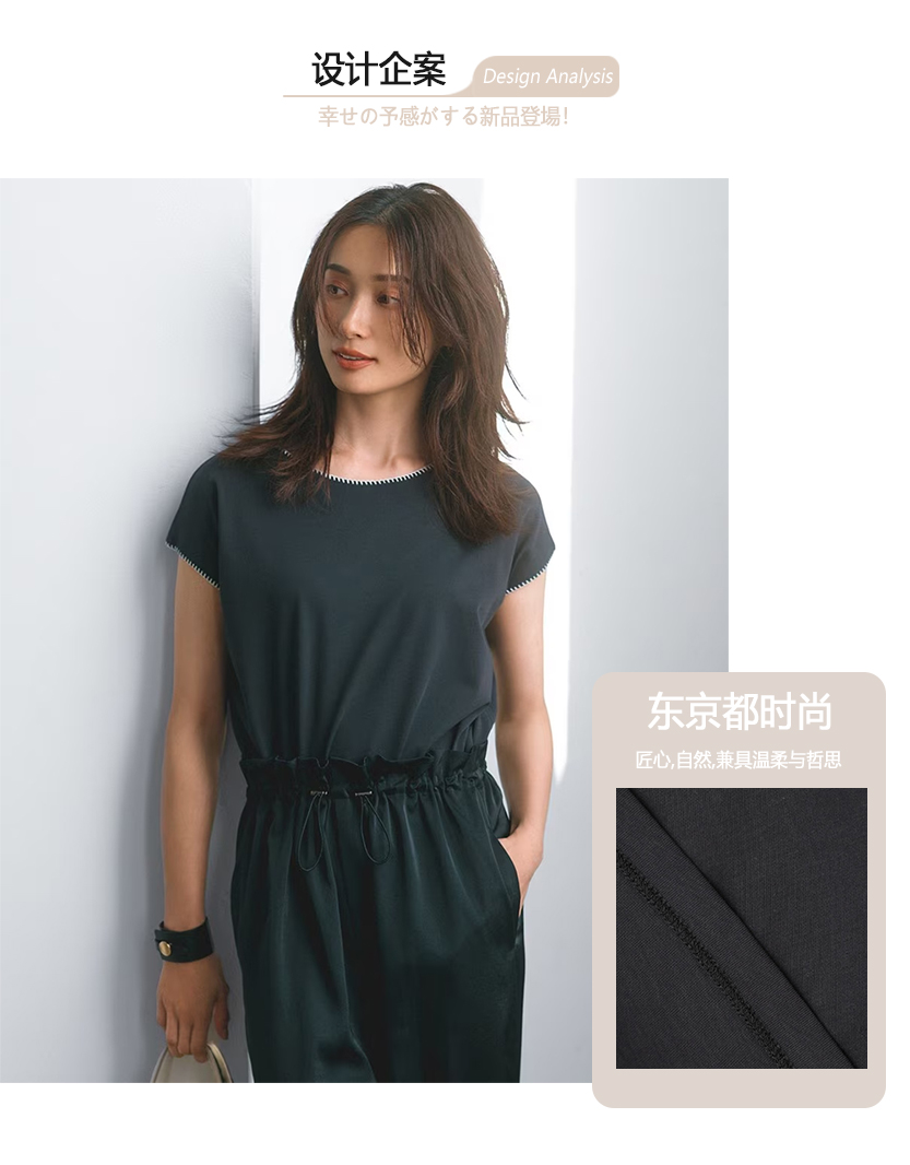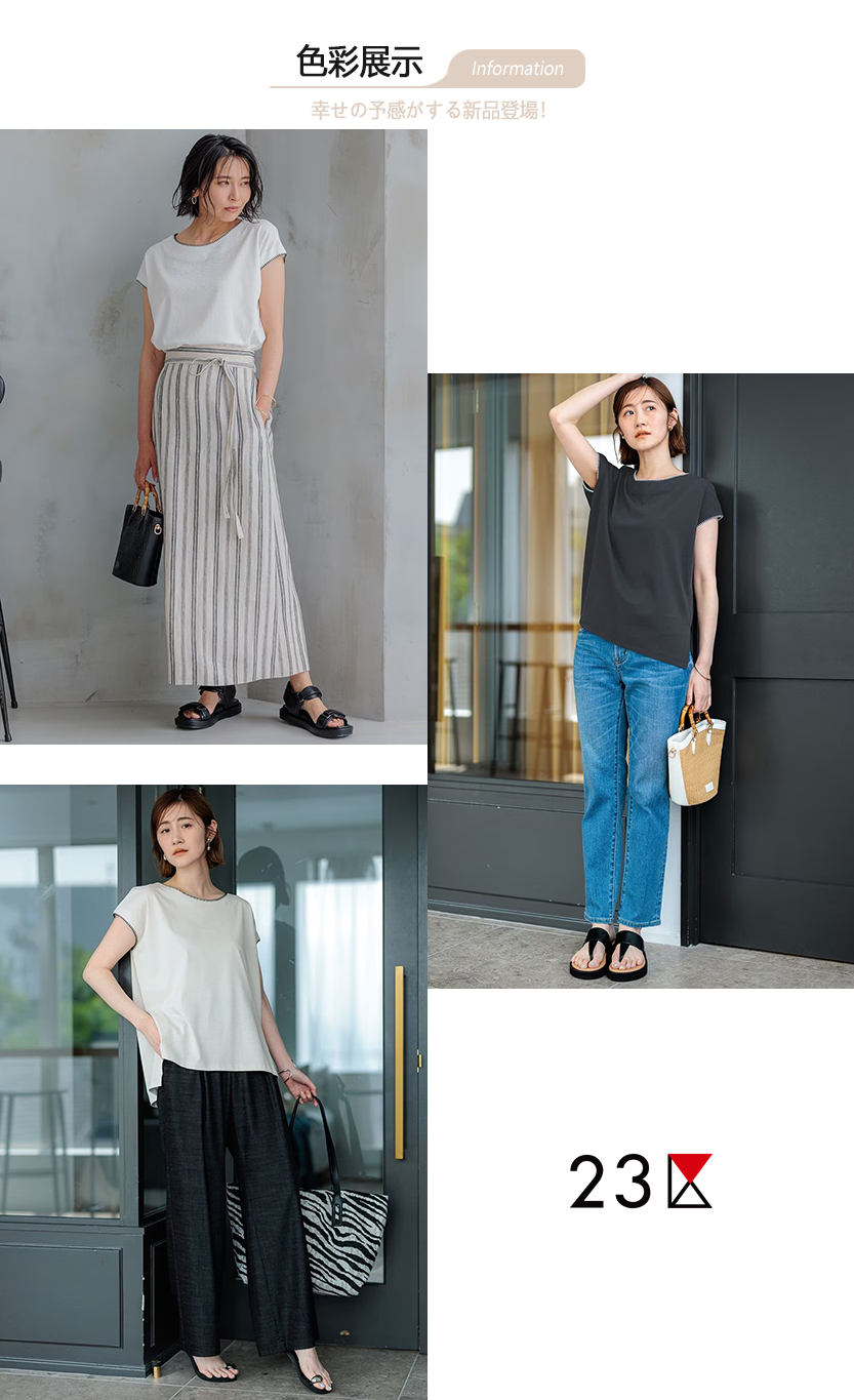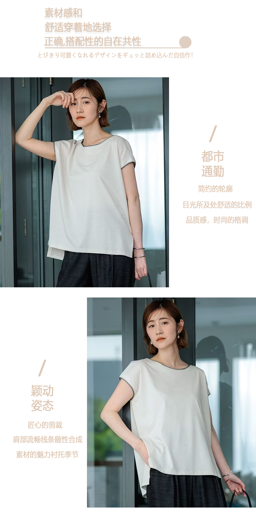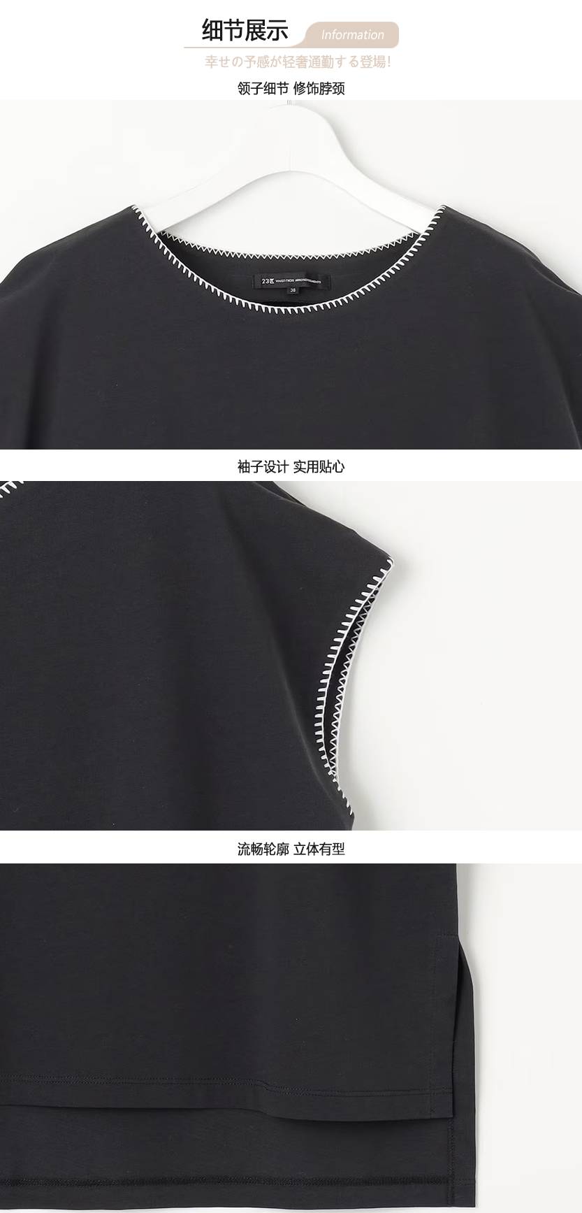 23区日系春季通勤宽松棉镶边圆领套头短袖T恤内搭针织衫商场同款