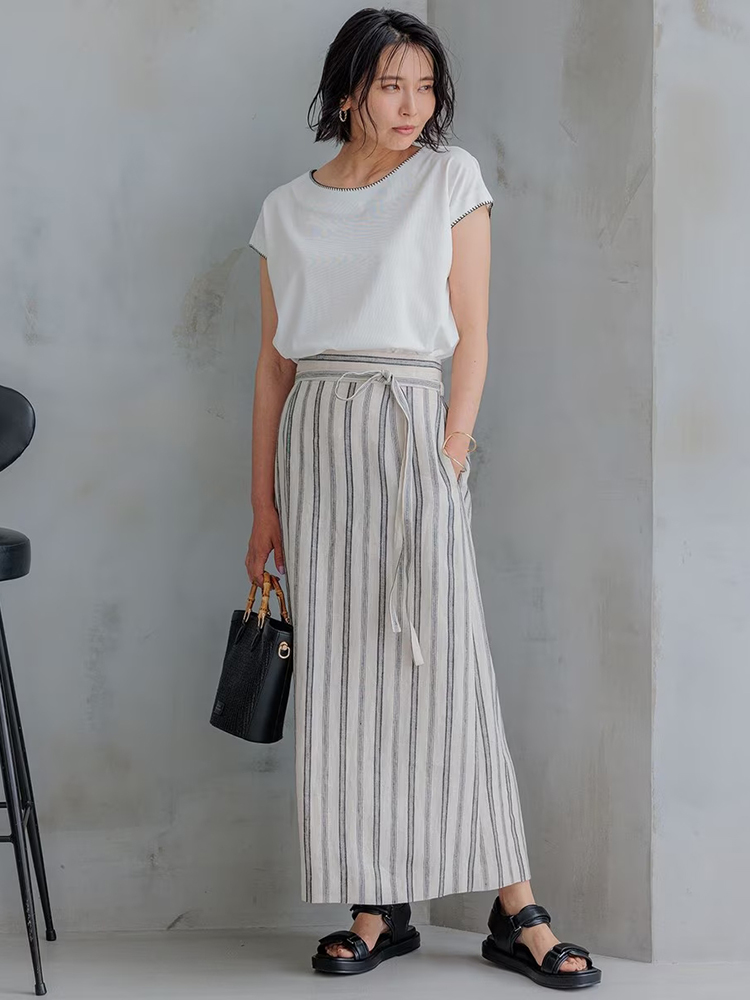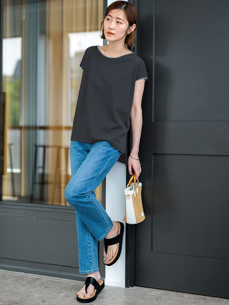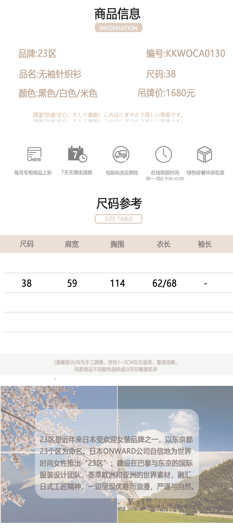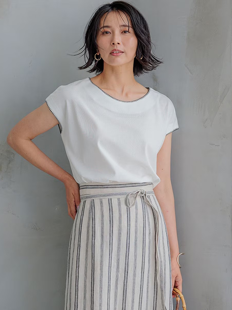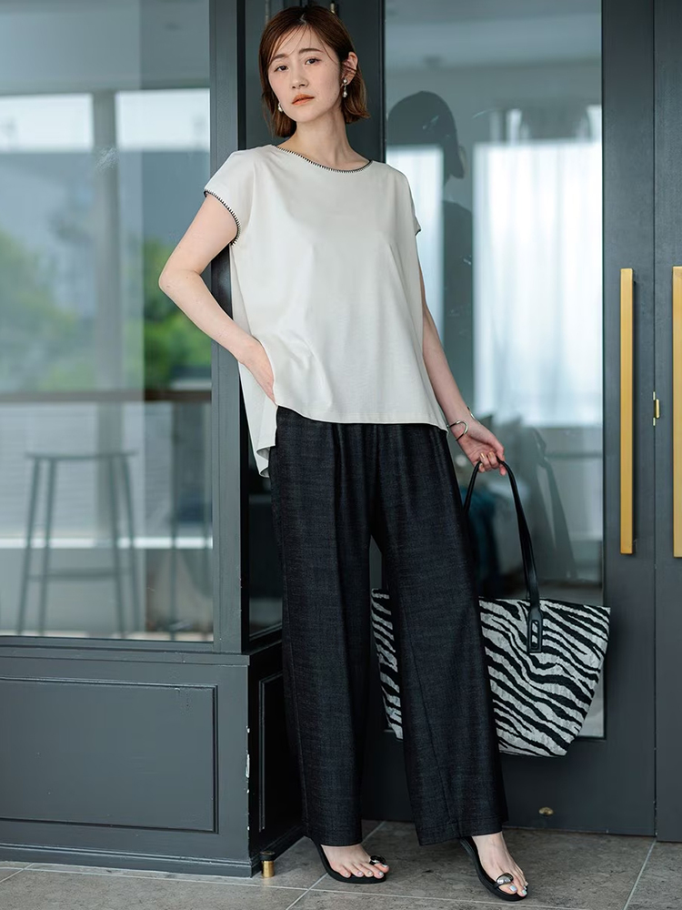 23区日系春季通勤宽松棉镶边圆领套头短袖T恤内搭针织衫商场同款