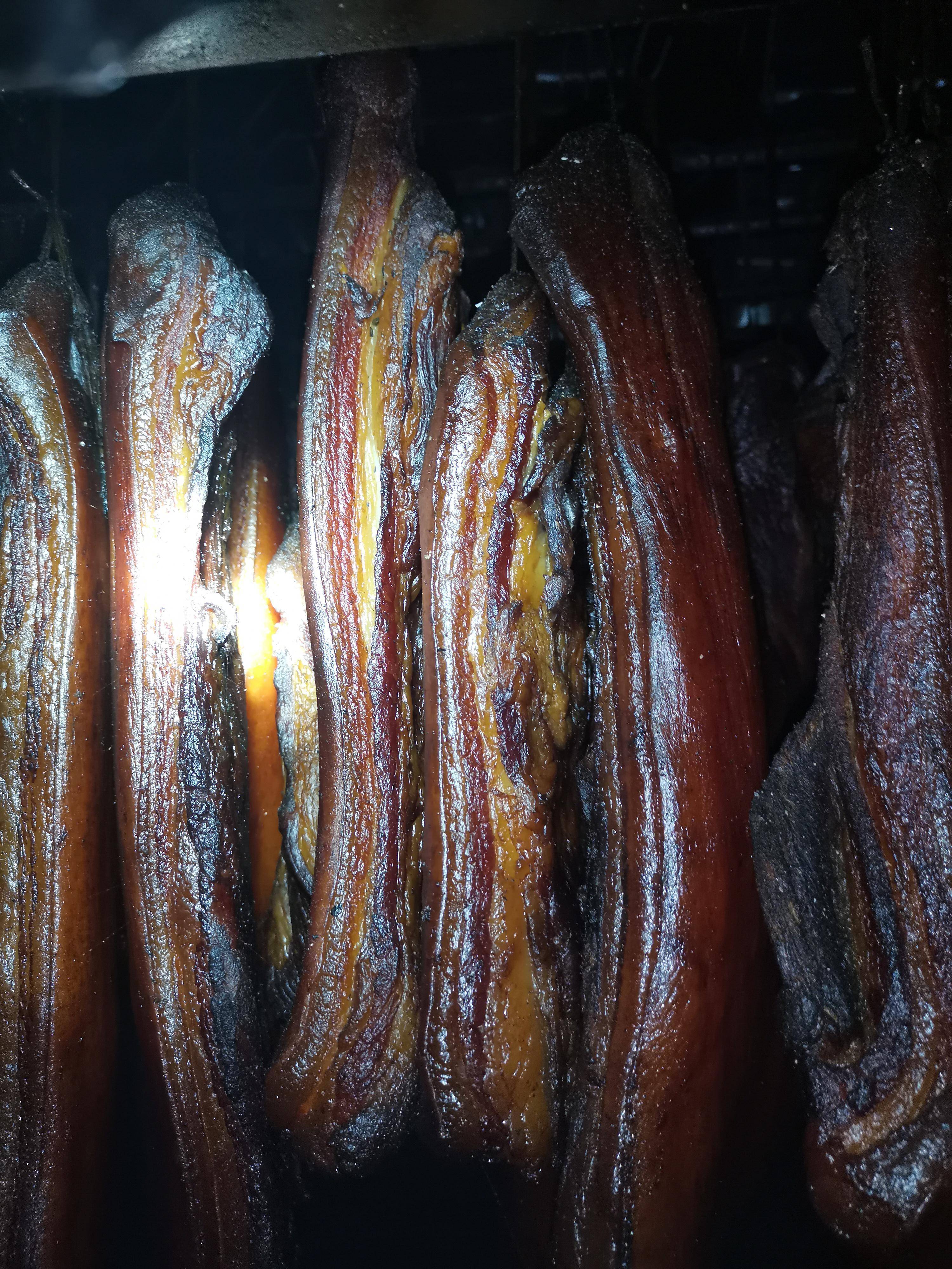 ①选用新鲜屠宰的土猪肉,拒绝冻肉。将鲜肉分部位,砍成八九上十斤不等重量的长条