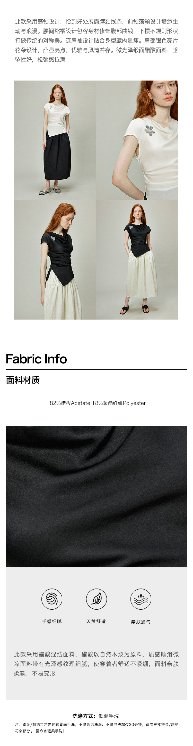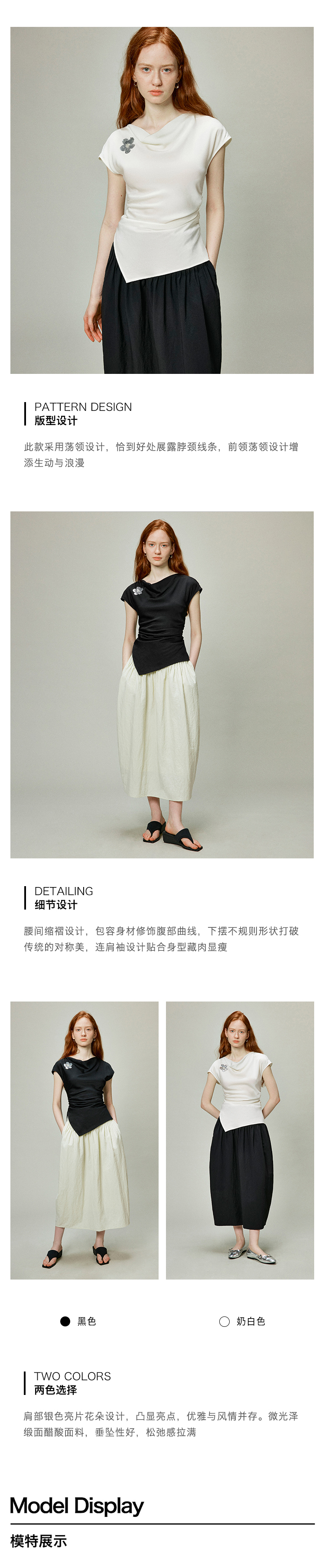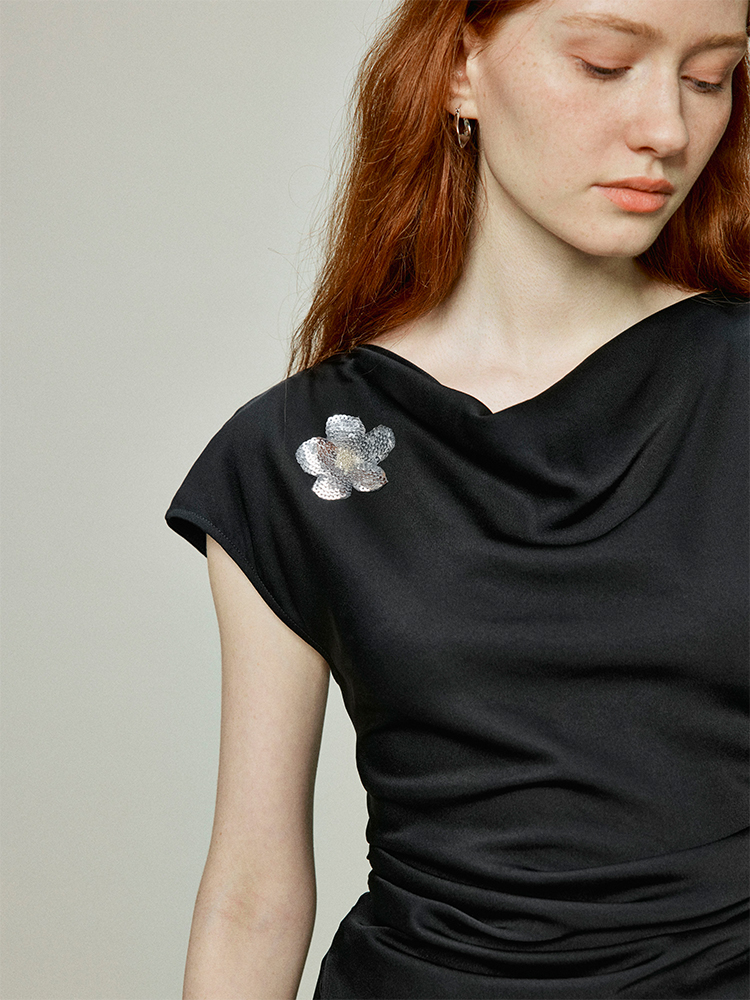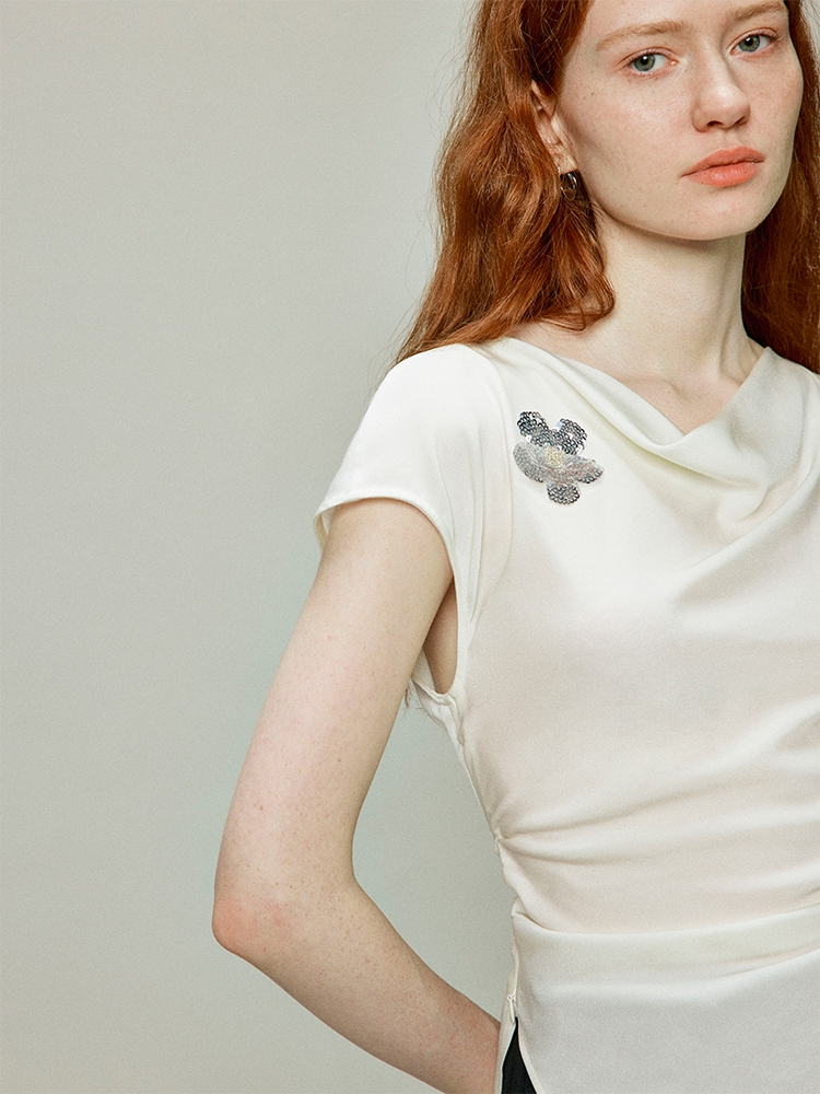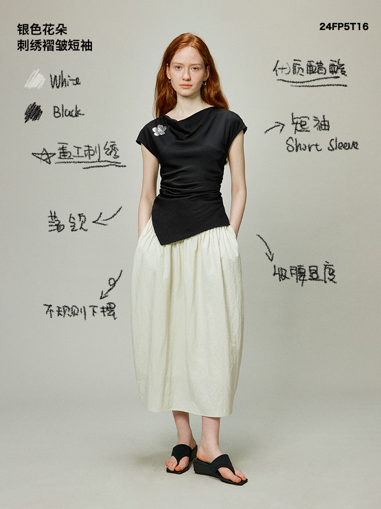 ForPoem 现货 24/SS夏季花朵系列醋酸荡领银色花朵刺绣收腰褶皱短袖