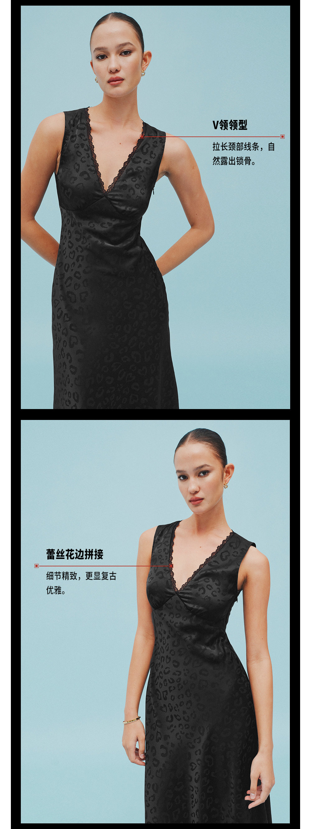 TR她热 优雅黑豹 黑色豹纹暗纹缎面花边斜裁法式V领修身背心连衣裙