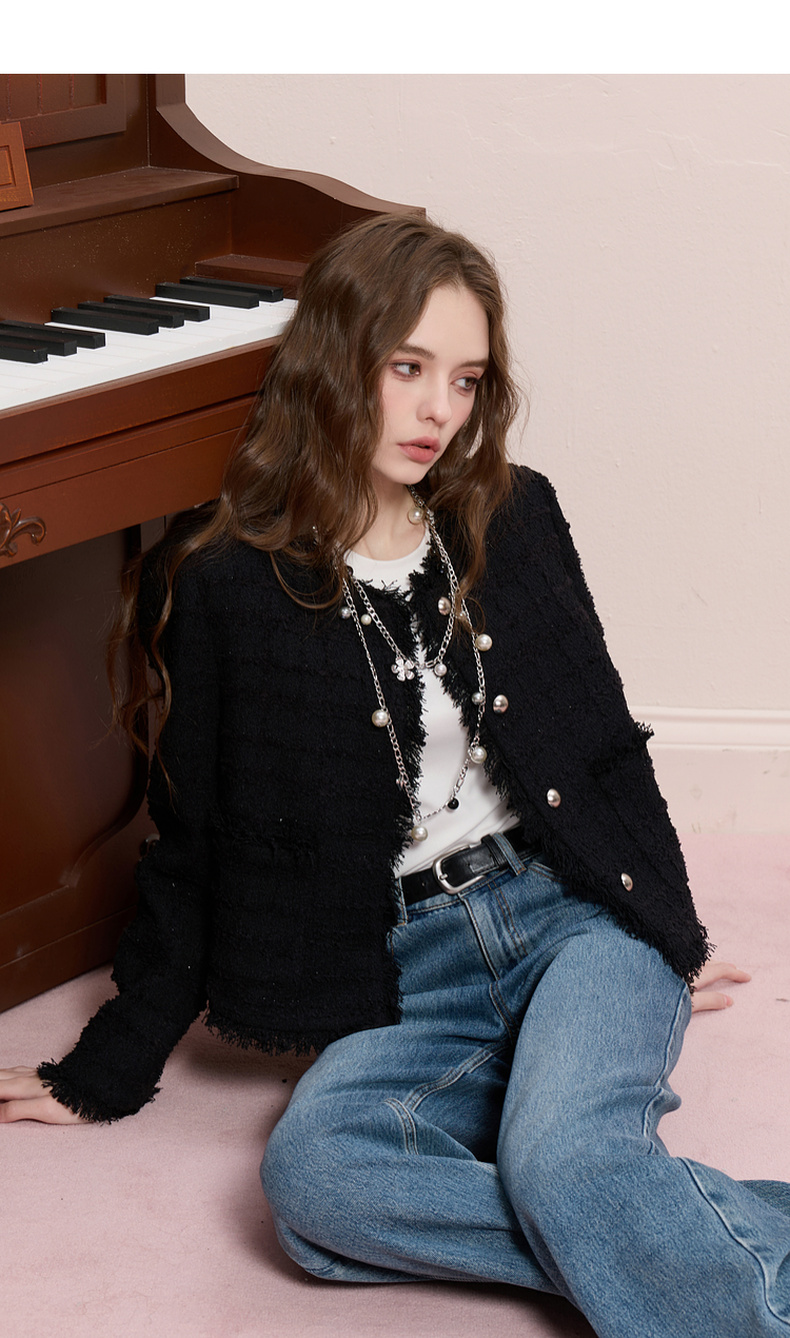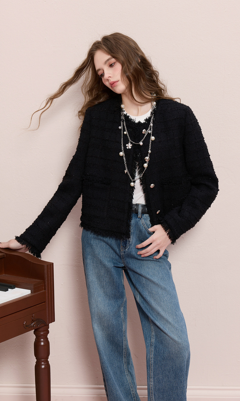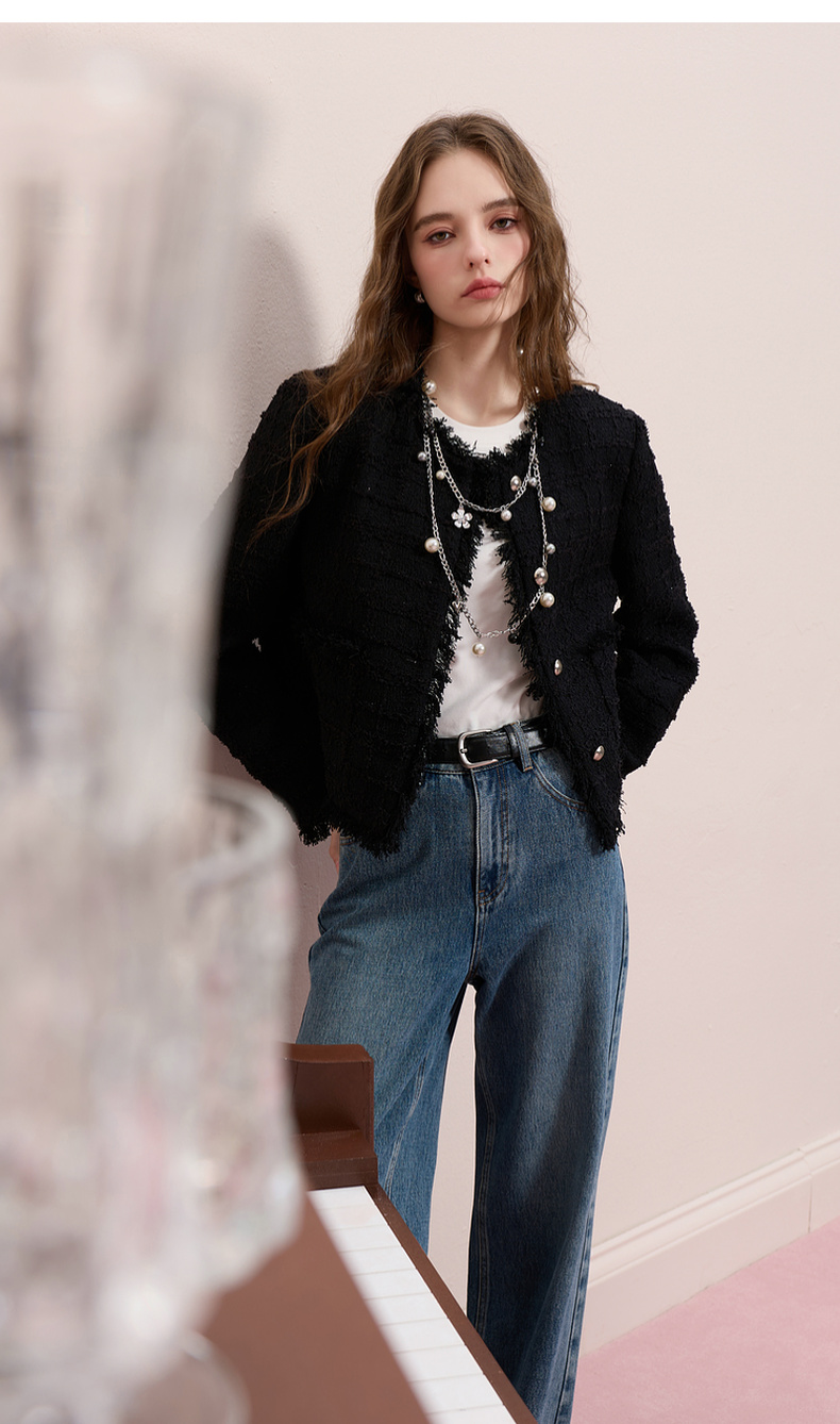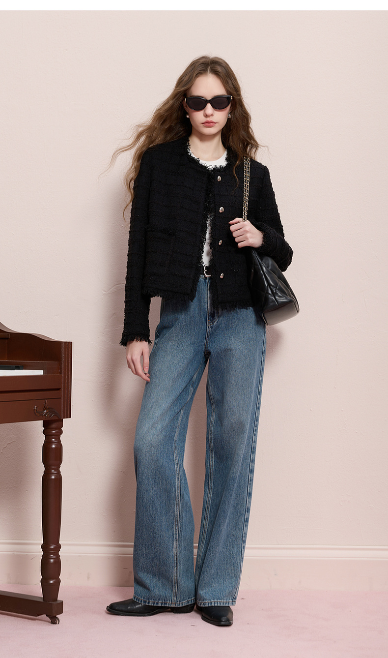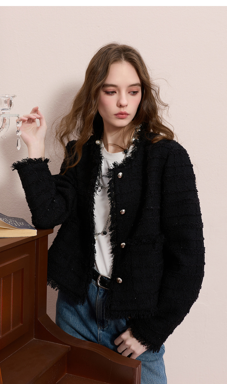 三彩2025冬季新款香风毛呢外套拉毛圆领短款大衣优雅M