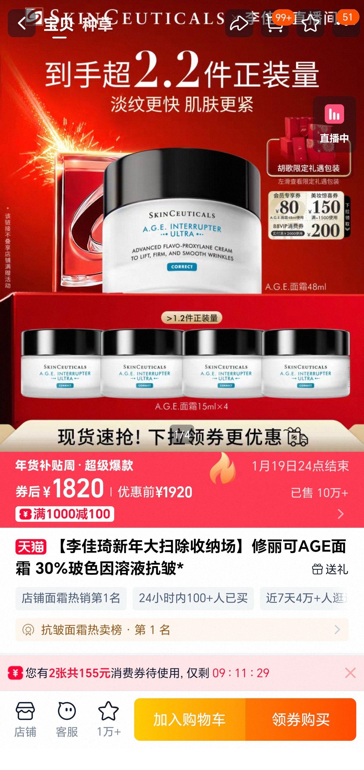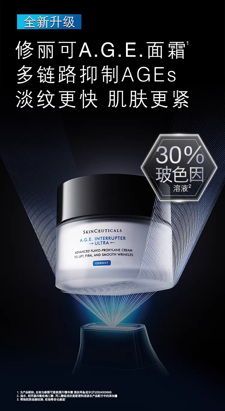 淘宝销量10万修丽可面霜,胡歌代言,全新修丽可A.G.E.面霜,全链路抗糖,淡纹更快,轮廓更紧致,66大玻色因相关专利,30%玻色因溶液,一件正装,七件小样,黑色迷你斜跨饺子包,相当于两件多正装的容量,黑银礼盒装更适合送人。新年礼物。