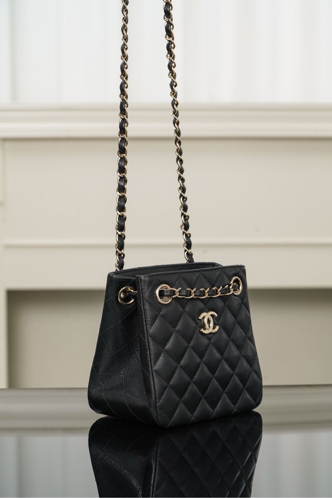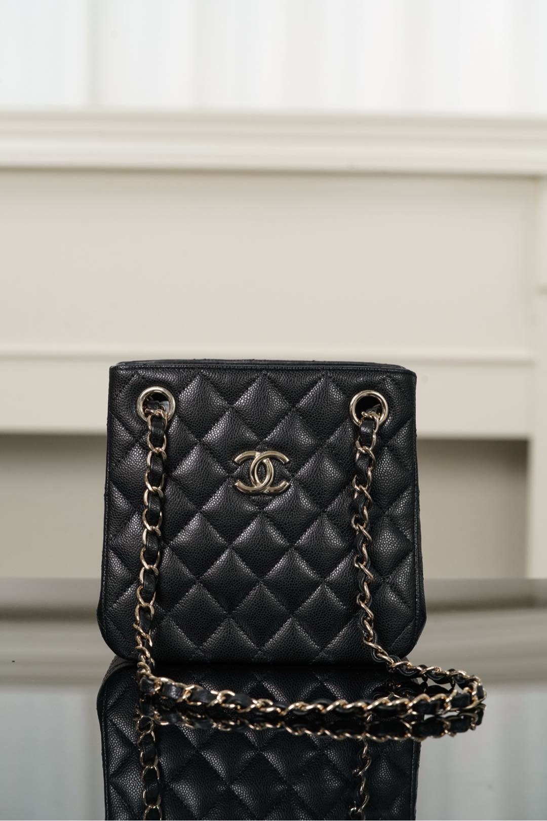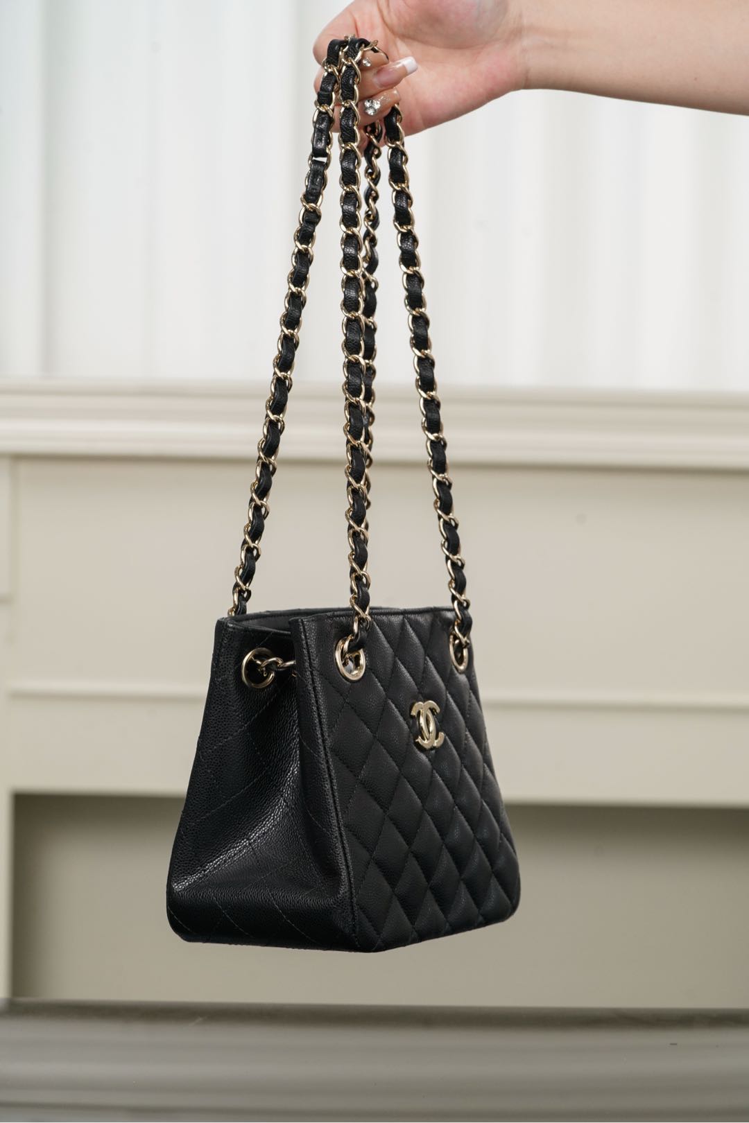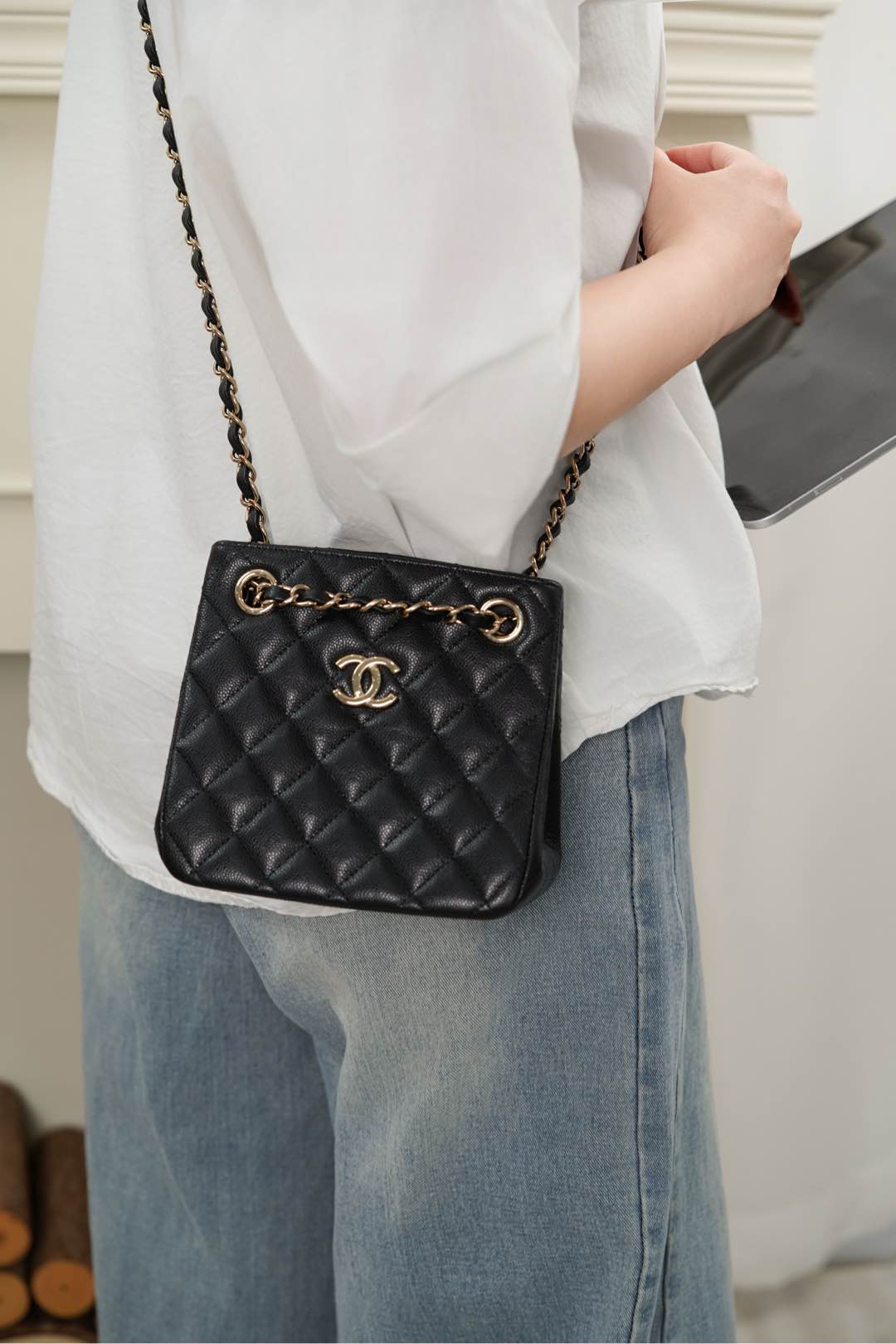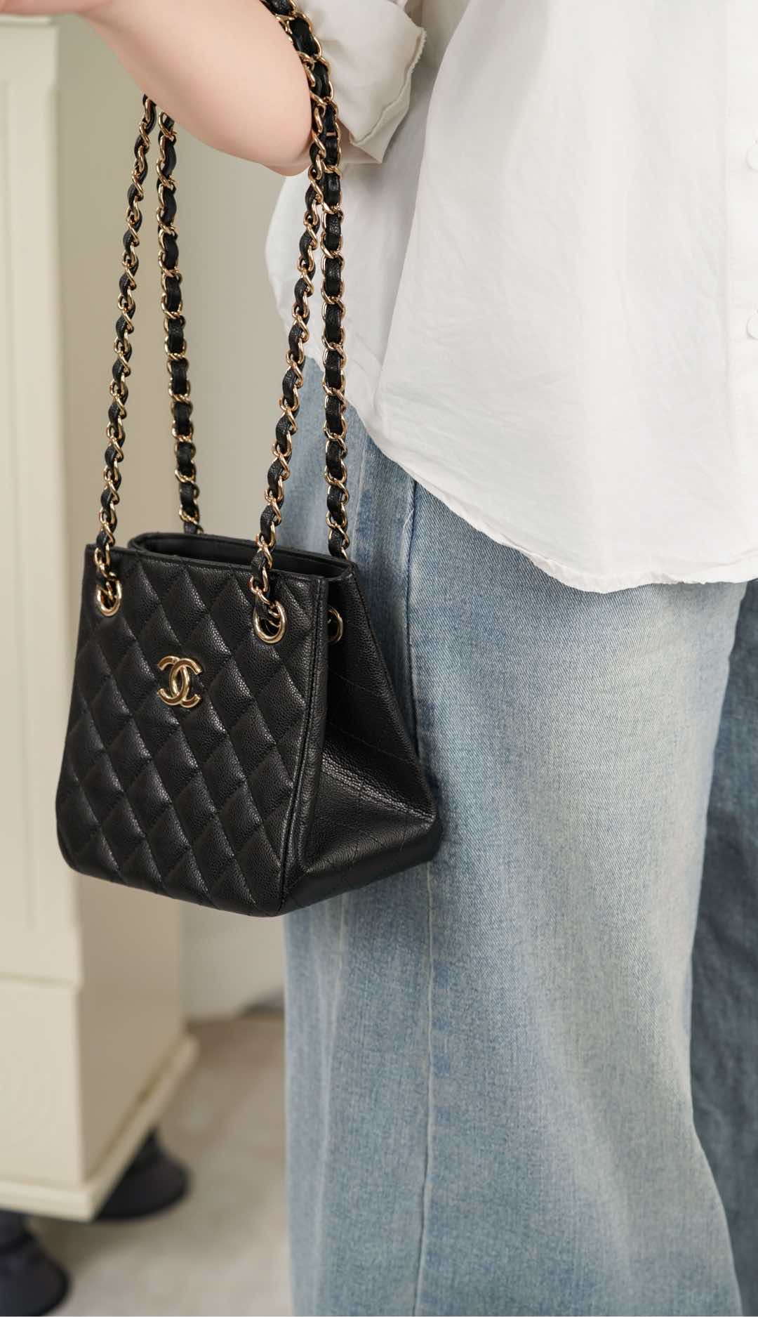 链条调节可单肩、可斜挎、可手拎~ 通勤出行都合适、目前没有发现任何缺点🥹! 空间也很能装、𝐩𝐥𝐮𝐬斜着放可以装得下!可收口设计; 是一只尺寸和颜值都很在线的小水桶👜!上身很气质优雅✨ 专柜超超超难买✖️推荐推荐!