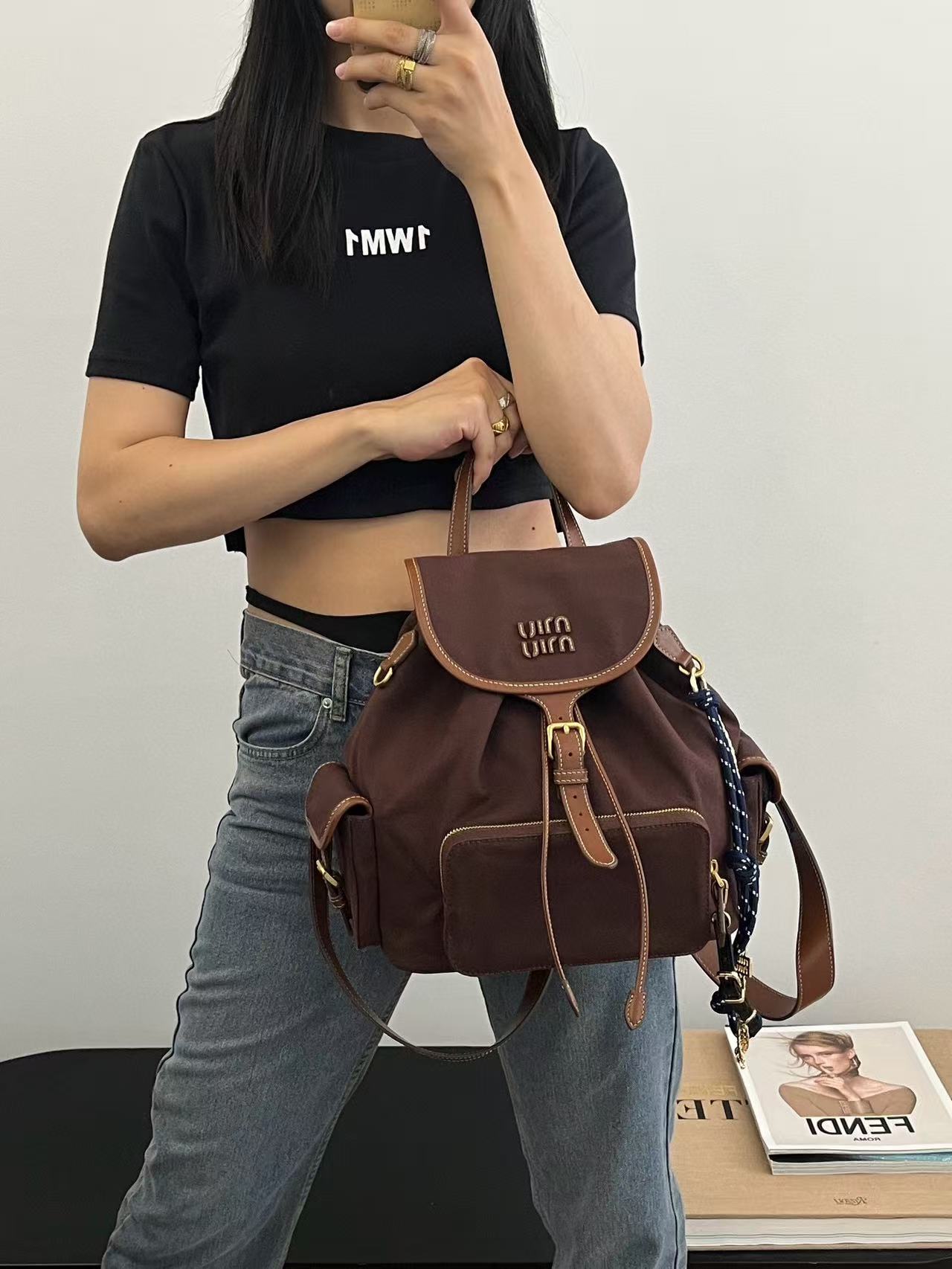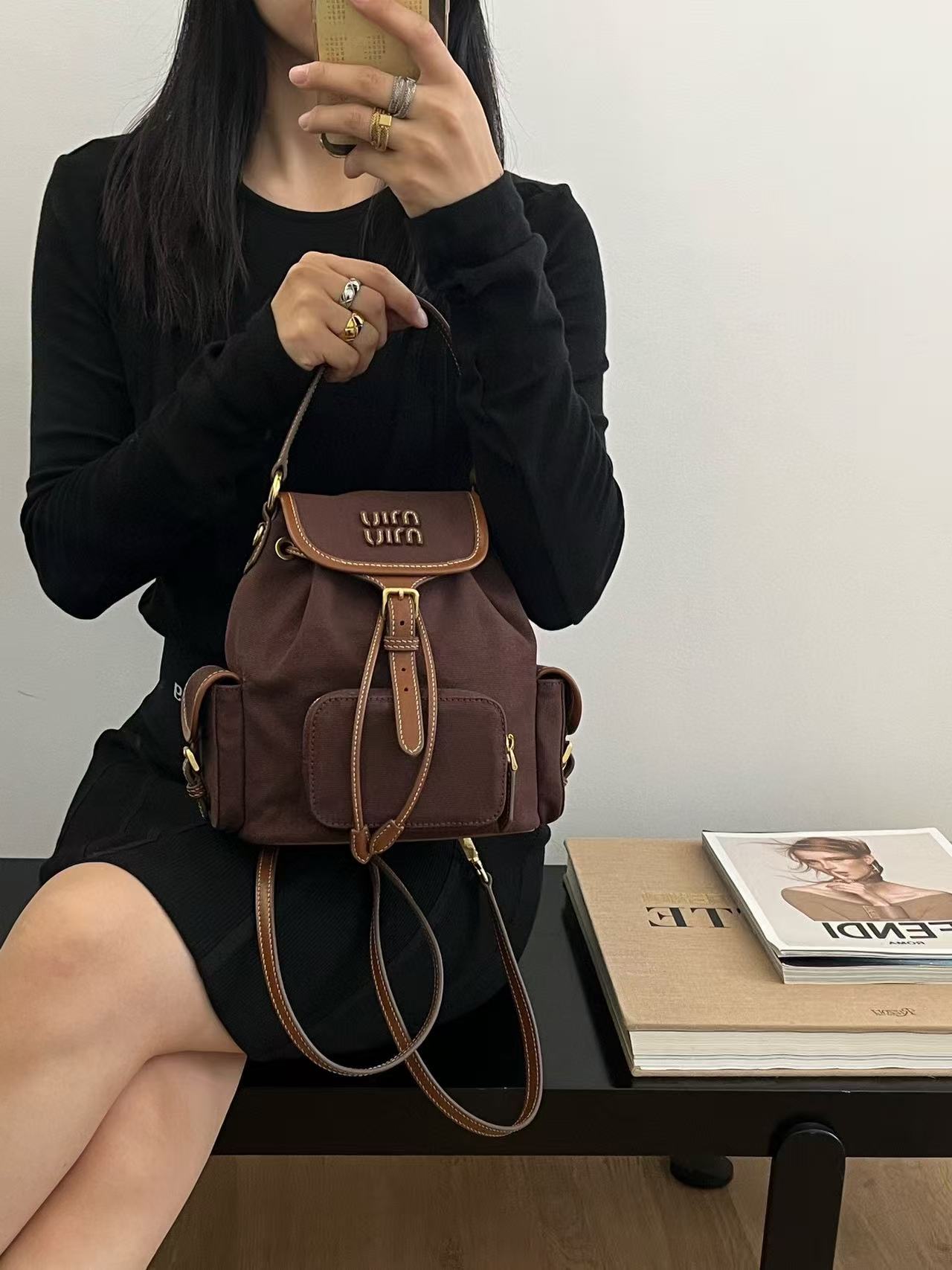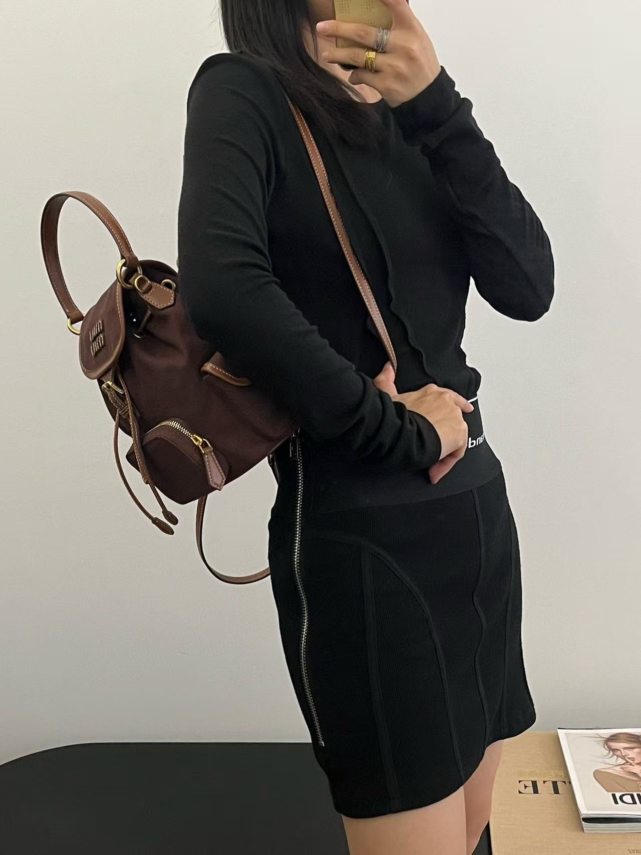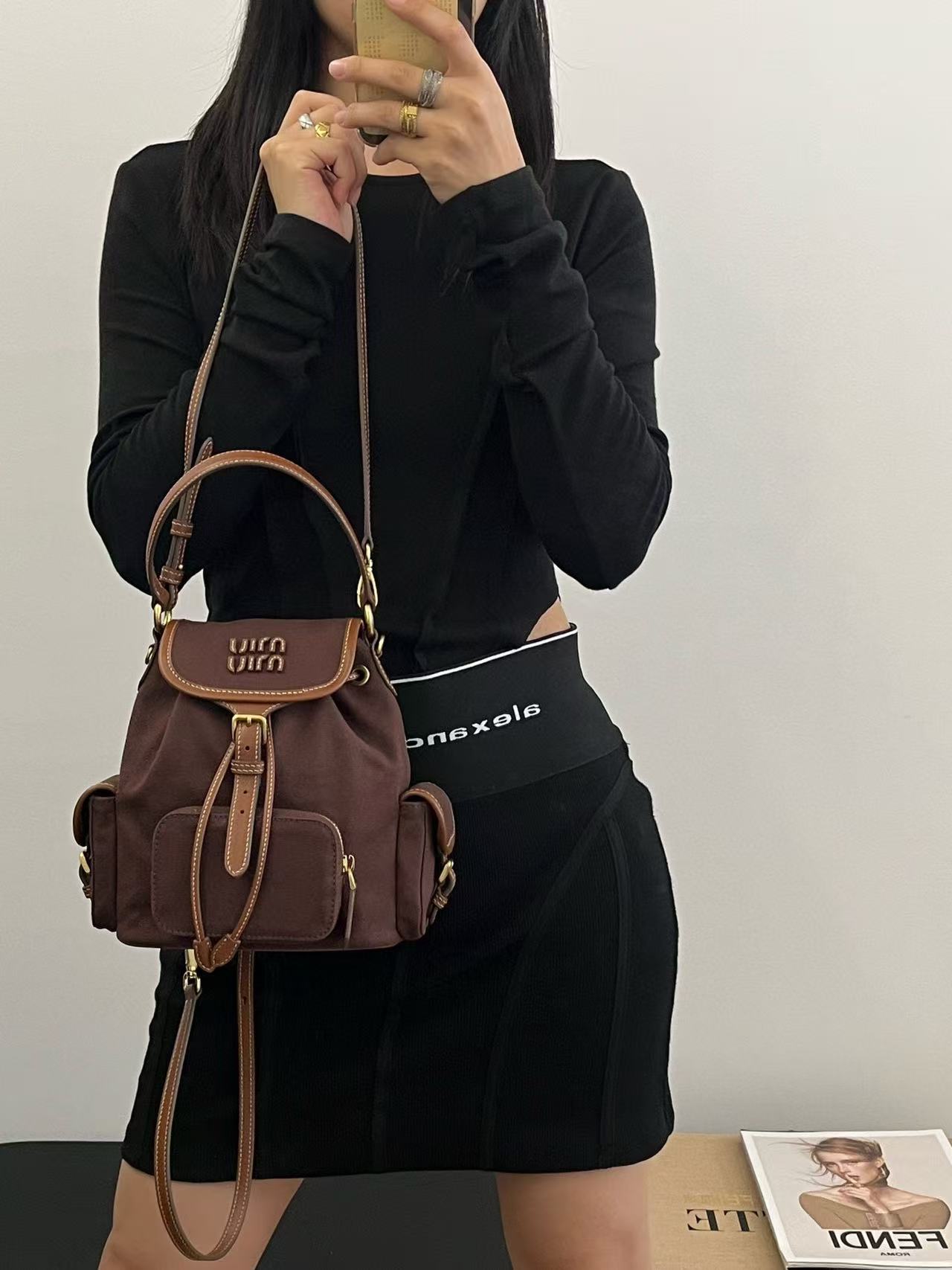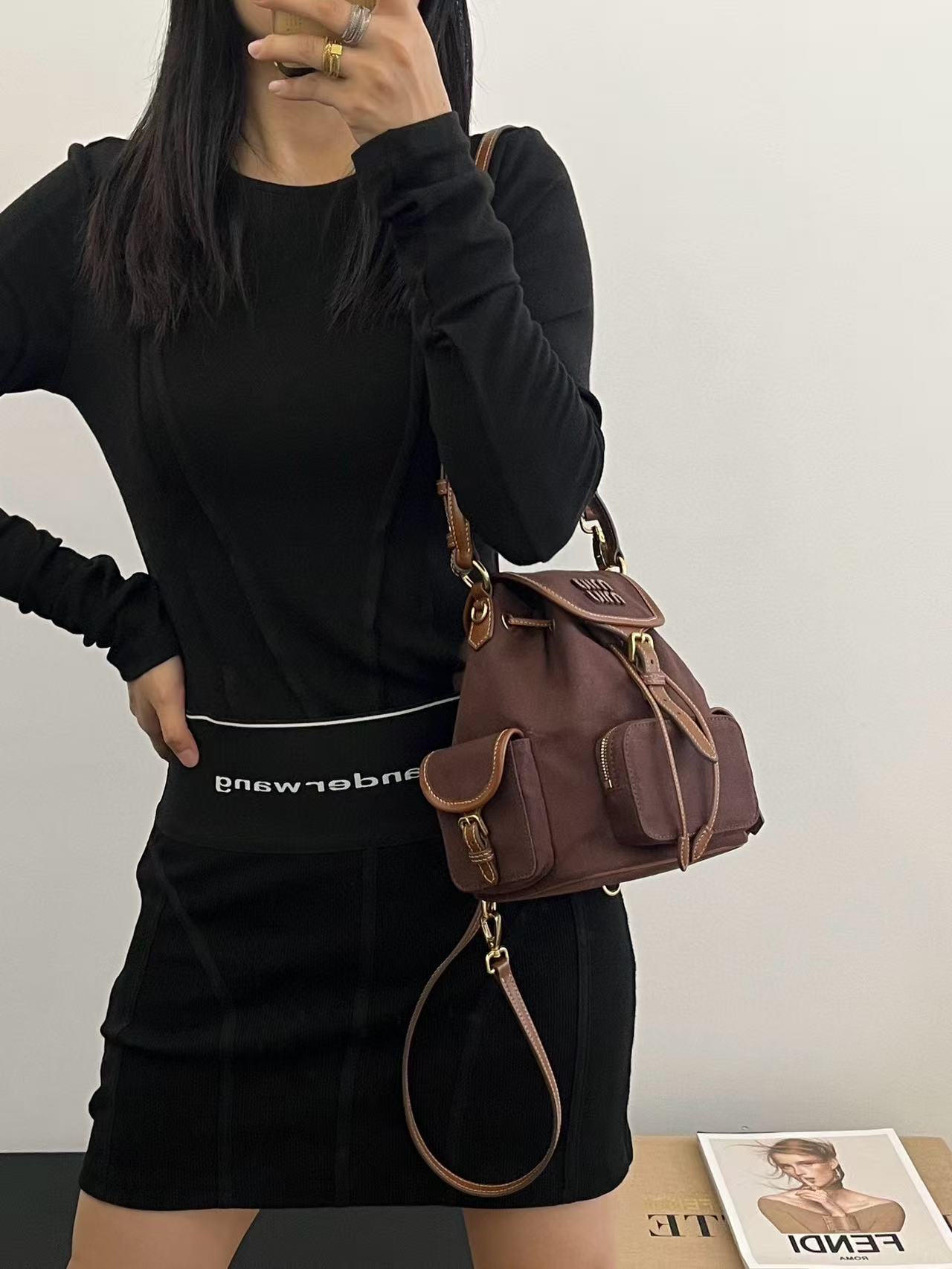 缪缪25ss春季爆火的帆布双肩包 石楠木色,棕色小牛皮搭配帆布的撞色设计,不要太出彩了,轻便又高级感十足,左右两个小口袋也太可爱了叭,手提肩背可随意转换,一包解锁各种风格,姐妹们,冲它不后悔!