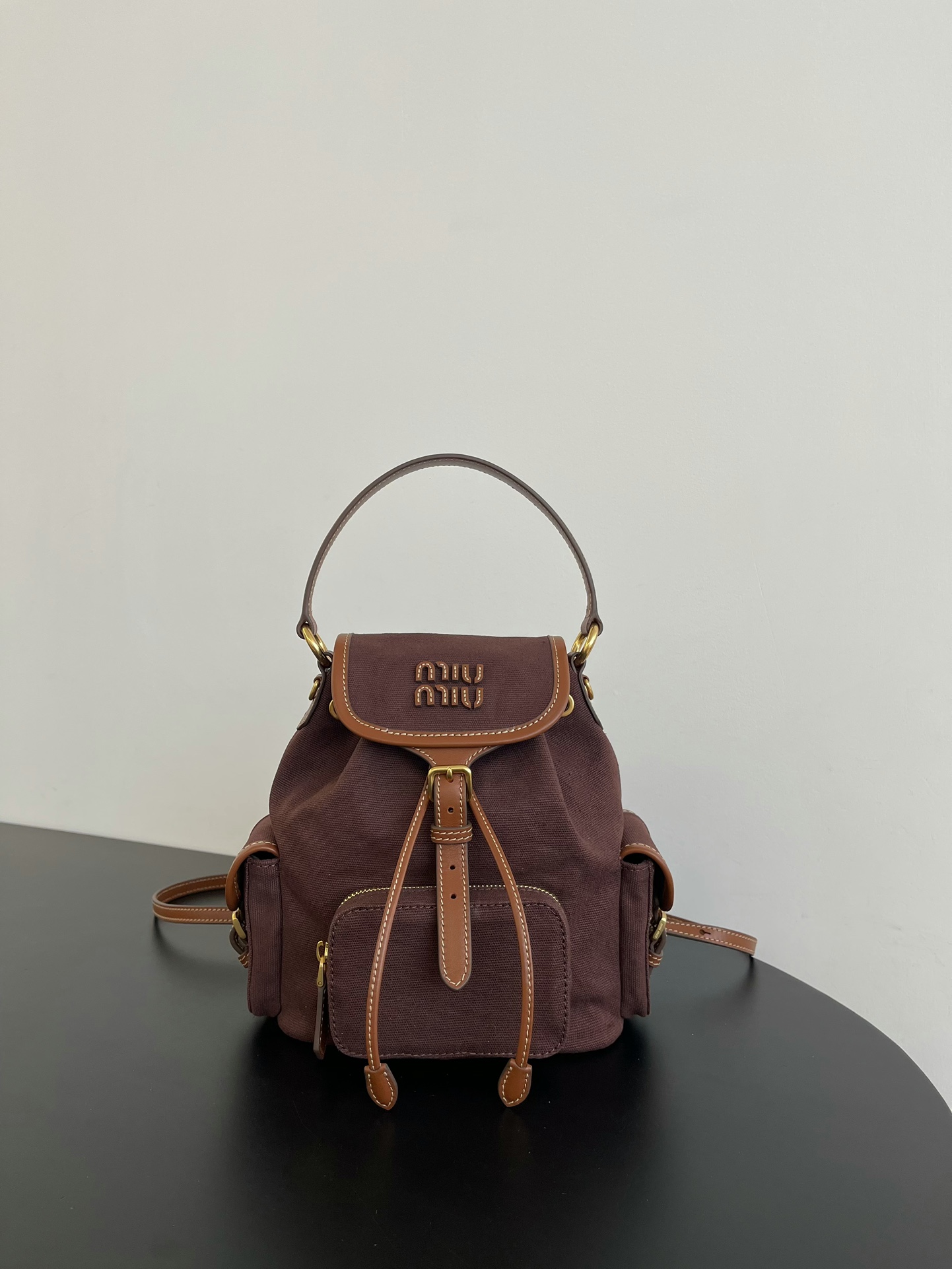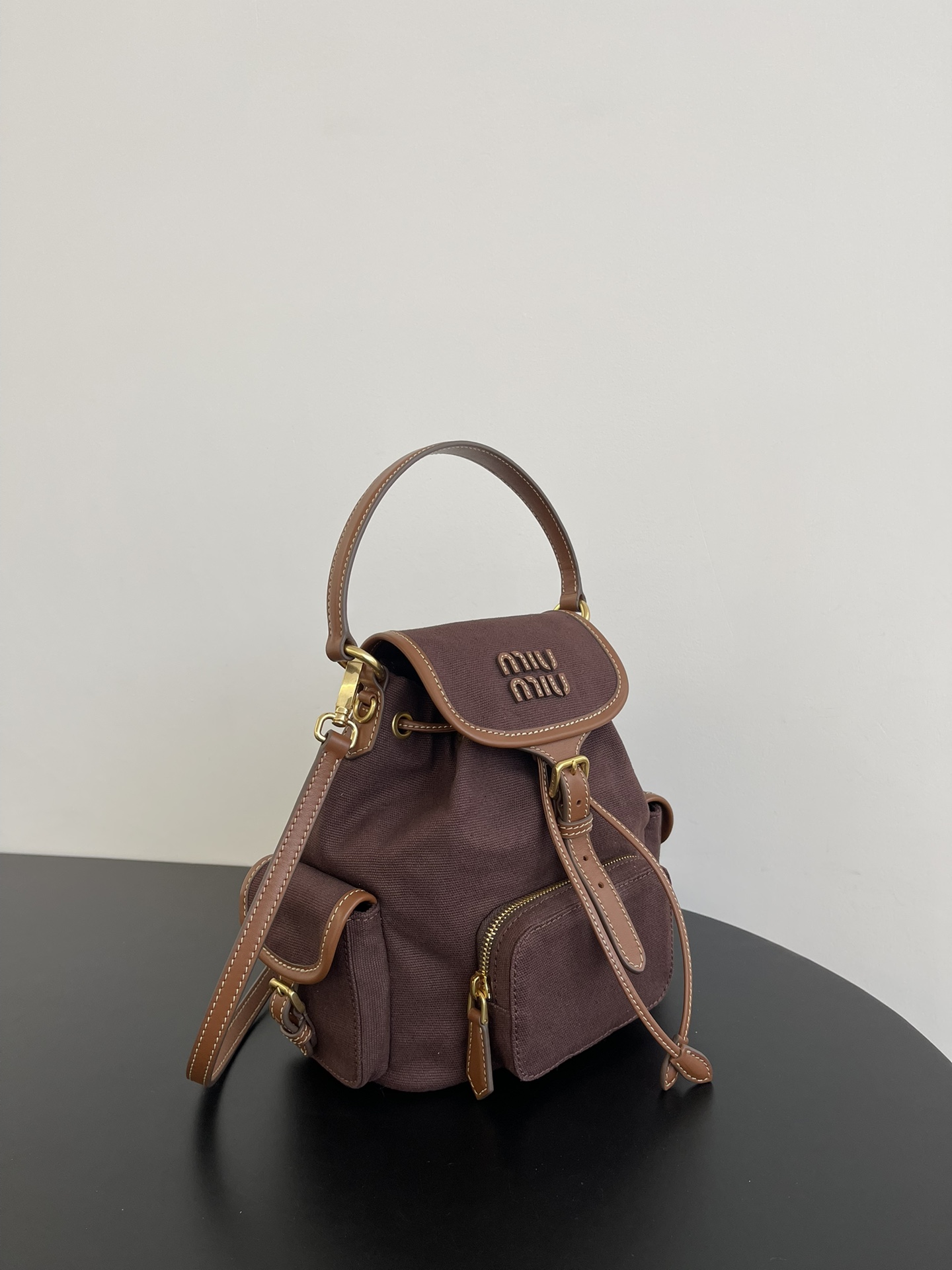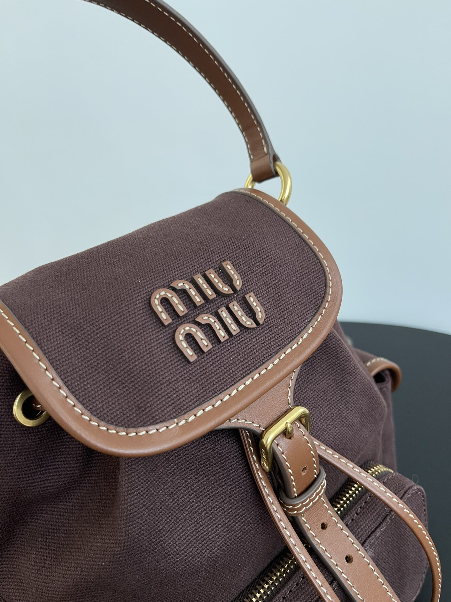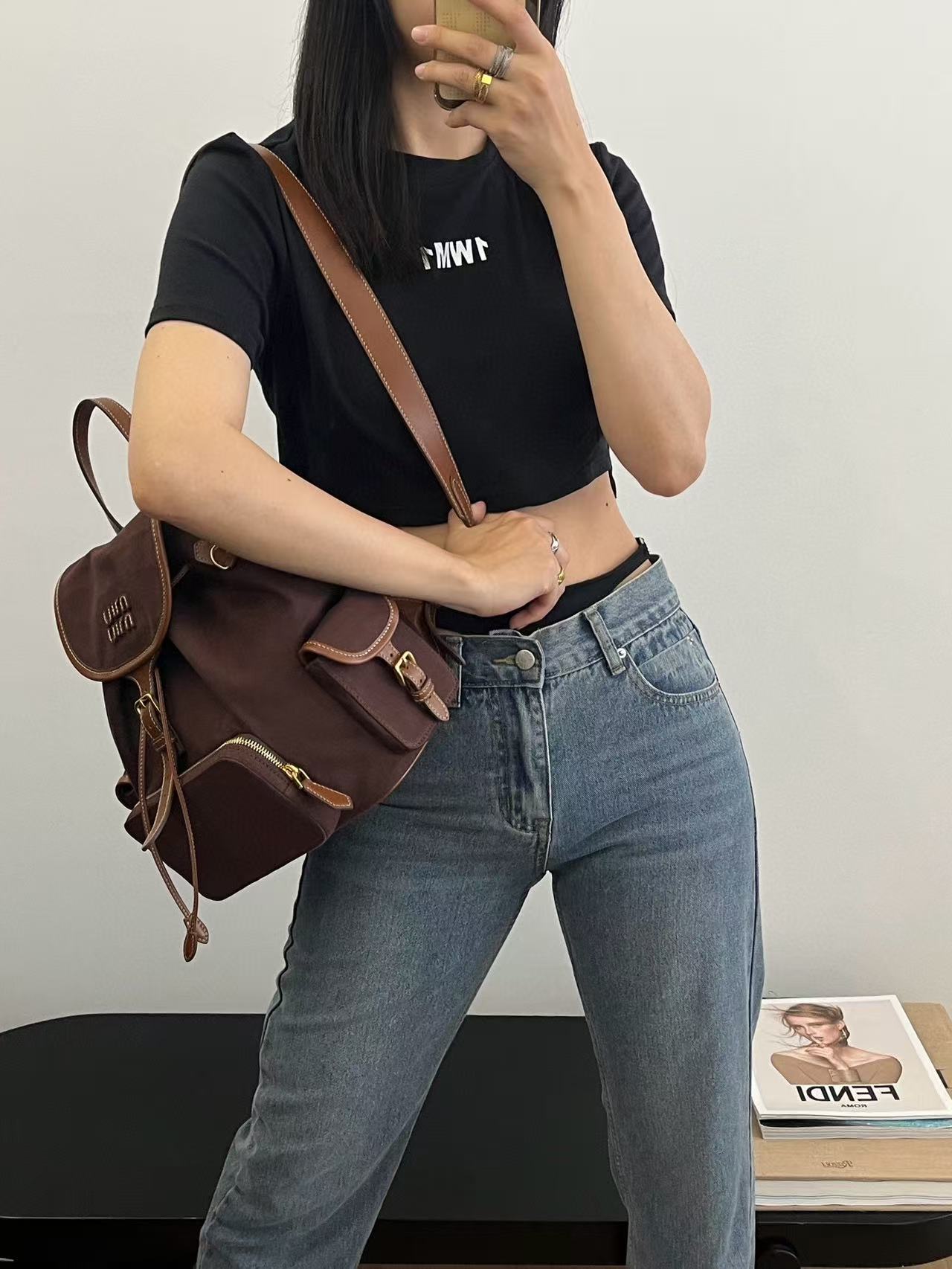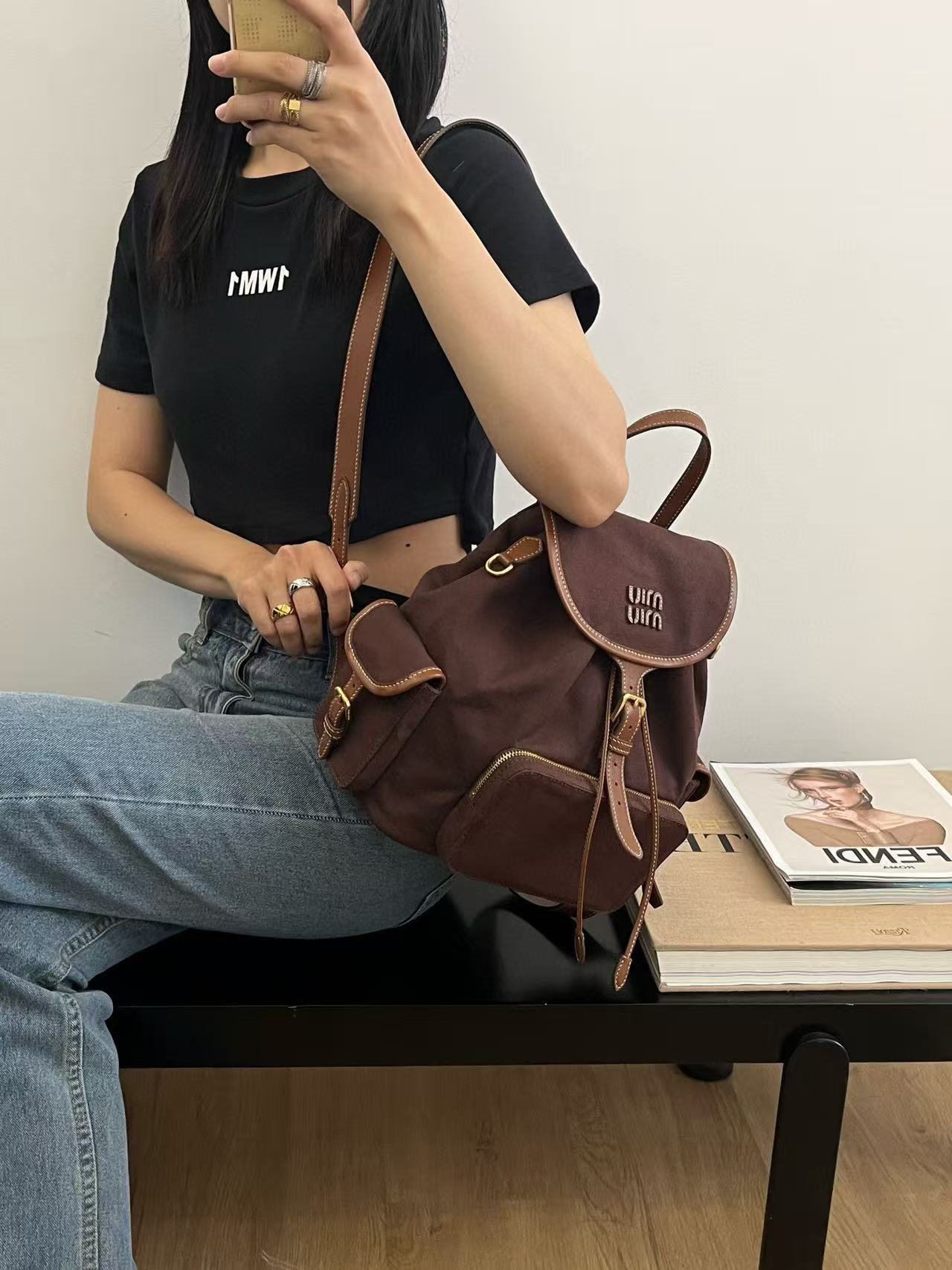 缪缪25ss春季爆火的帆布双肩包 石楠木色,棕色小牛皮搭配帆布的撞色设计,不要太出彩了,轻便又高级感十足,左右两个小口袋也太可爱了叭,手提肩背可随意转换,一包解锁各种风格,姐妹们,冲它不后悔!