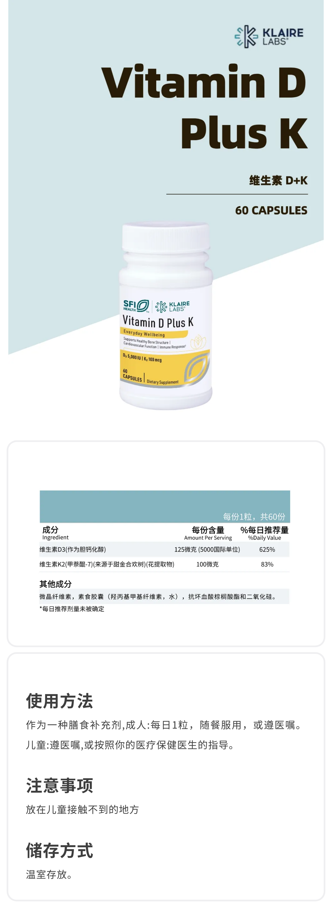 海淘 klaire labs克莱尔 维生素D3+K2 Vitamin D Plus K 60粒/瓶 11/25(新包装)