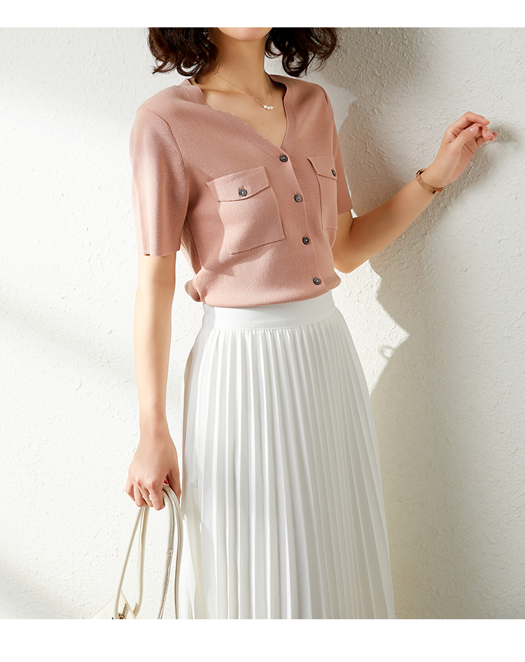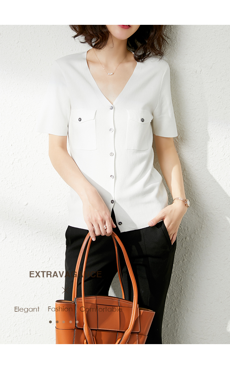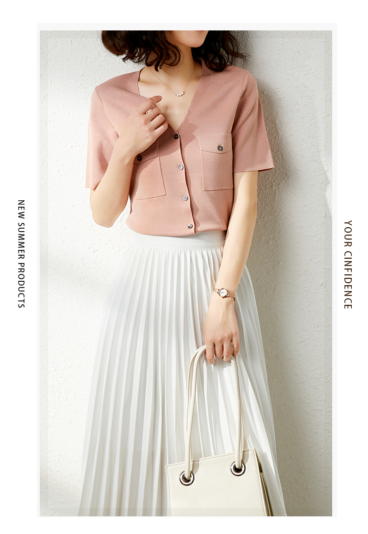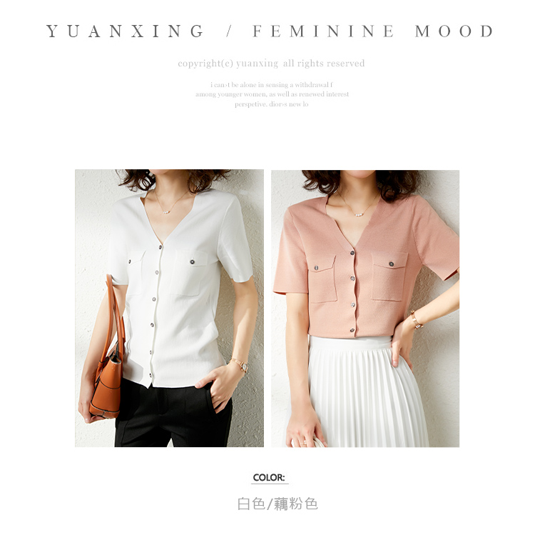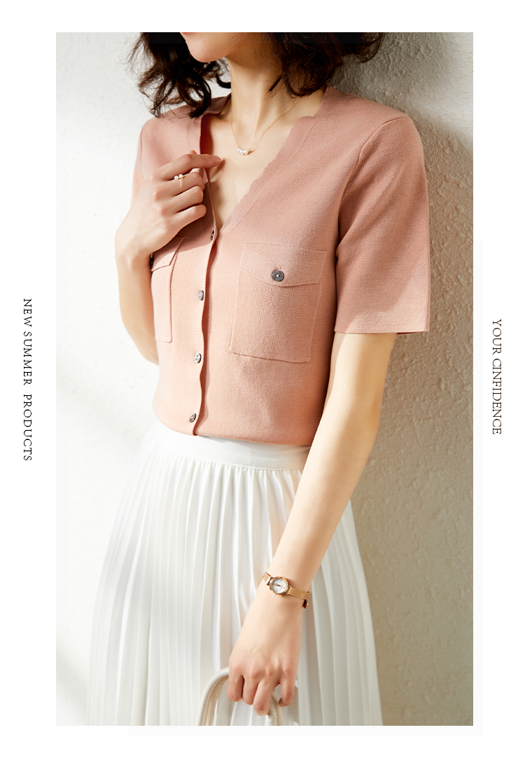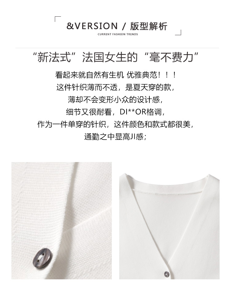 UG【现货7天】减龄气质薄款针织衫 2022夏季新款V领短袖单排扣开衫外套女