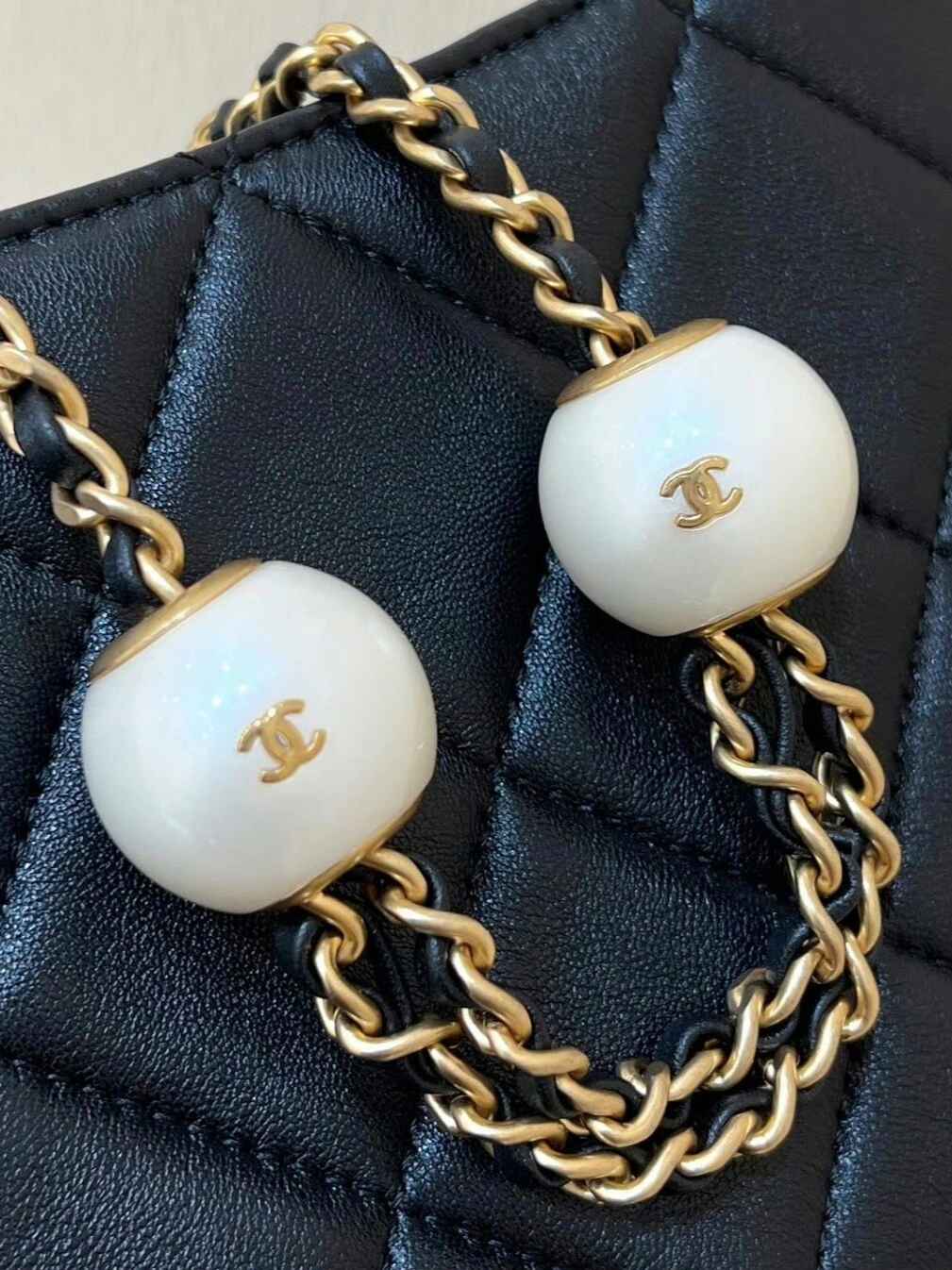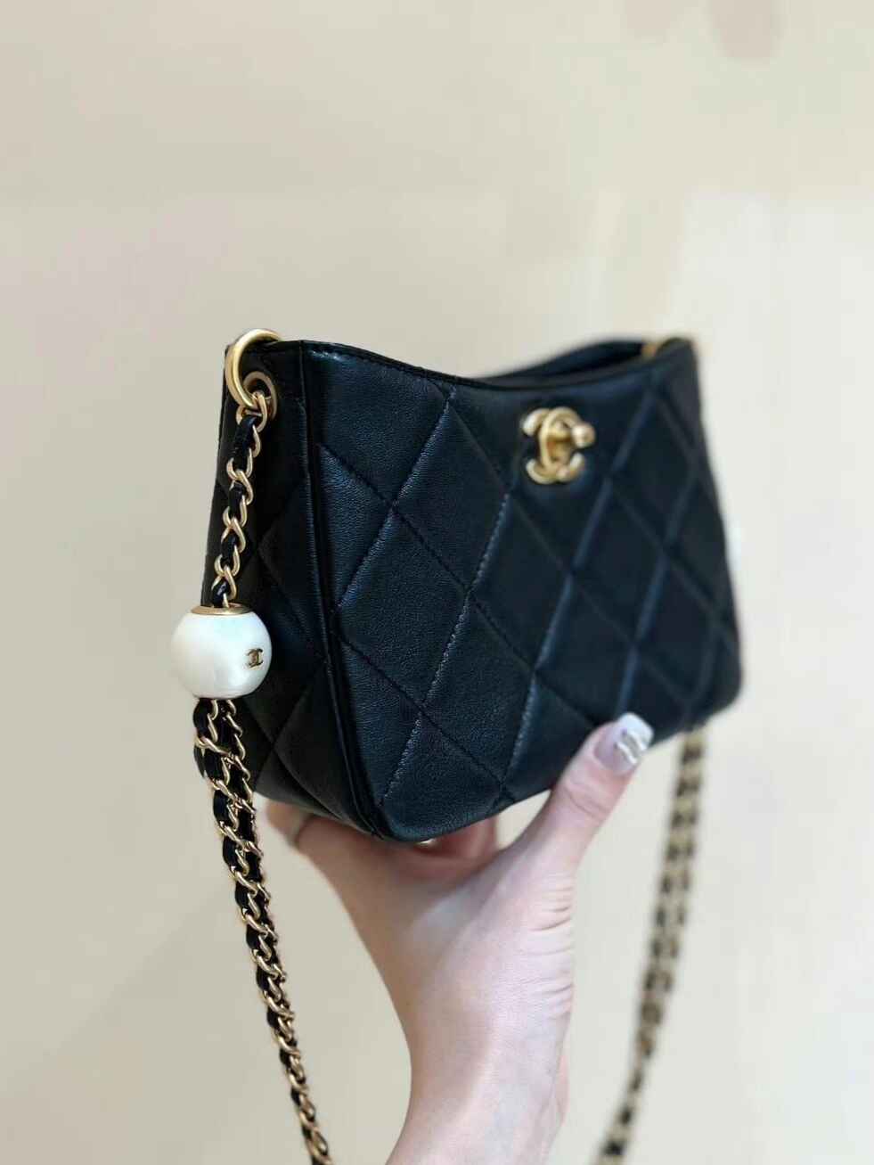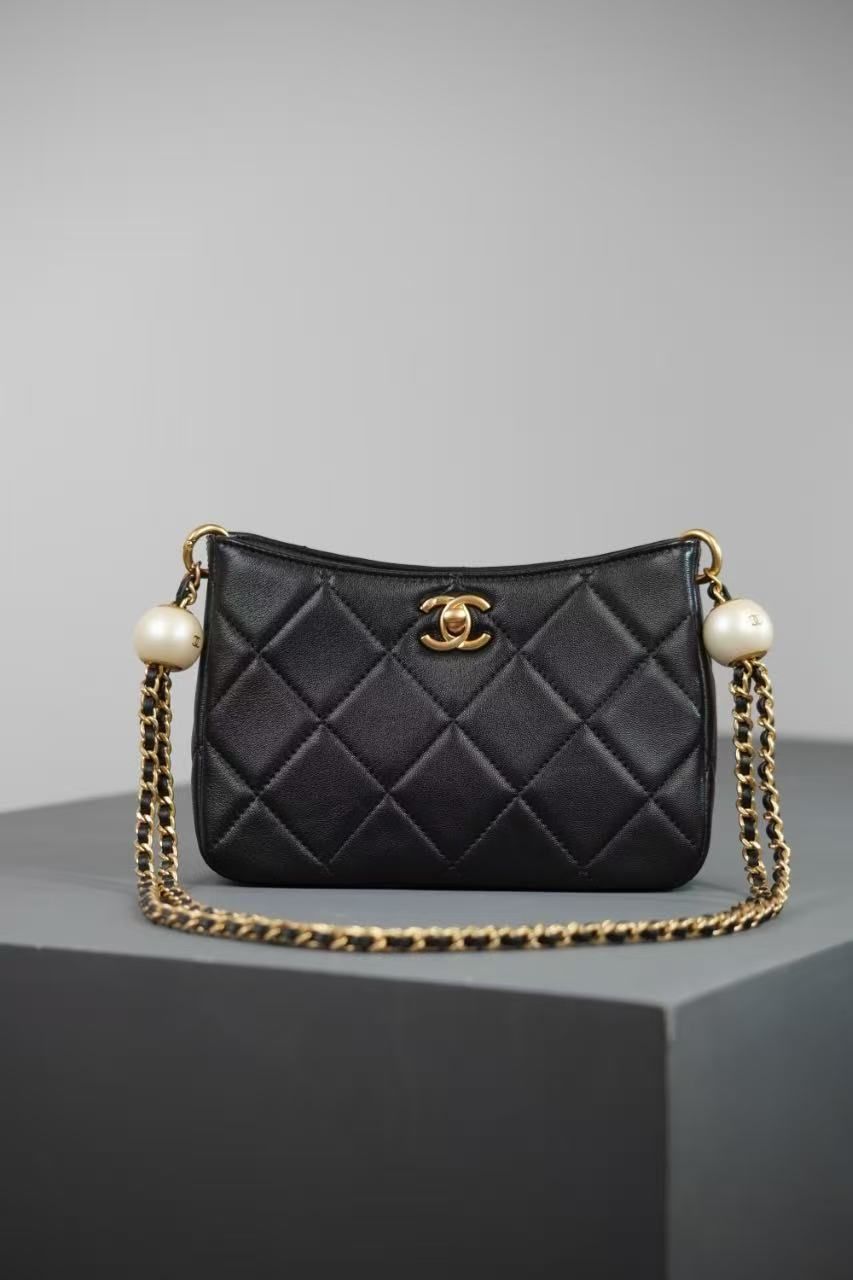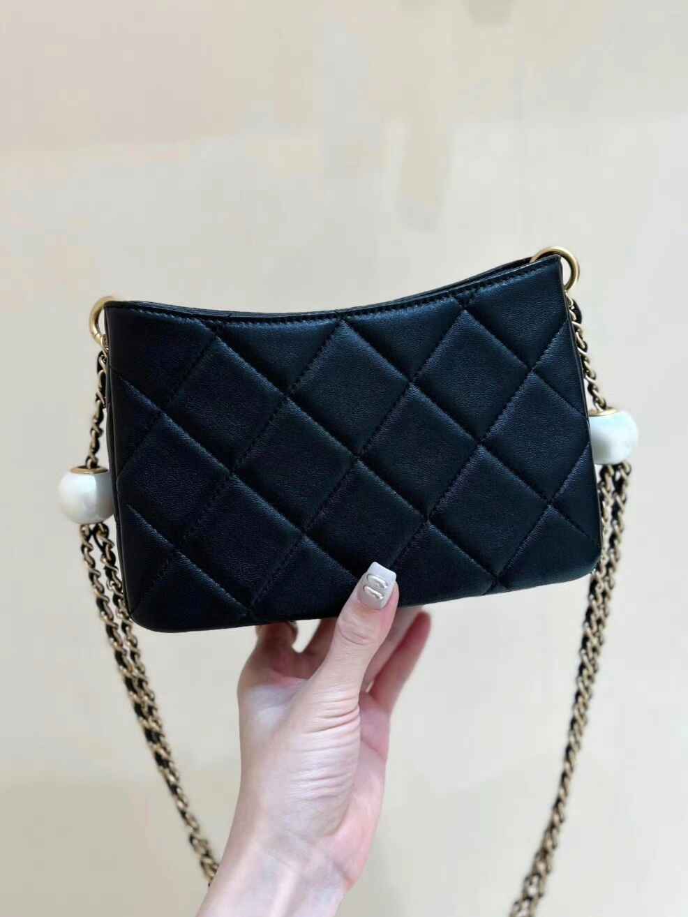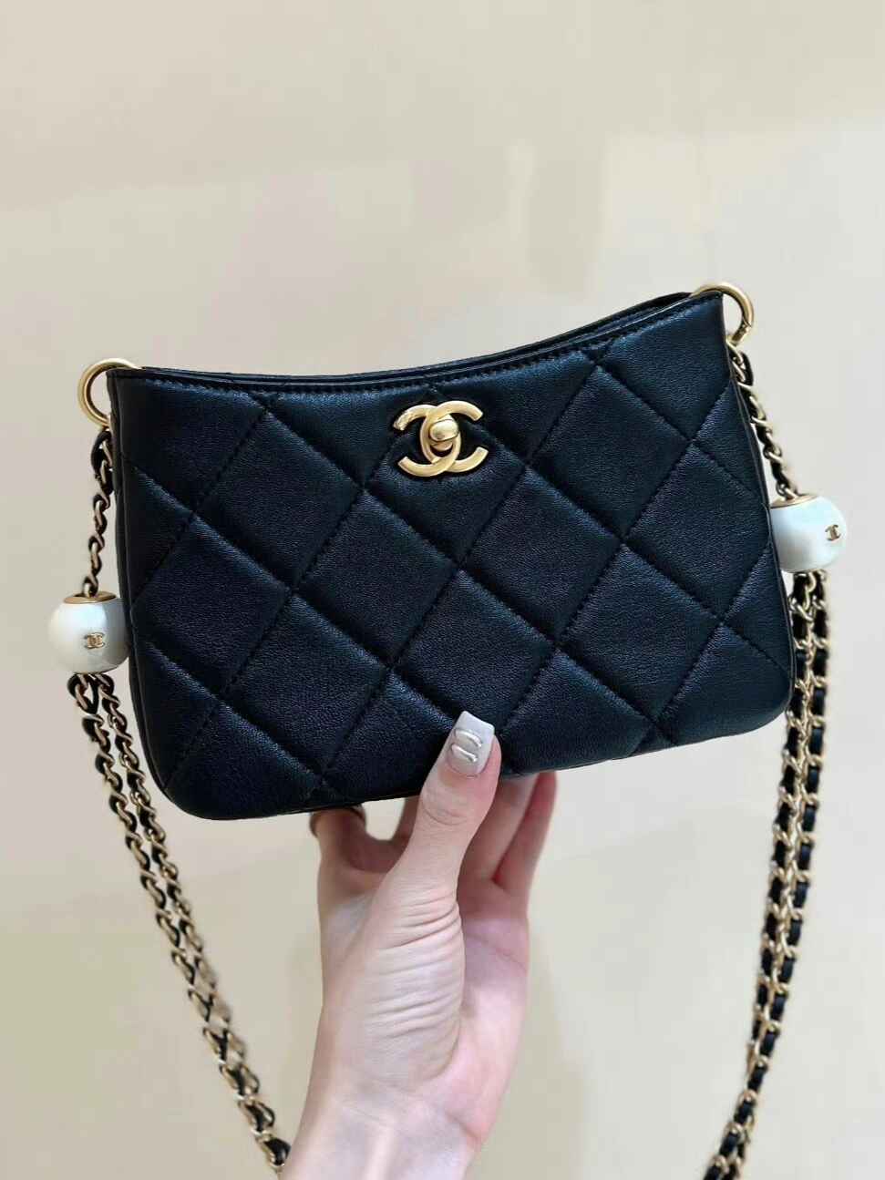 香奈儿 24S 金扣 双珍珠球皮穿链链条肩带 小羊皮 流浪包腋下包斜挎单肩包 常规 女款 黑色(DG*MM)