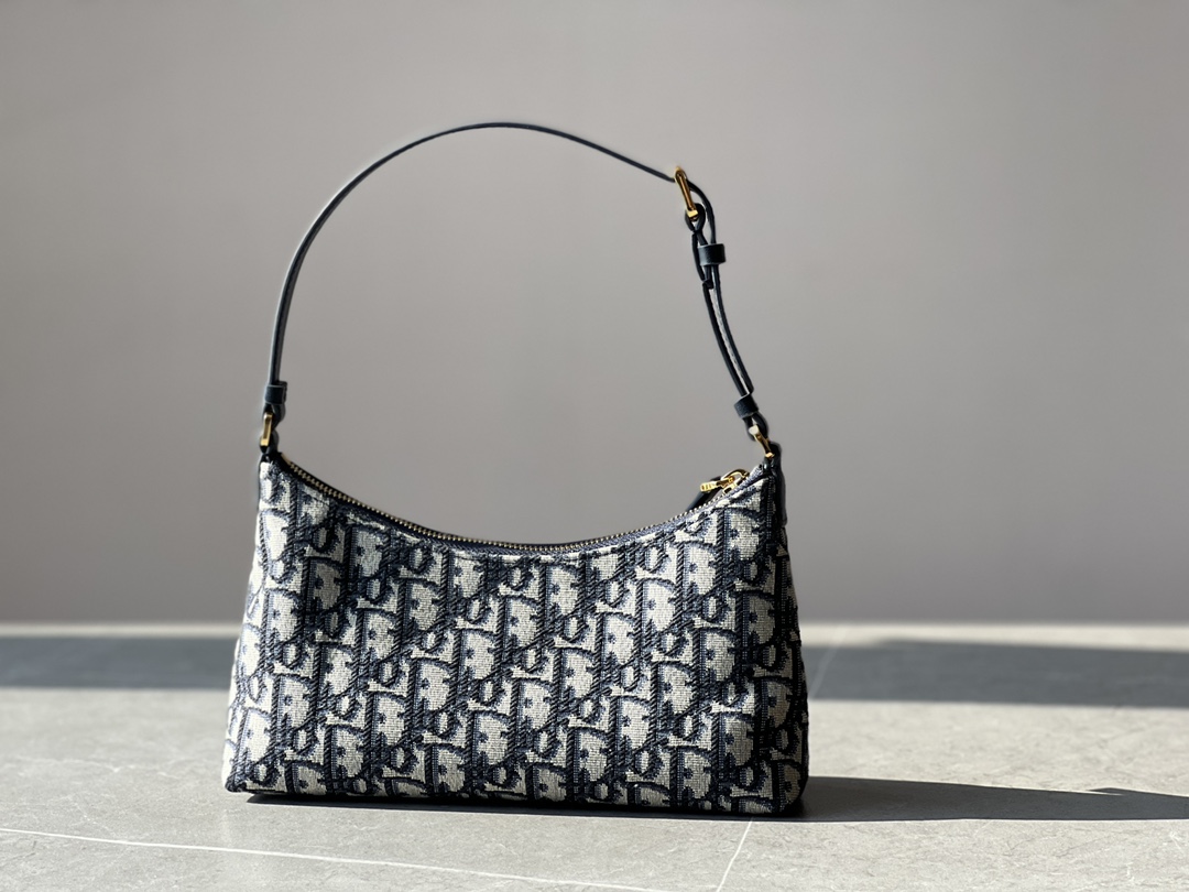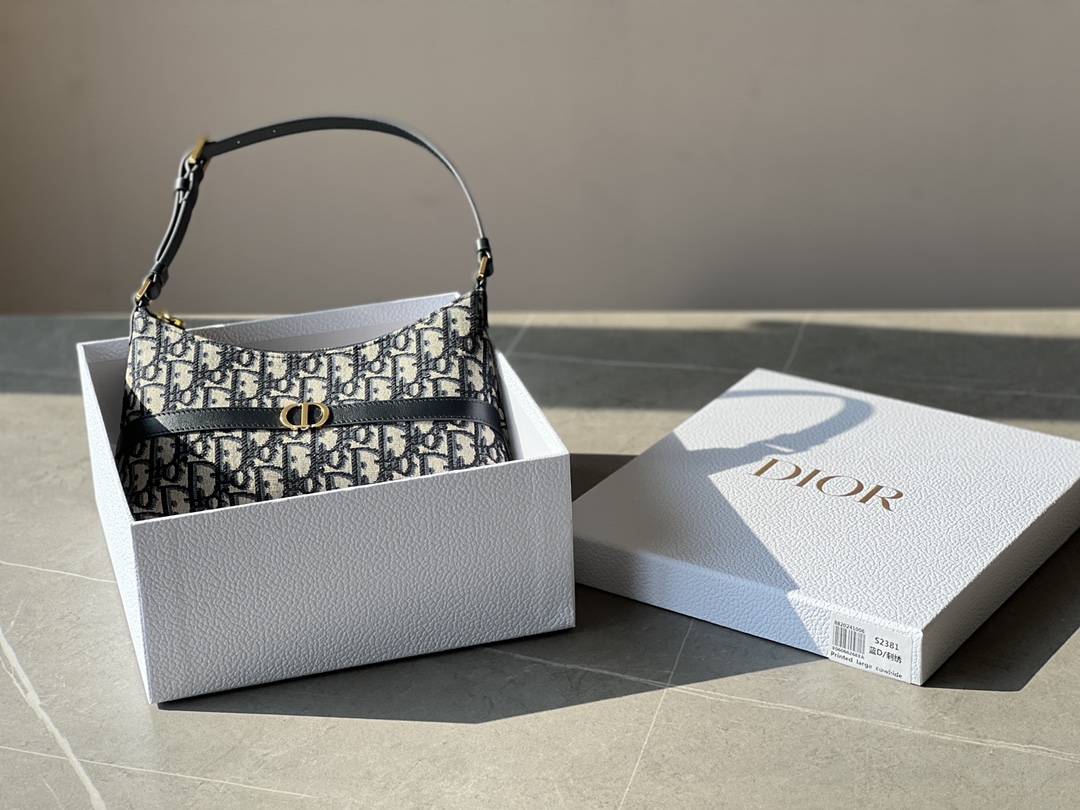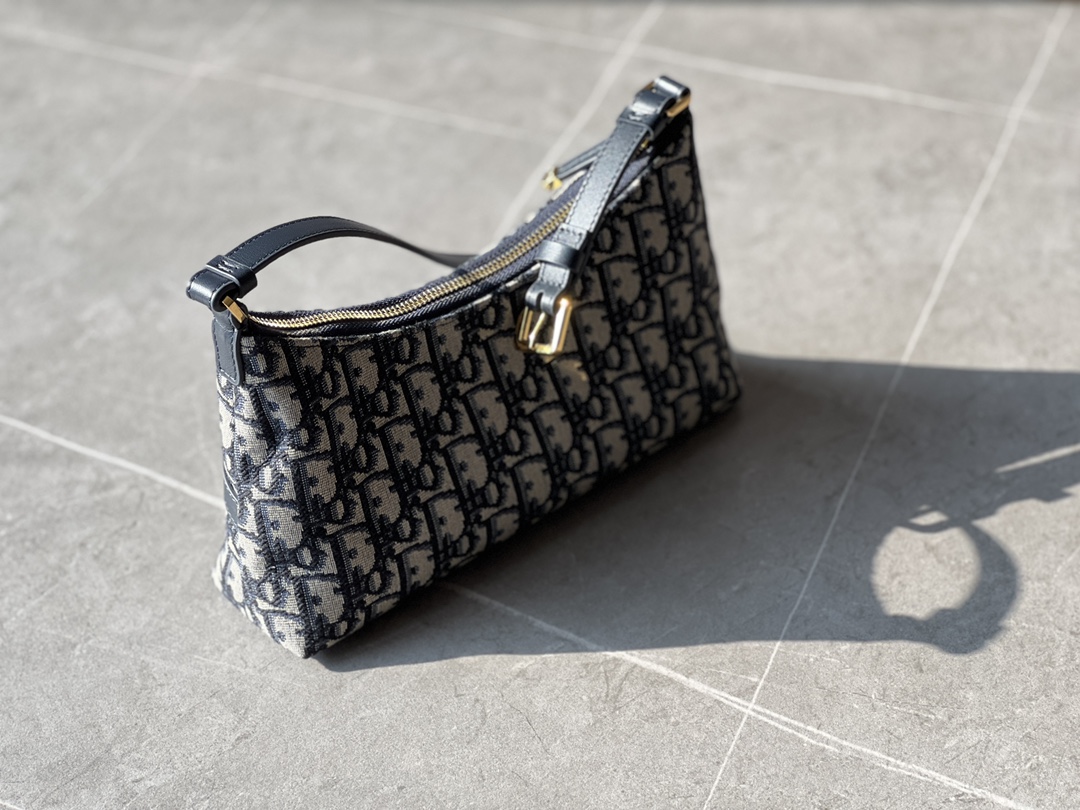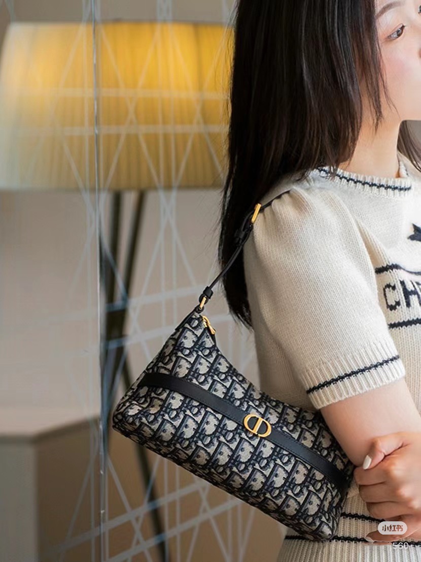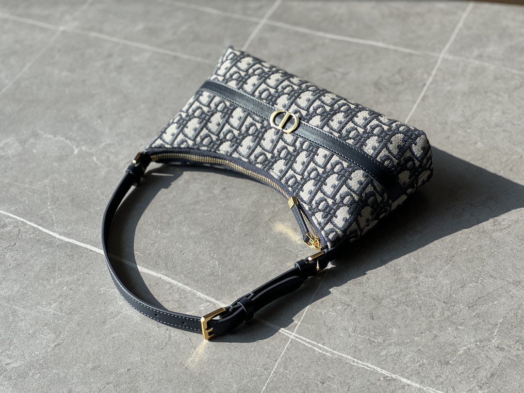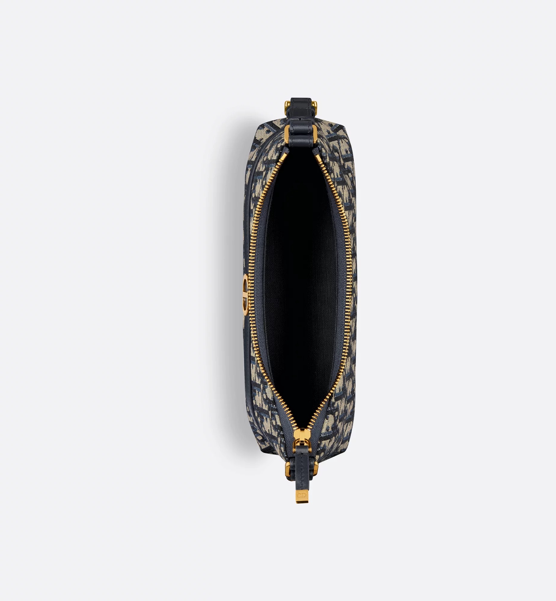 饰面金属 CD 标志。拉链隔层可收纳各种日常用品,搭配可调节的皮革肩带,可优雅地斜挎在肩部。