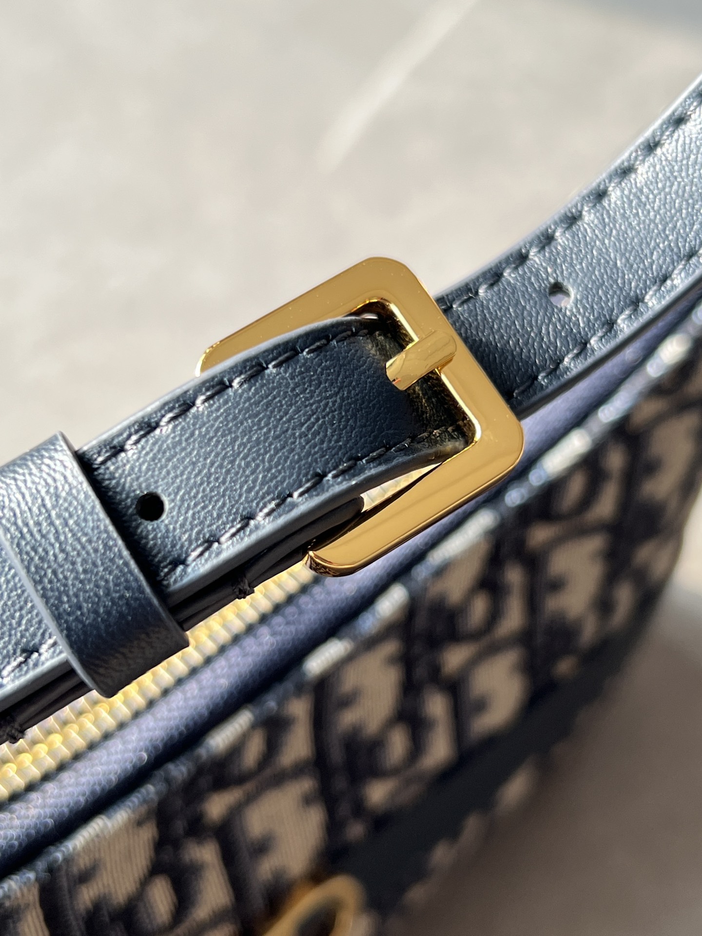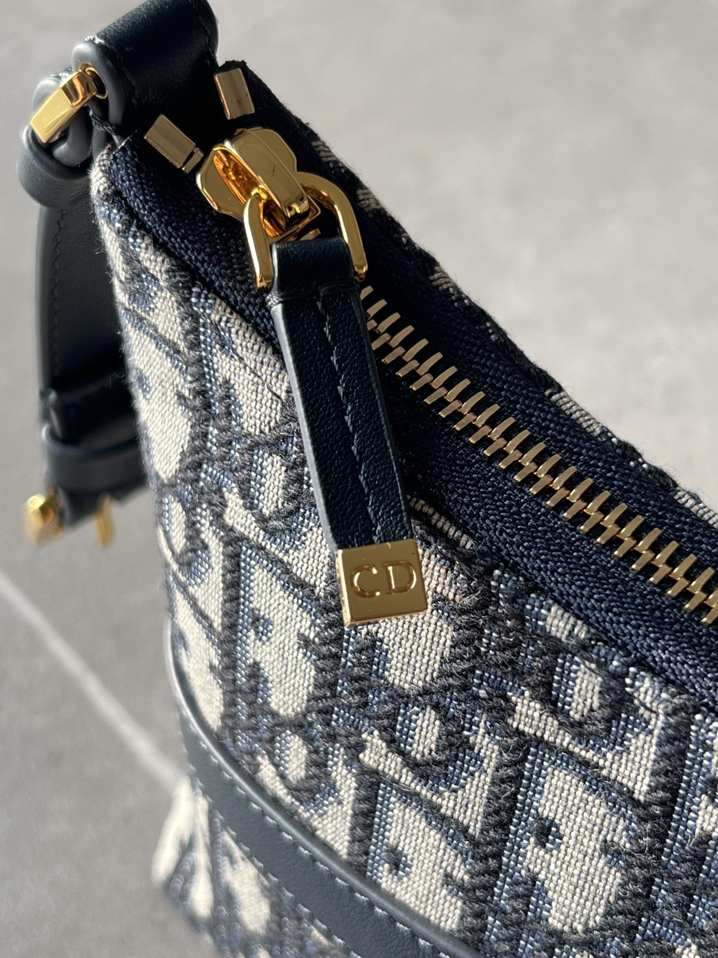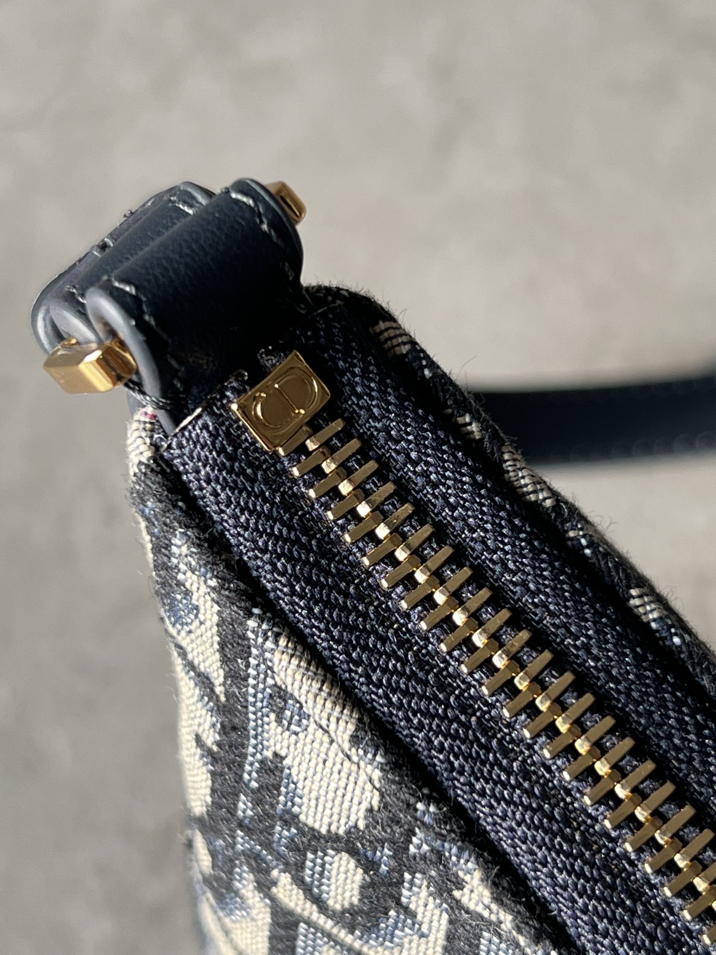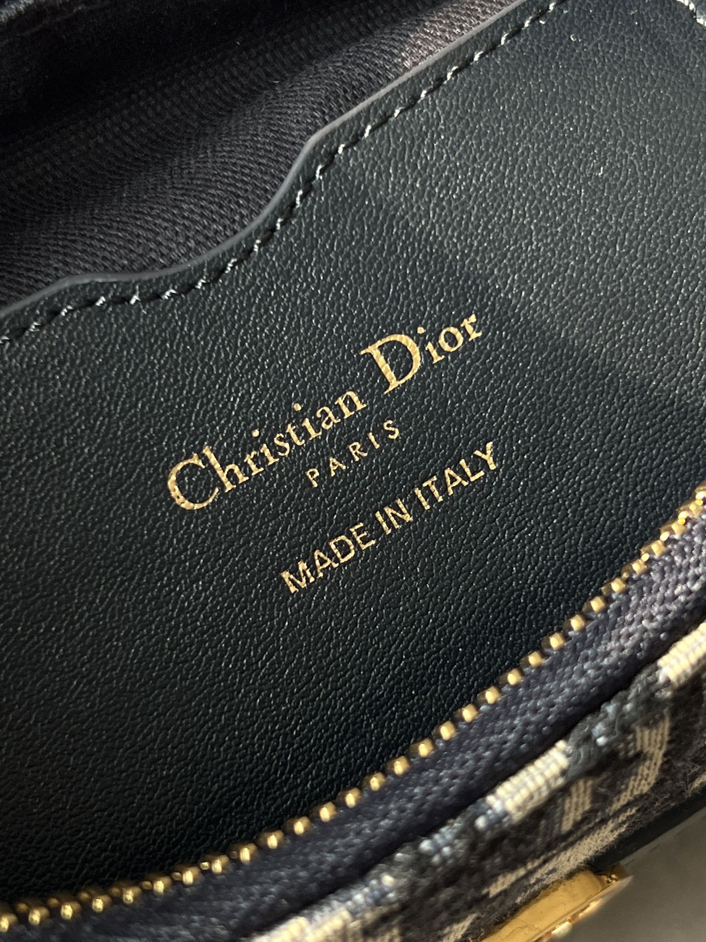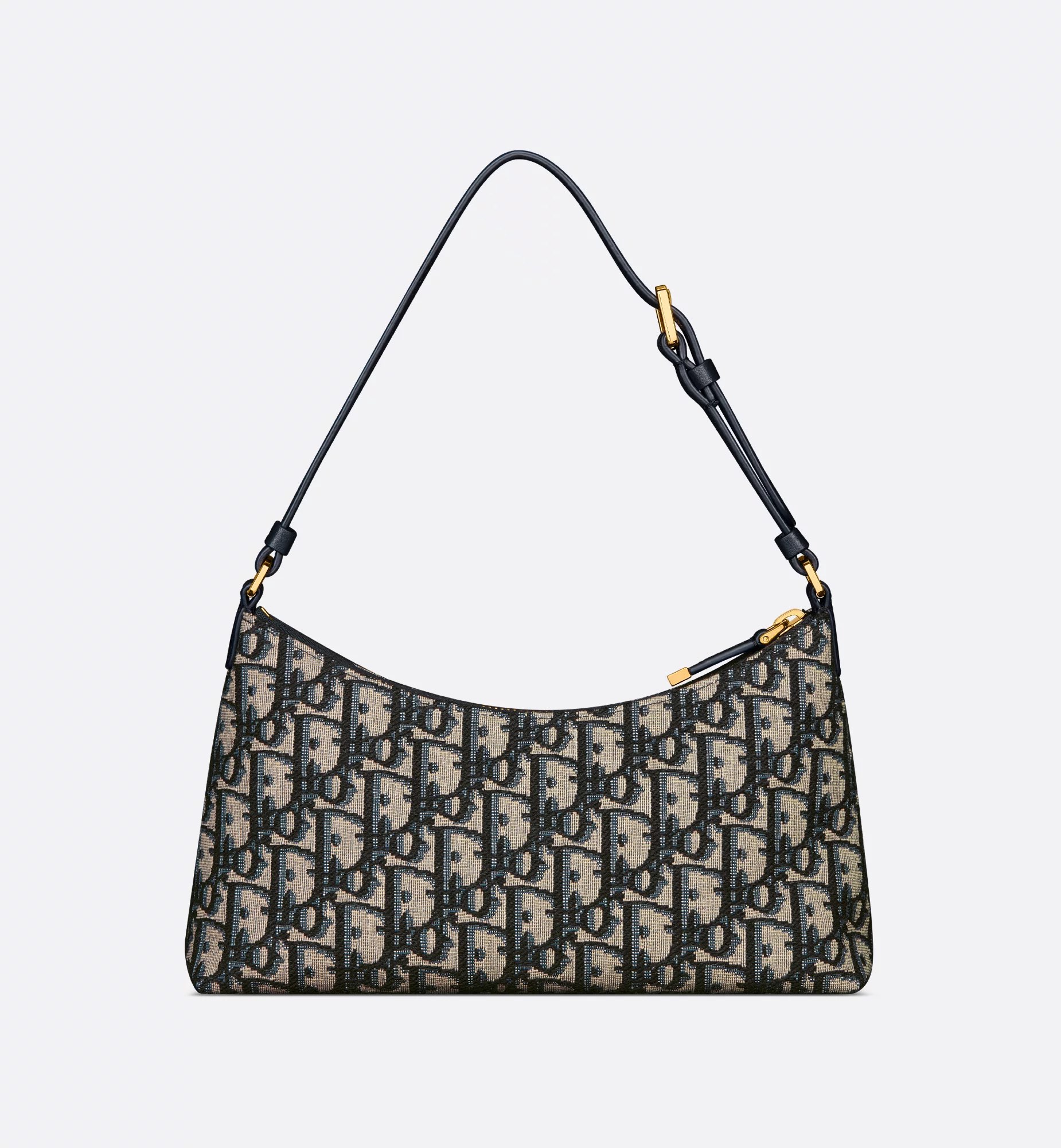 饰面金属 CD 标志。拉链隔层可收纳各种日常用品,搭配可调节的皮革肩带,可优雅地斜挎在肩部。