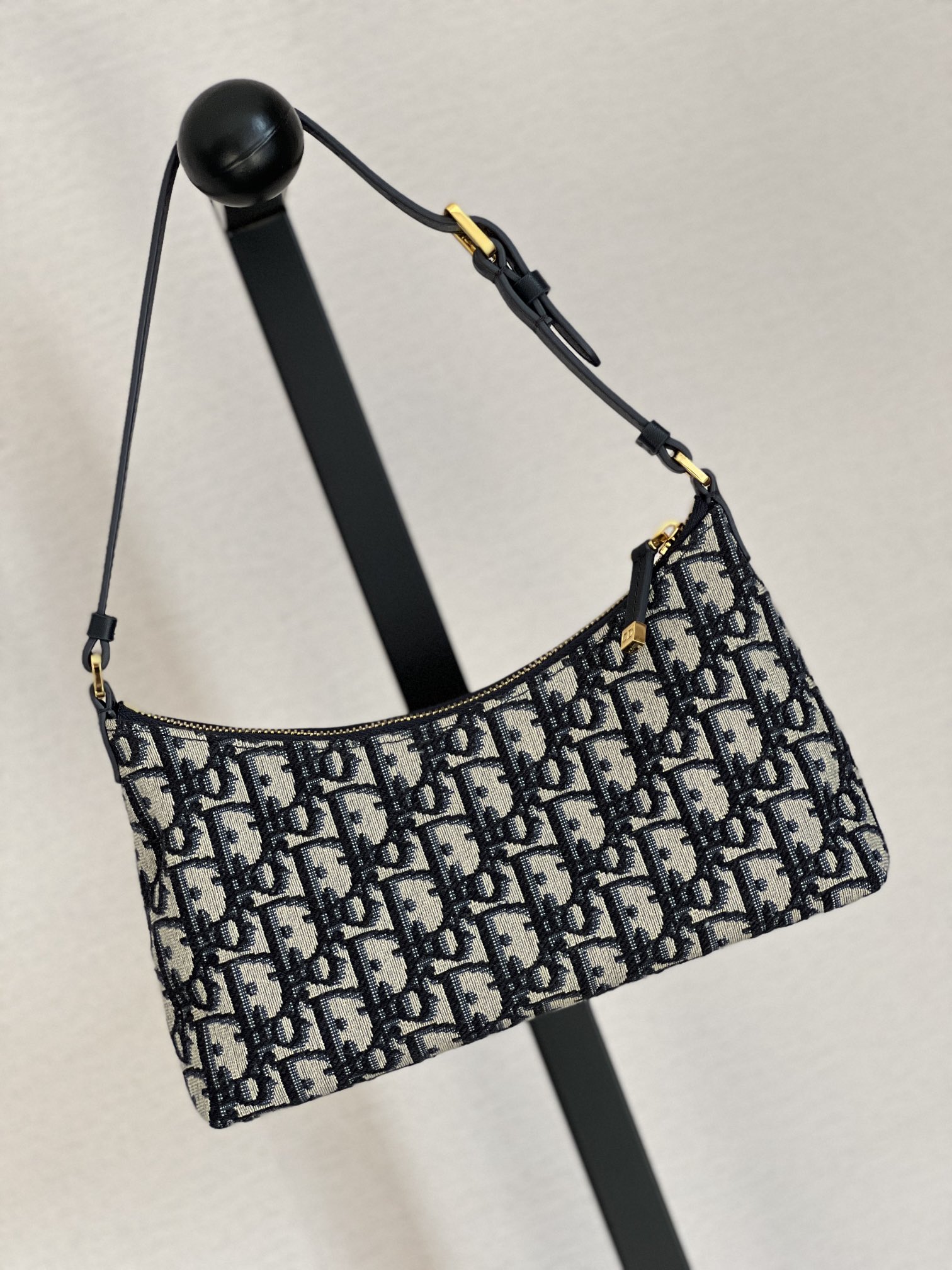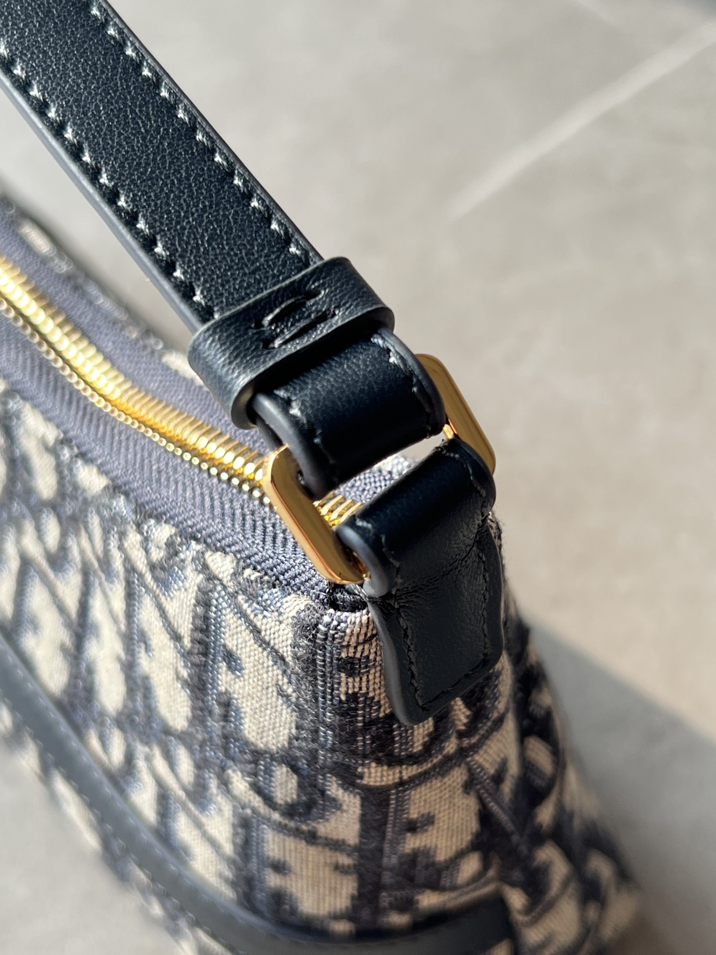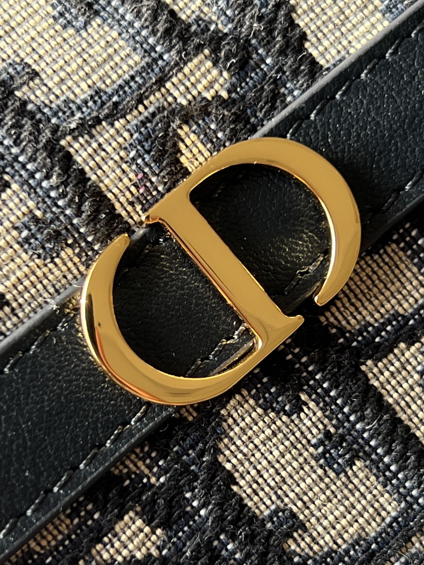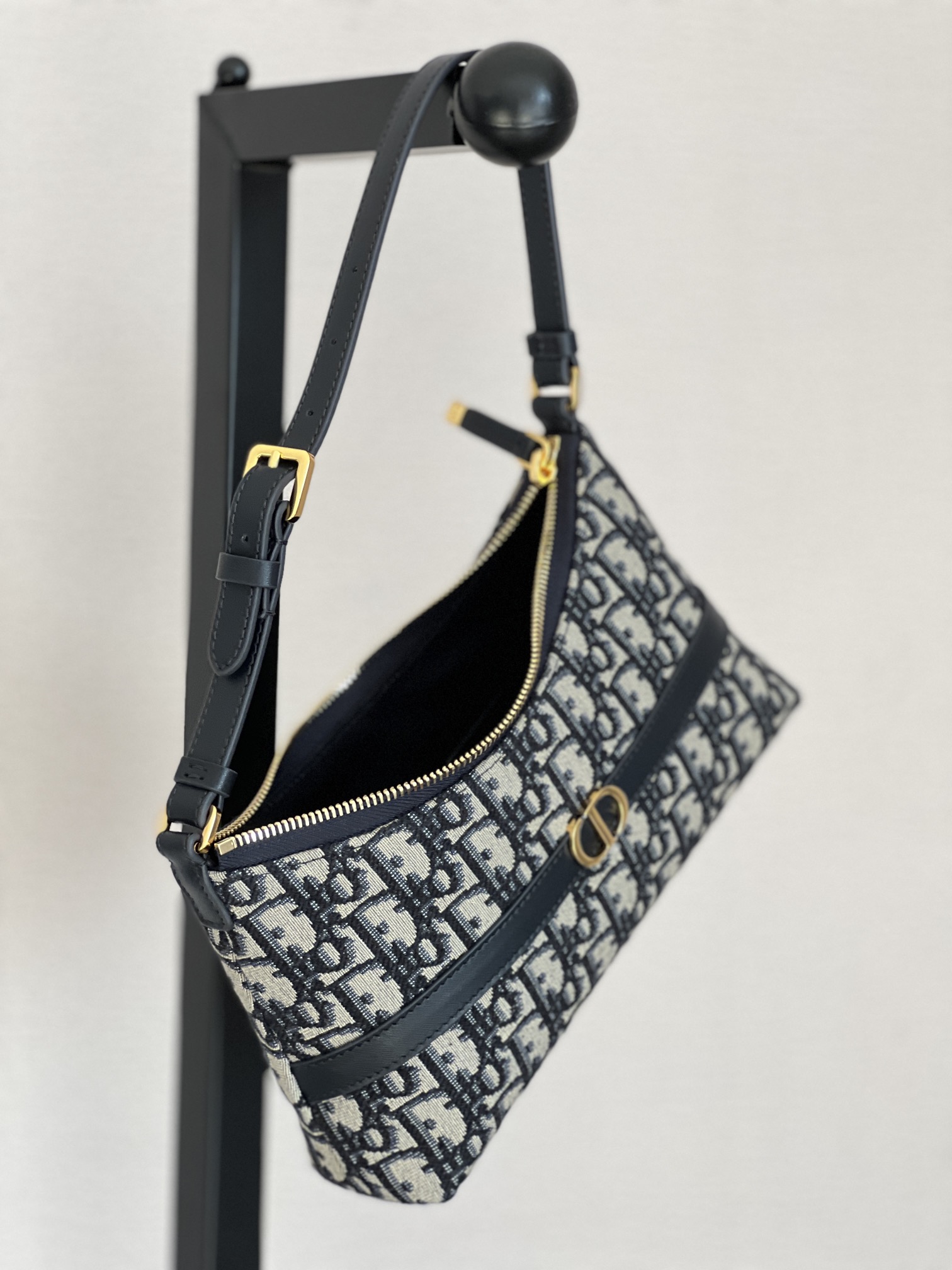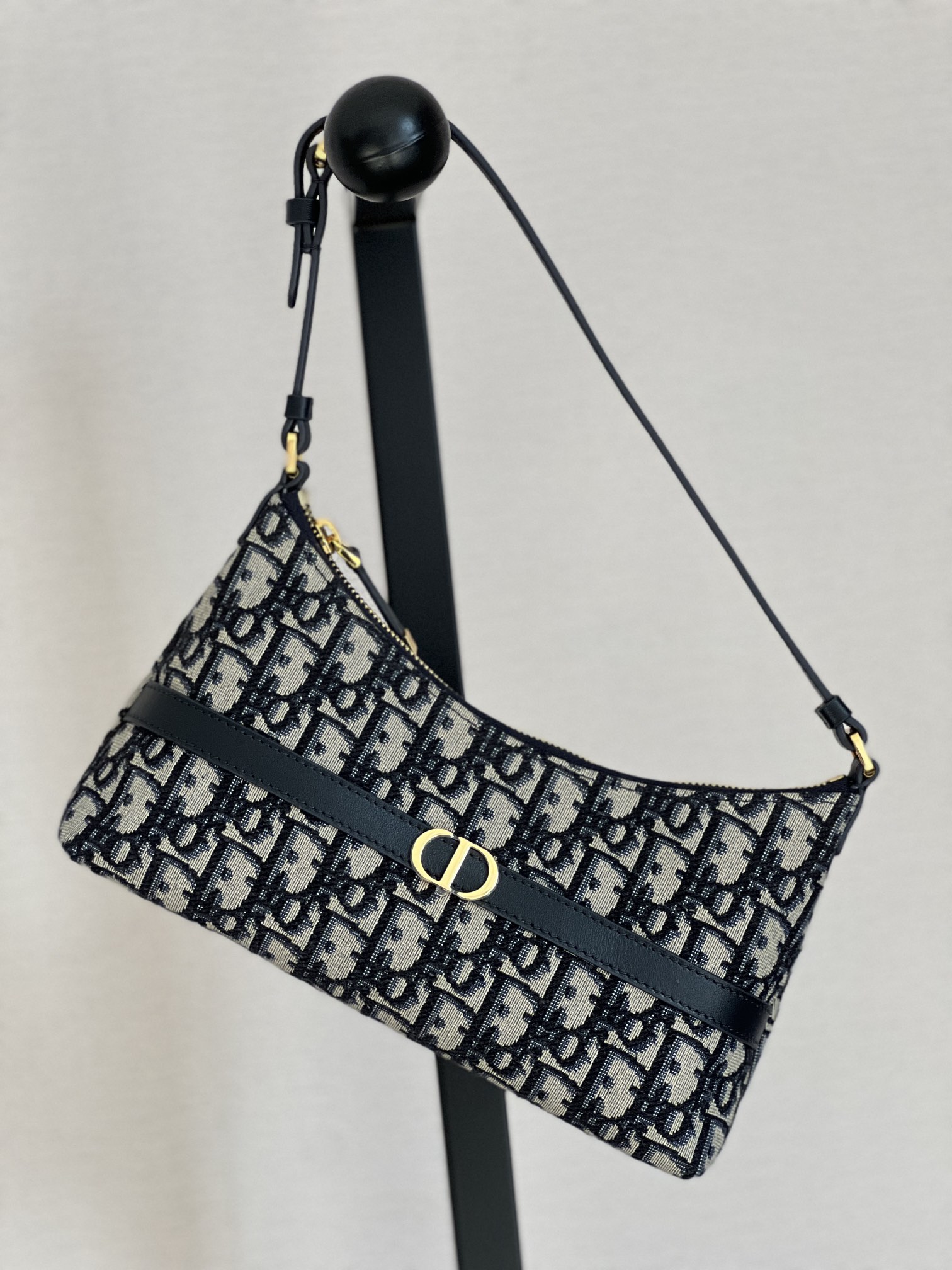 饰面金属 CD 标志。拉链隔层可收纳各种日常用品,搭配可调节的皮革肩带,可优雅地斜挎在肩部。