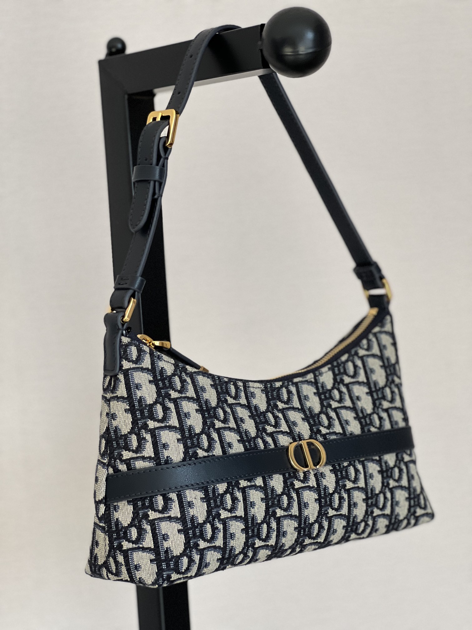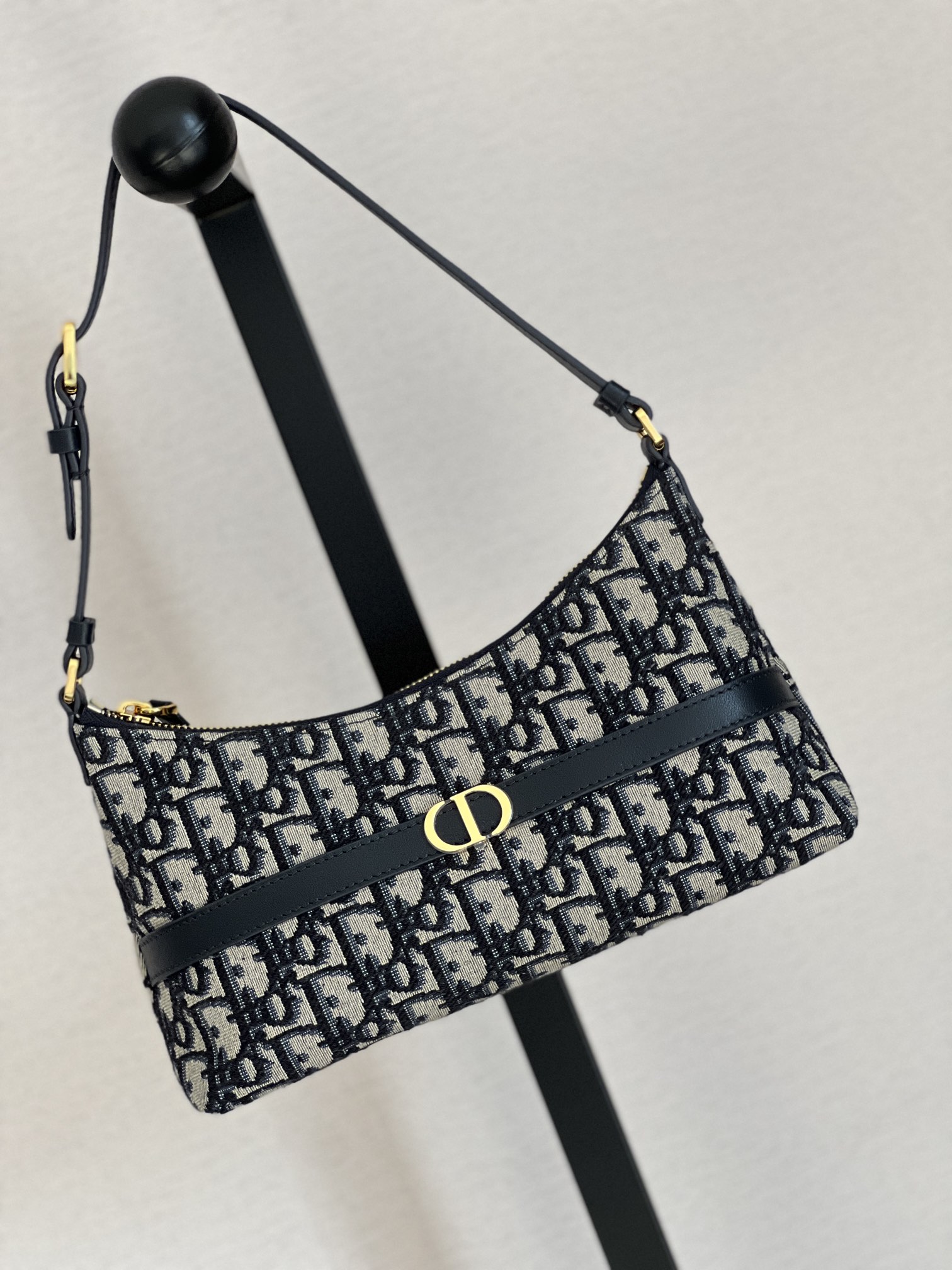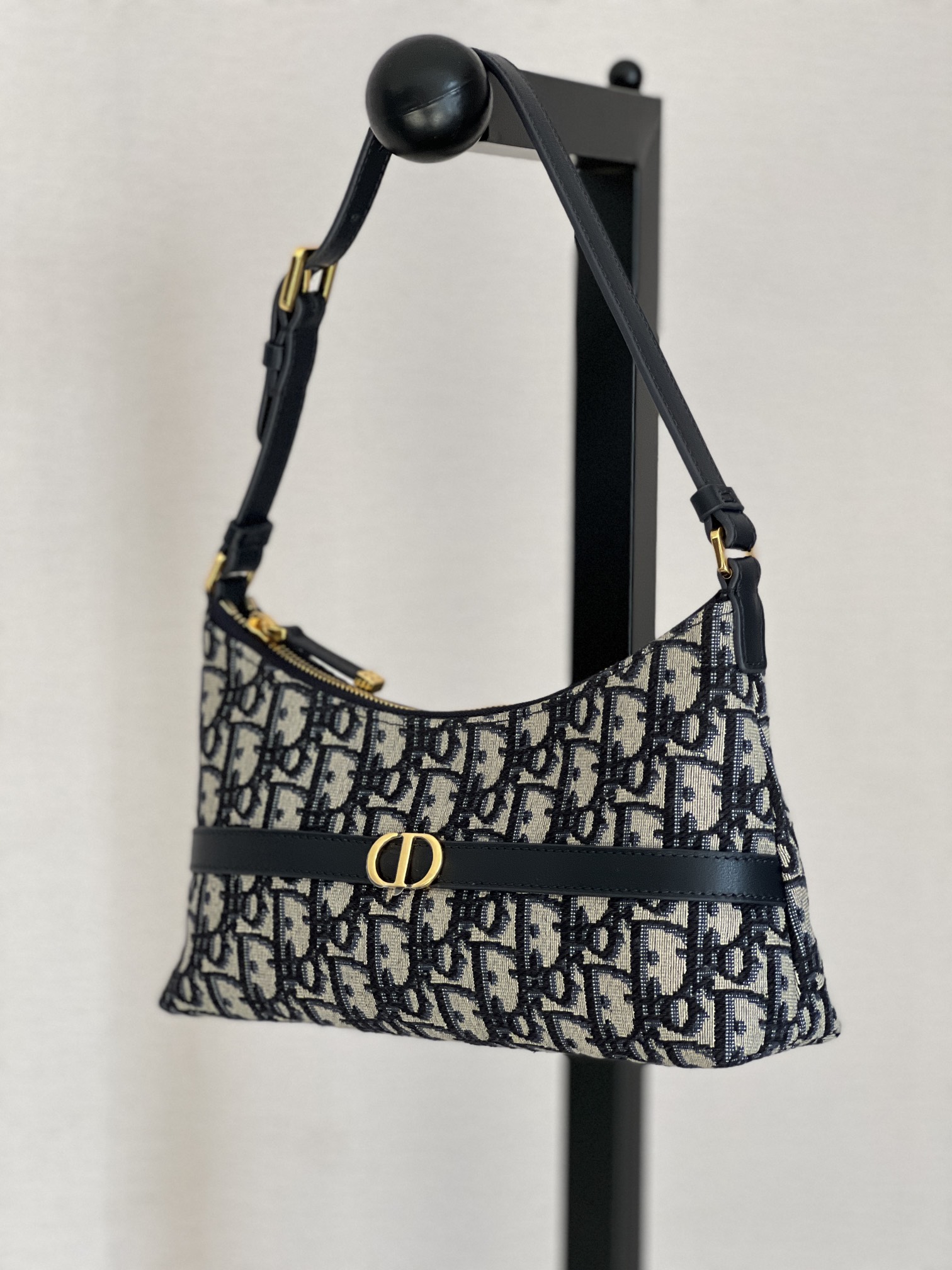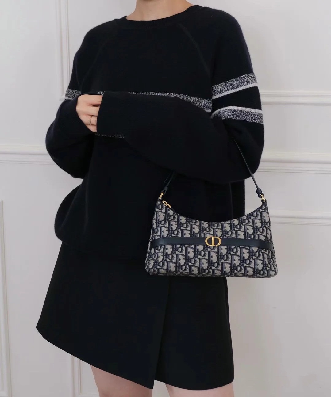 饰面金属 CD 标志。拉链隔层可收纳各种日常用品,搭配可调节的皮革肩带,可优雅地斜挎在肩部。