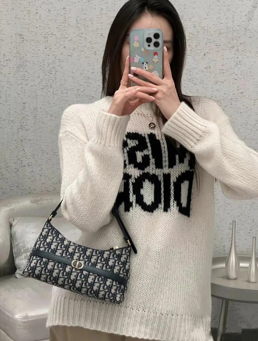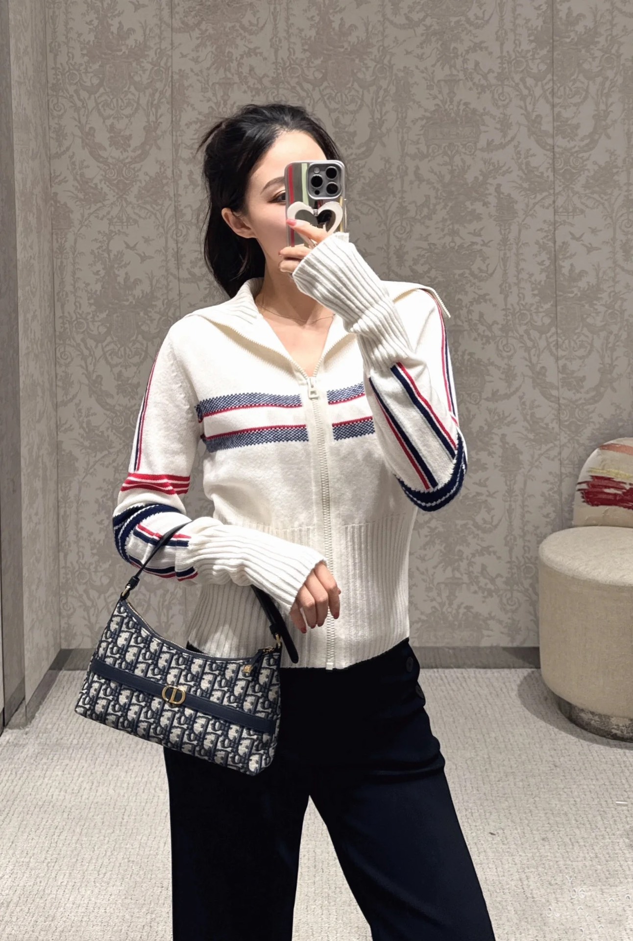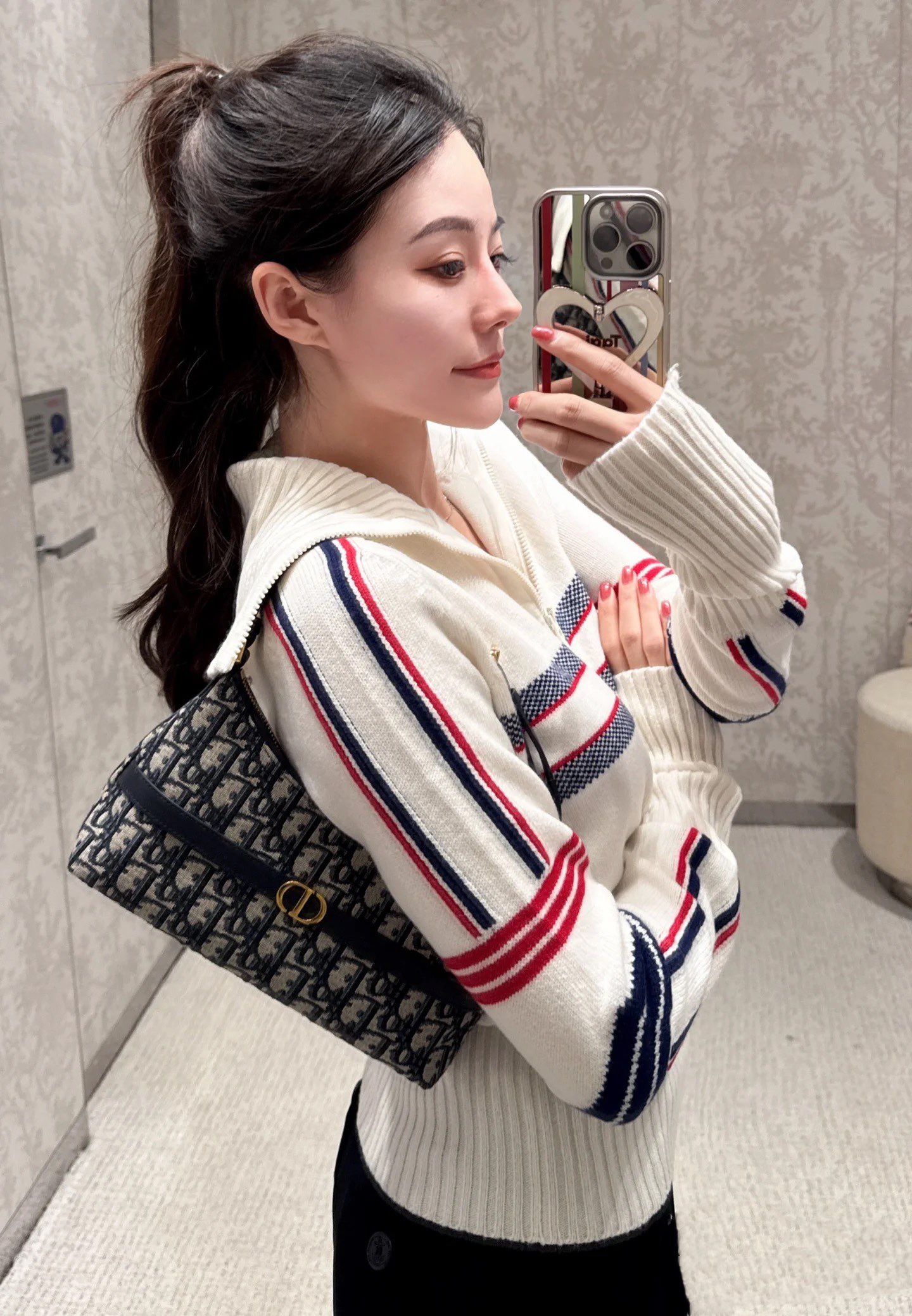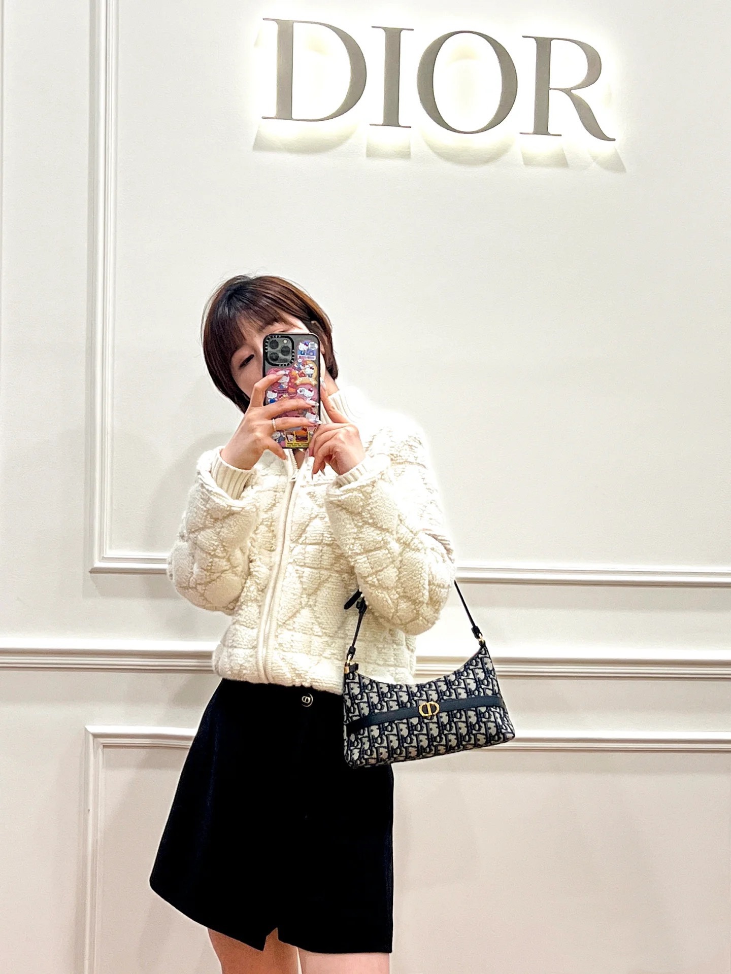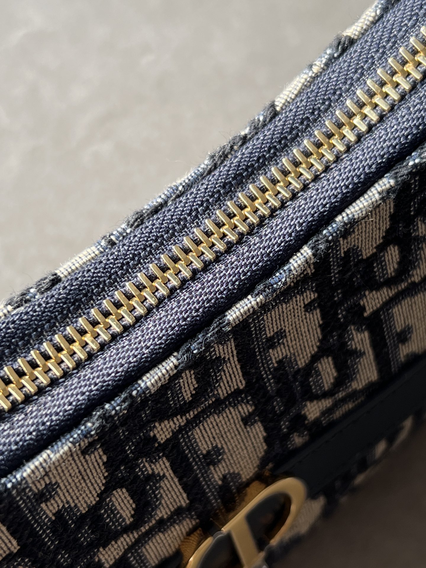 饰面金属 CD 标志。拉链隔层可收纳各种日常用品,搭配可调节的皮革肩带,可优雅地斜挎在肩部。