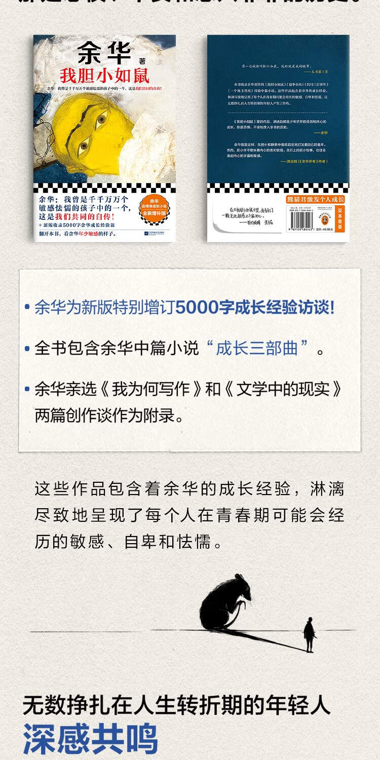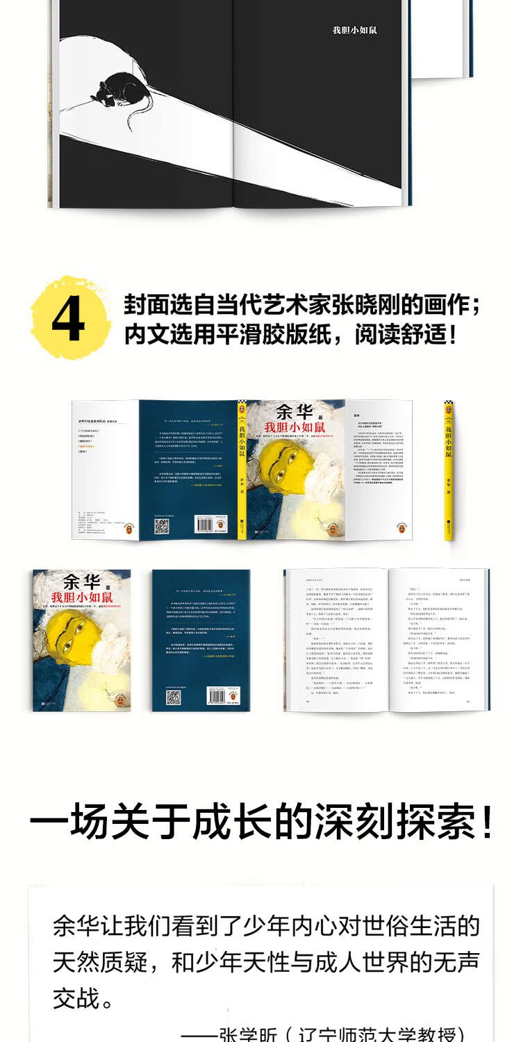 有一句成语叫胆小如鼠,说的就是我的故事。——本书第 3 页本书收录余华创作的《我胆小如鼠》《夏季台风》《四月三日事件》《一个地主的死》四篇中篇小说。这些作品包含着余华的成长经验,淋漓尽致地呈现了每个人在青春期可能会经历的敏感、自卑和怯懦,让无数挣扎在人生转折期的年轻人产生了共鸣。