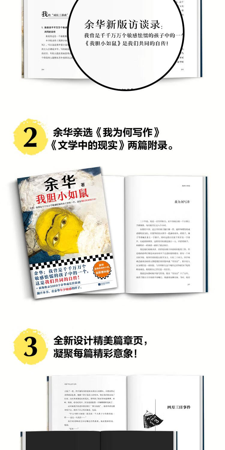 余华当代中国文坛的顶流作家年轻人喜爱的“潦草小狗”1960年 4月3日出生,1983年开始写作。1987年,余华凭成长小说《十八岁出门远行》登上文坛,少年内心对世界的敏感质疑、青春期在与他人观念碰撞时的迷惘恐惧等,在余华笔下初露端倪,并成为他日后小说中的重要主题。余华说,“一个人成长的经历会决定其一生的方向”,过往的成长经历不仅影响着他的生活,也成为他强大的创作力源泉。《我胆小如鼠》曾以《我的故事》为名发表,是余华对自己少年时代的回顾和演绎。余华也曾是一个天生敏感、胆小寡言的少年,在考学、择业等阶段默默地承受着成长所带来的苦涩和无奈,用好奇的眼光和敏锐的感知力,打探并理解这个世界。在《夏季台风》《四月三日事件》等作品中,余华进一步将自己对成长的感受和理解融入故事,用亲身经历鼓舞着当下年轻人:我也曾是千千万万个敏感怯懦的孩子中的一个,这可能正是我不断成长的原因。