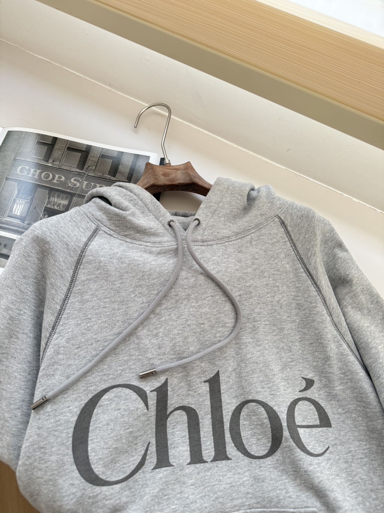 宽松短款版型,连帽抽绳设计,正面大尺寸“Chloé”字母印花,下摆/袖口撞色罗纹,主打法式休闲风格,适配日常通勤、休闲穿搭。