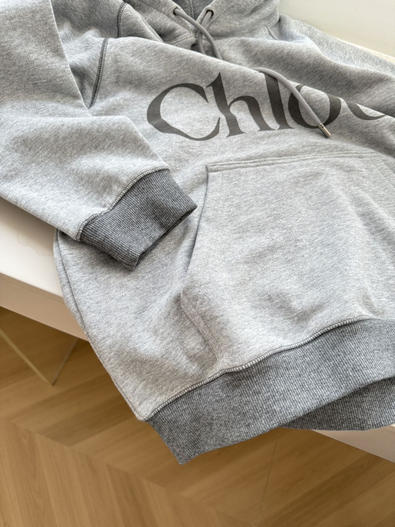 抽绳工艺:对标正品 探长家连帽抽绳为棉麻混纺绳,金属头刻字“Chloé”,抽绳孔为加固锁边设计;市面复刻款为普通棉绳,金属头无标识或刻字模糊,抽绳孔易撕裂。