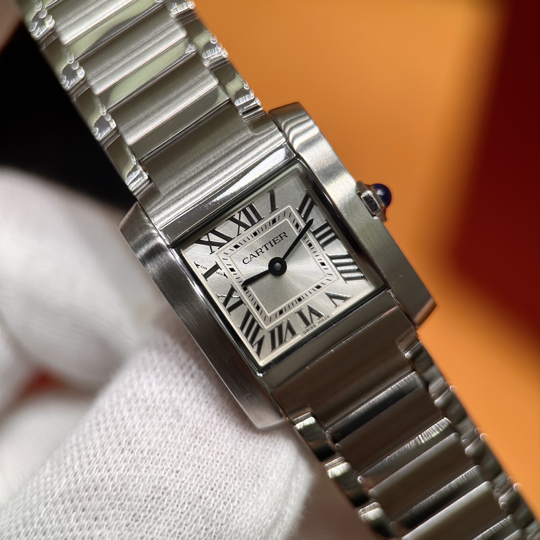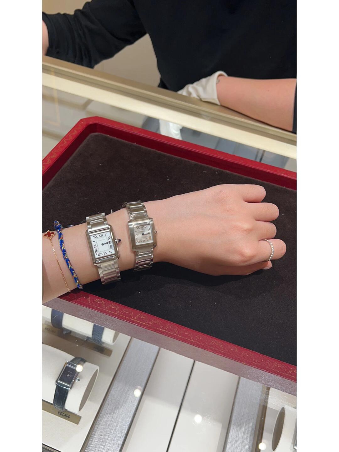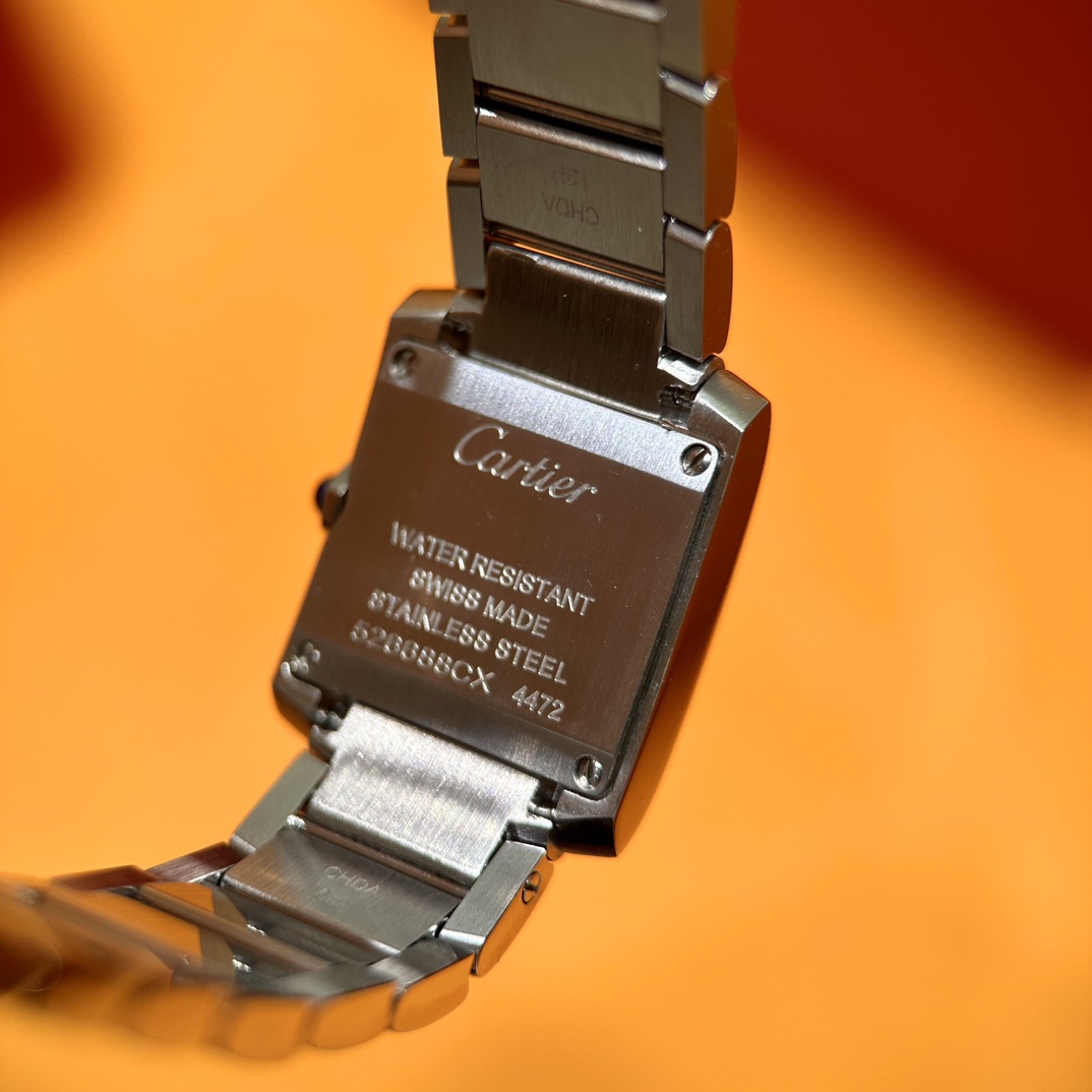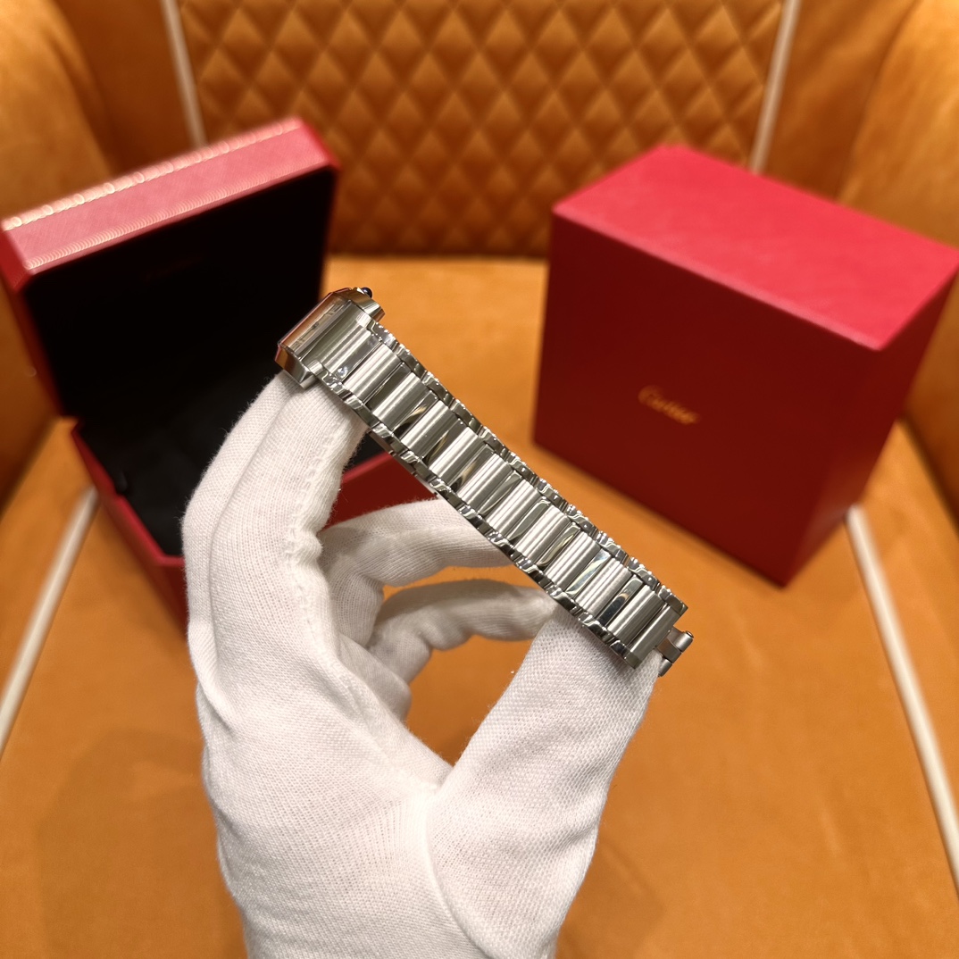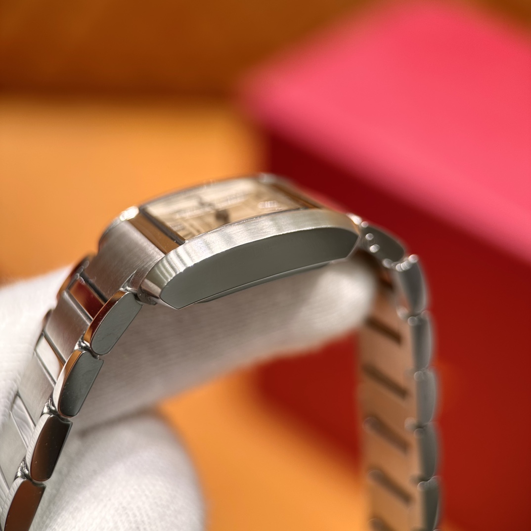 卡地亚的全新法国坦克!这款全新演绎的手表,不管是镶钻小号表款还是不带钻的表款,各有其独特之处!银色的罗马刻度和缎面抛光,让手表更显细腻质感。表壳和表链一体连接,线条锐利,充满时尚感。精细的拉丝工艺让表壳呈现出独特的纹理和质感,每一道细致的拉丝线条都使其更加耐磨,更加经久耐用。修饰更是亮眼夺目!