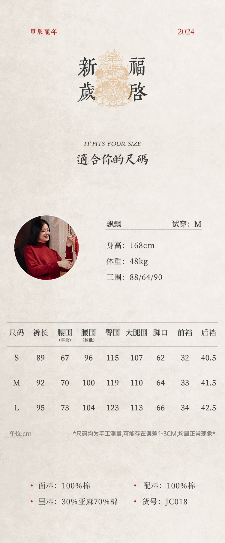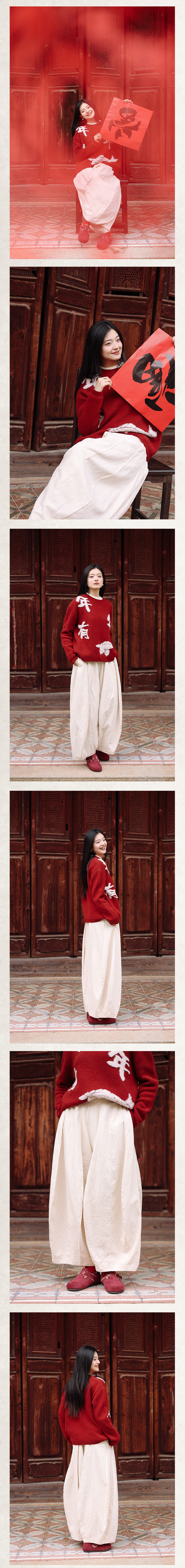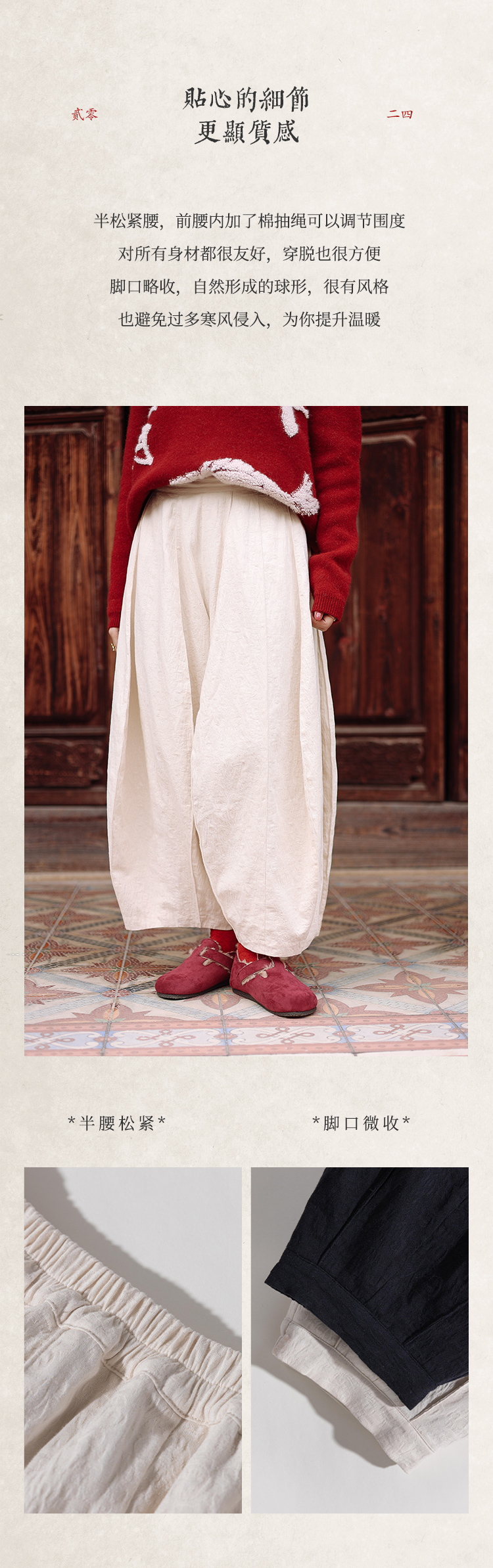 绽放018+220朵/2024新款复古立体浮雕压花半松紧腰单层纯棉阔腿灯笼裤