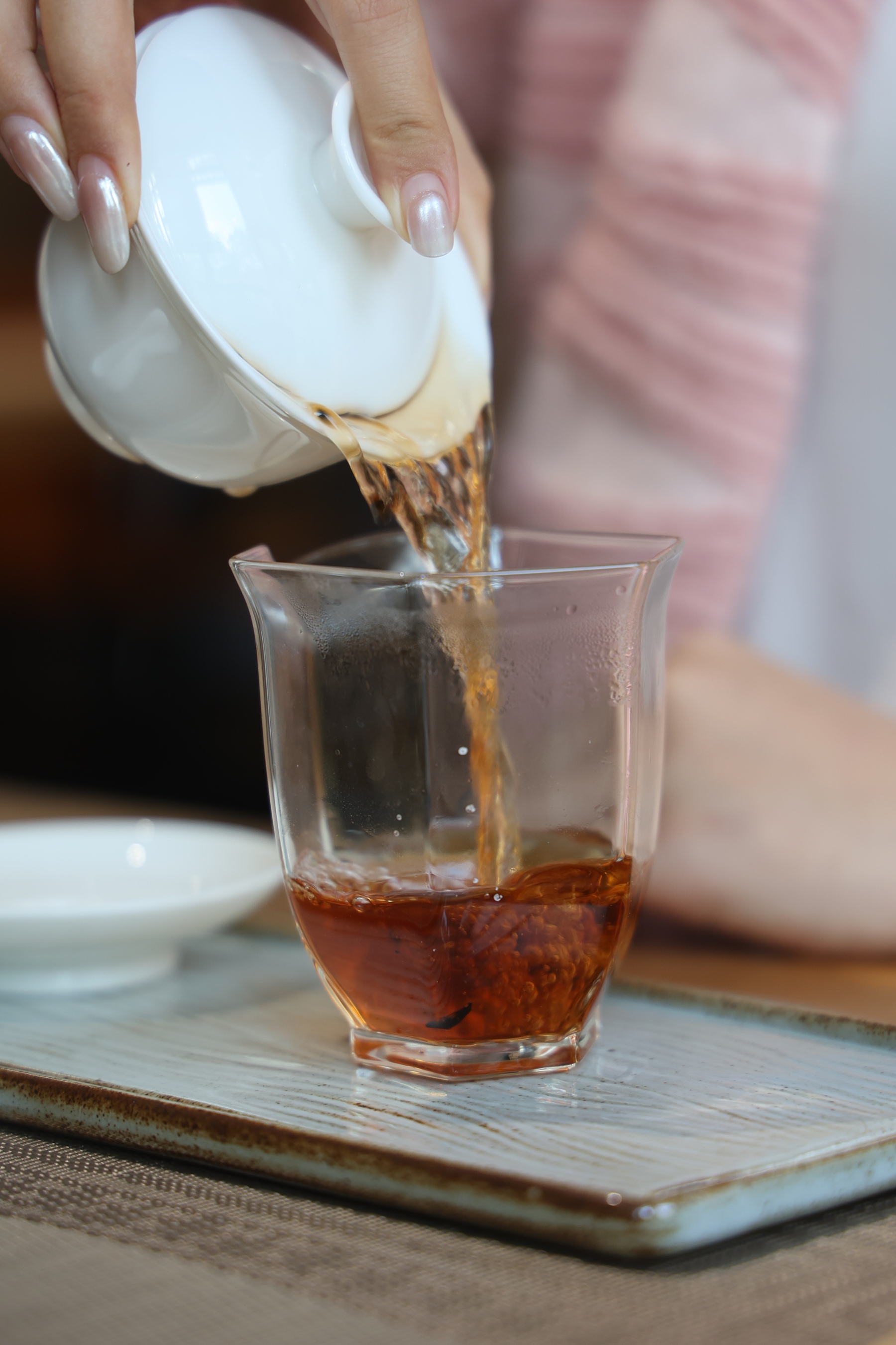这款2017年易武宫廷熟茶,入口就是米汤一样的糯甜,顺滑到喉咙自己往下走。喝完三分钟,口腔里还有回甘。不苦、不涩、不顶舌,只有古树熟茶才有的温润甜糯。