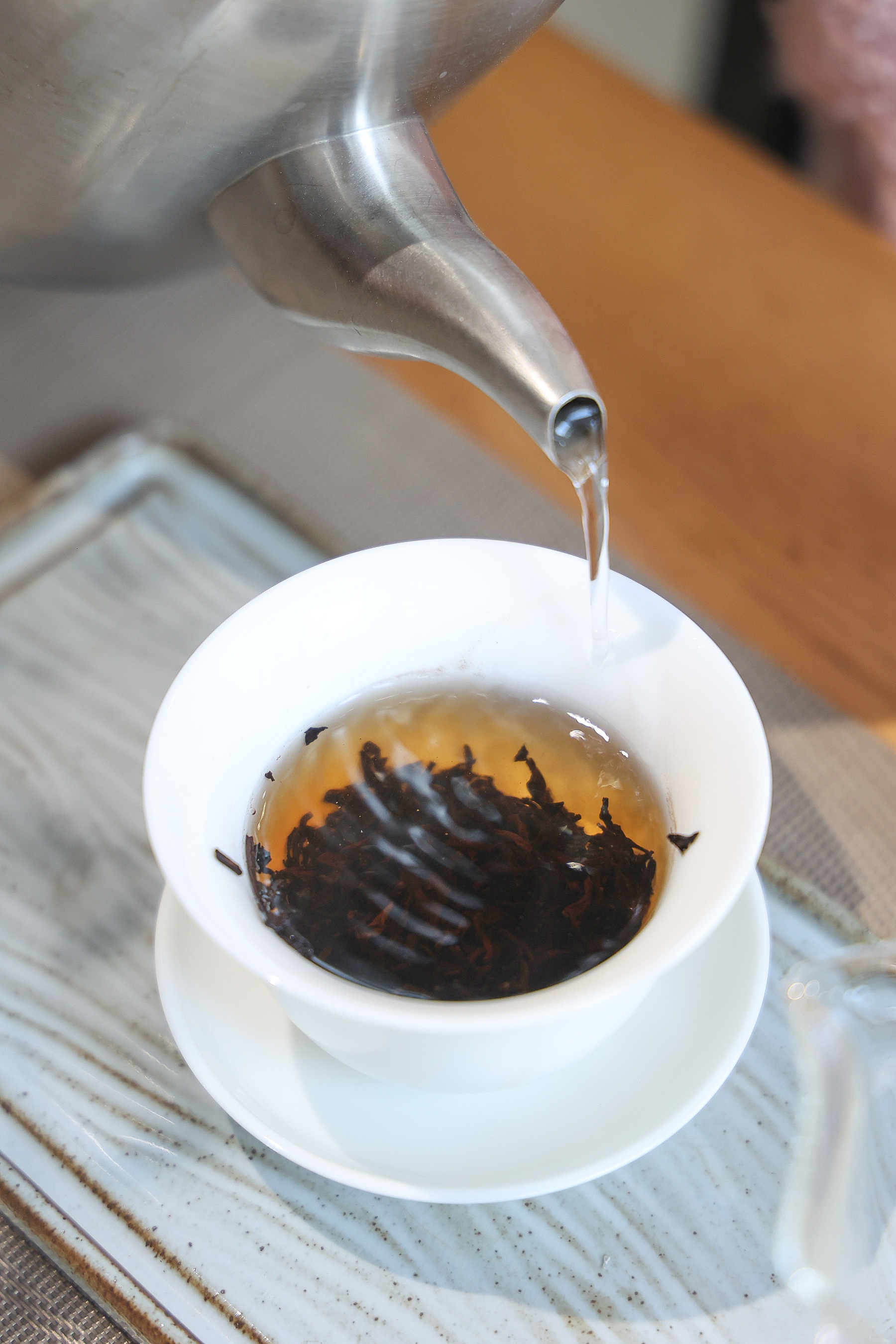 洗茶出汤,汤色是陈了七年的宝石红,透亮见底。入口不是新熟茶的堆味、苦底,是米汤一样的糯感。泡到第八水,茶底还是完整的芽尖立着,汤还是甜的。