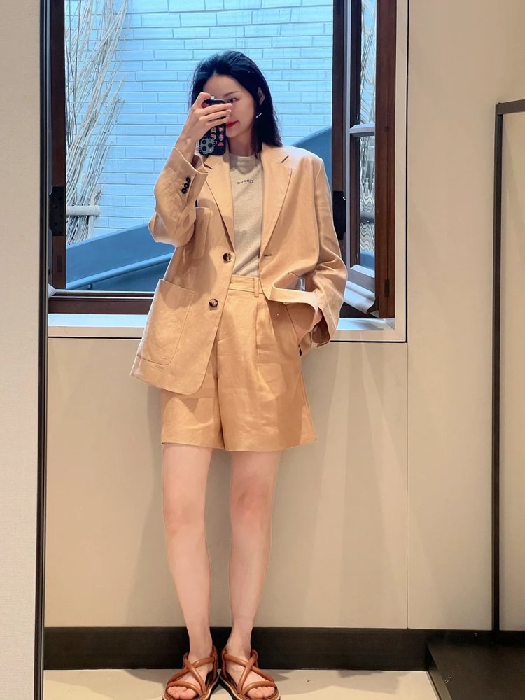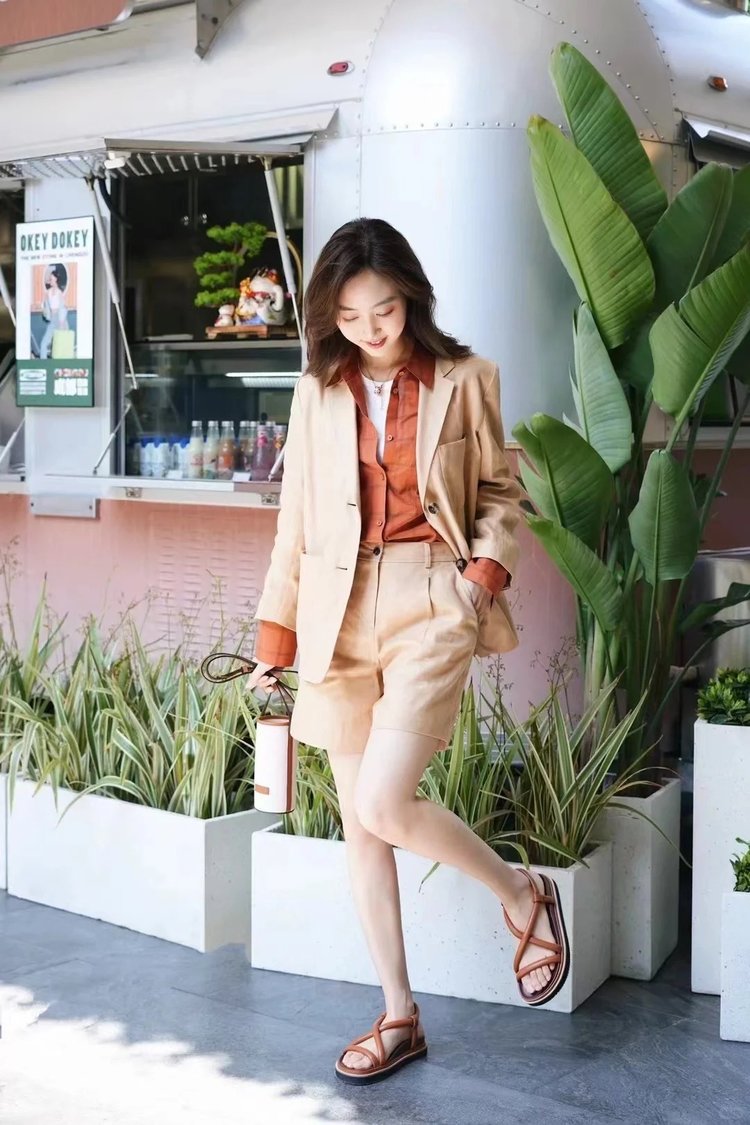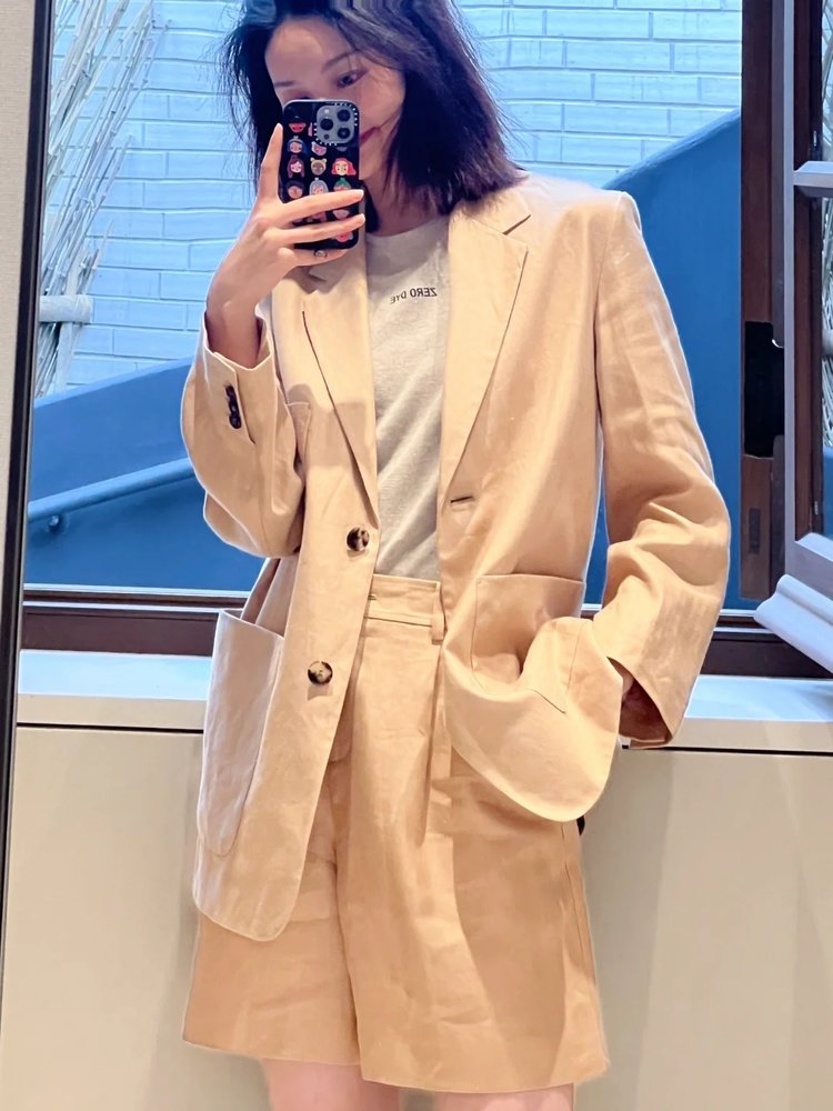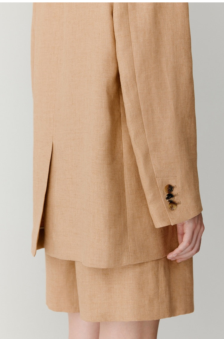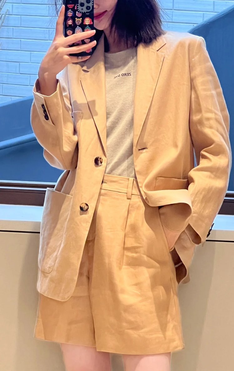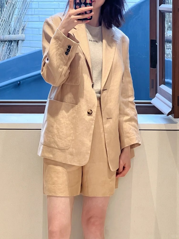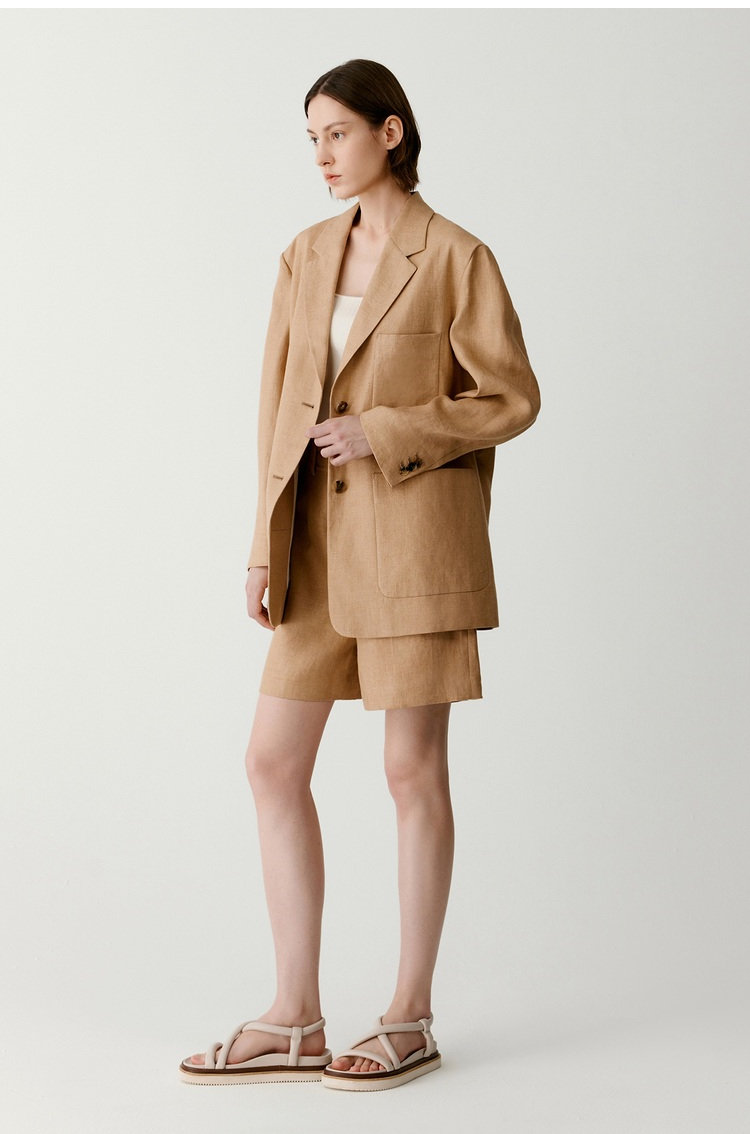 新款普洱染色的斜纹汉麻西装外套,打破城市沉闷,带来随性自然气息,挺括流畅线条描摹独立气场,搭配同面料短裤成套穿着,时髦翻倍。