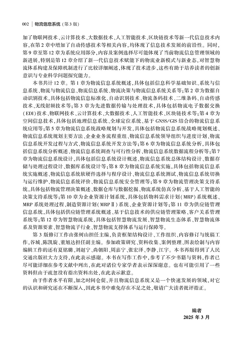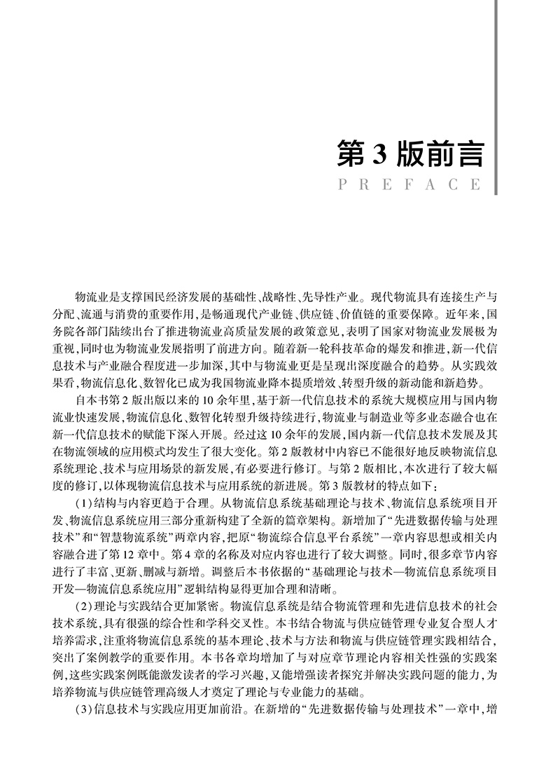本书在普通高等教育;十一五国家级规划教材的基础上修订而成。本书全面系统地阐述了物流信息系统相关理论知识与应用进展,内容包括3篇共计12章。第1篇主题为基础理论与信息技术,具体包括物流信息系统概述、数据自动识别技术、先进数据传输与处理技术、空间信息技术;第2篇主题为物流信息系统项目开发,具体包括物流信息系统战略规划与开发、物流信息系统分析、物流信息系统设计、物流信息系统实施;第3篇主题为物流信息系统应用,具体包括物流管理决策支持系统、企业资源计划系统、供应链管理信息系统、智慧物流系统。本书可作为高等院校物流管理专业本科学生、工商管理硕士(MBA)以及相关专业研究生教材,亦可供其他专业学生和企业管理人员学习参考。