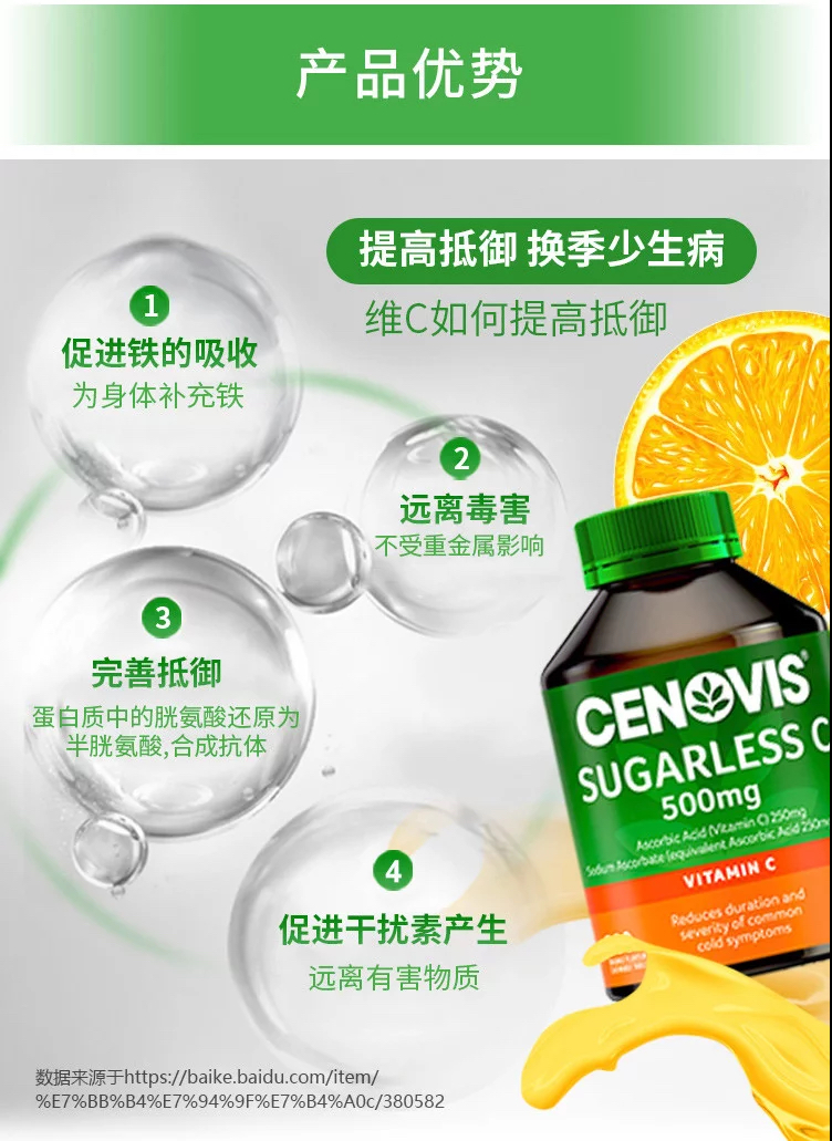 Cenovis 无糖维他命C/维生素C 咀嚼片(增强免疫抗感冒)能够提供高效力的维生素C,易吸收无刺激,具有极高的抗氧化指数,减少自由基对身体损害,可以延缓衰老,美白滋润肌肤,保护细胞健康、降低疾病发生的风险。还有助于增强免疫系统,促进组织修复和细胞的保护。让你健康无忧,充满活力。适合素食者,不含人工色素,香料,甜味剂,防腐剂或其他添加剂。
