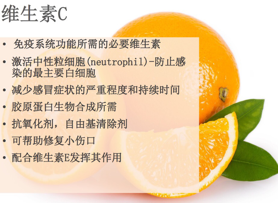 它是一种抗氧化剂,可以作为自由基清除剂。维生素C不会储存在体内,经常摄入量是可取的。