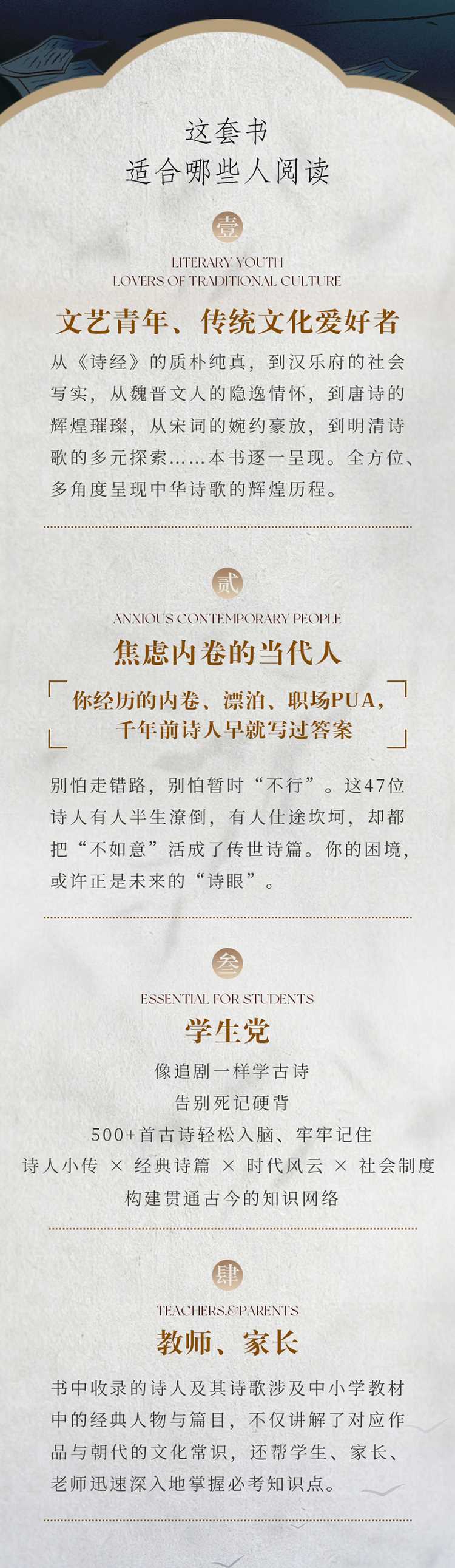 诗人不是神,是和你我一样的普通人他们在泥泞中坚持理想,在困顿中写下星光。读这套书,不仅是学诗,更是找回我们骨子里的风骨、韧性与浪漫。