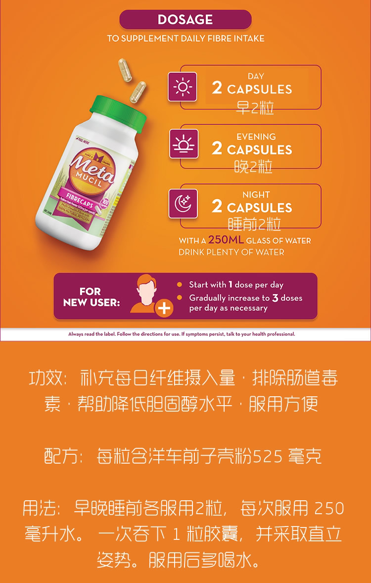 Metamucil 膳食纤维胶囊(清肠、排油、燃脂、胆固醇)中的洋车前子原产地是伊朗和印度经研究洋车前子种子中的膳食纤维质及为丰富。膳食纤维(Dietary fiber)属多糖类,广泛存在于植物性食品中。就其分子结构来看,是高分子化合物,具有不能被消化酵素分解的特性,适量摄食,可以维持肠道蠕动、促进废物排出洋车前子种皮粉是相当优良的膳食纤维,纤维含量高达87%,含有纤维素、半纤维素、果胶、木质素及藻酸等可溶性及不可溶性两类纤维,具有强大的吸水性,遇水约可膨胀约50倍,故服用时必须多喝水,促使肠内运动顺畅。