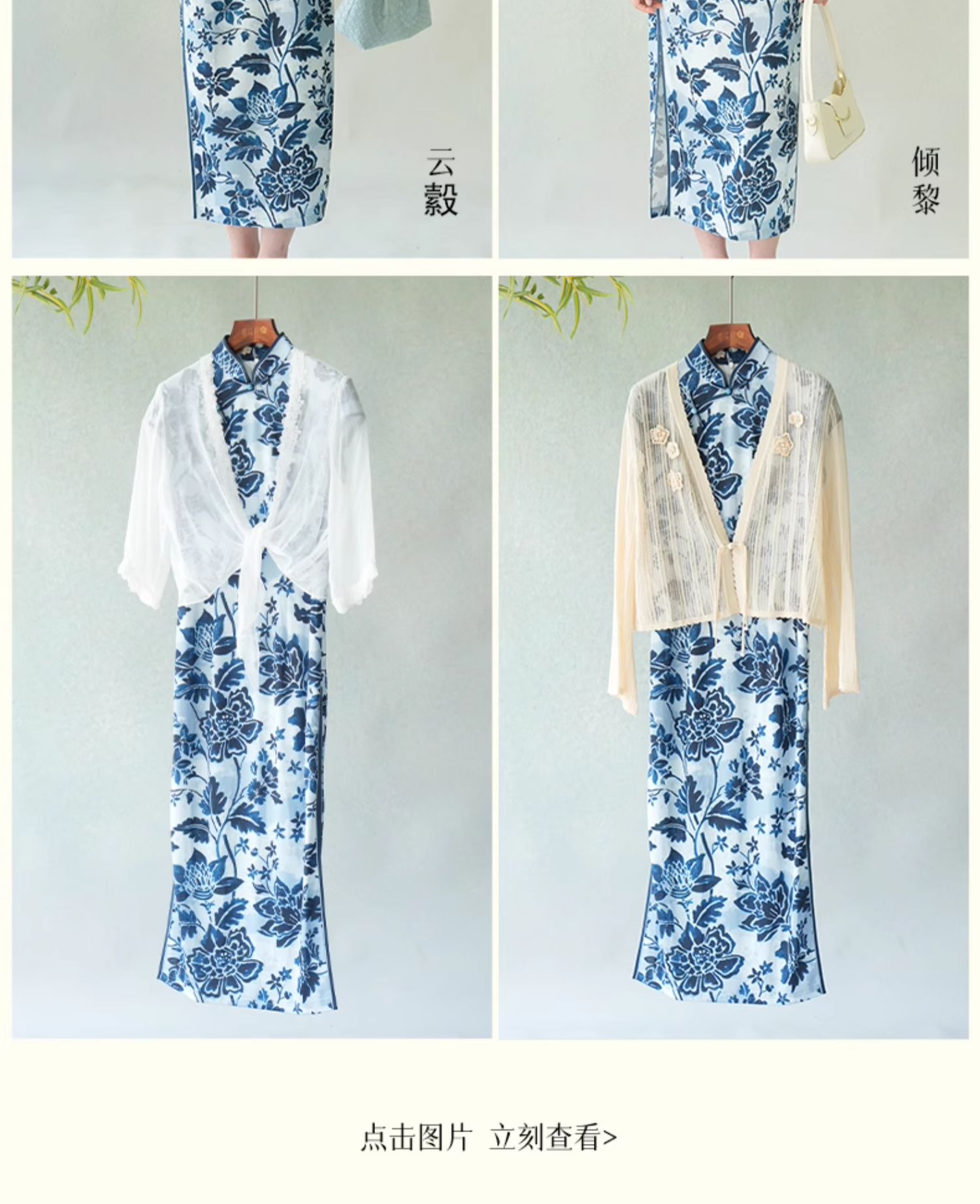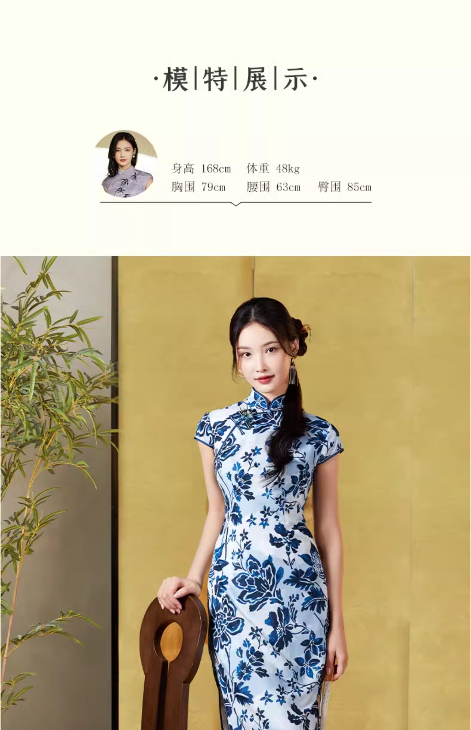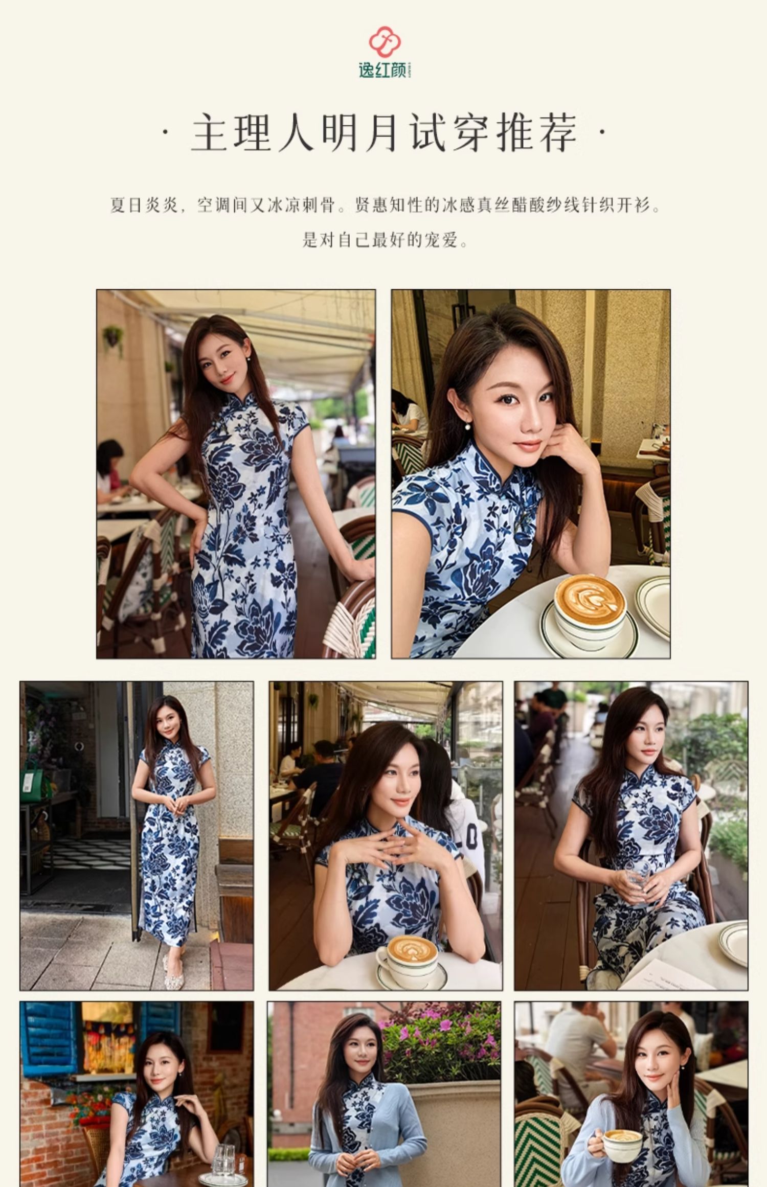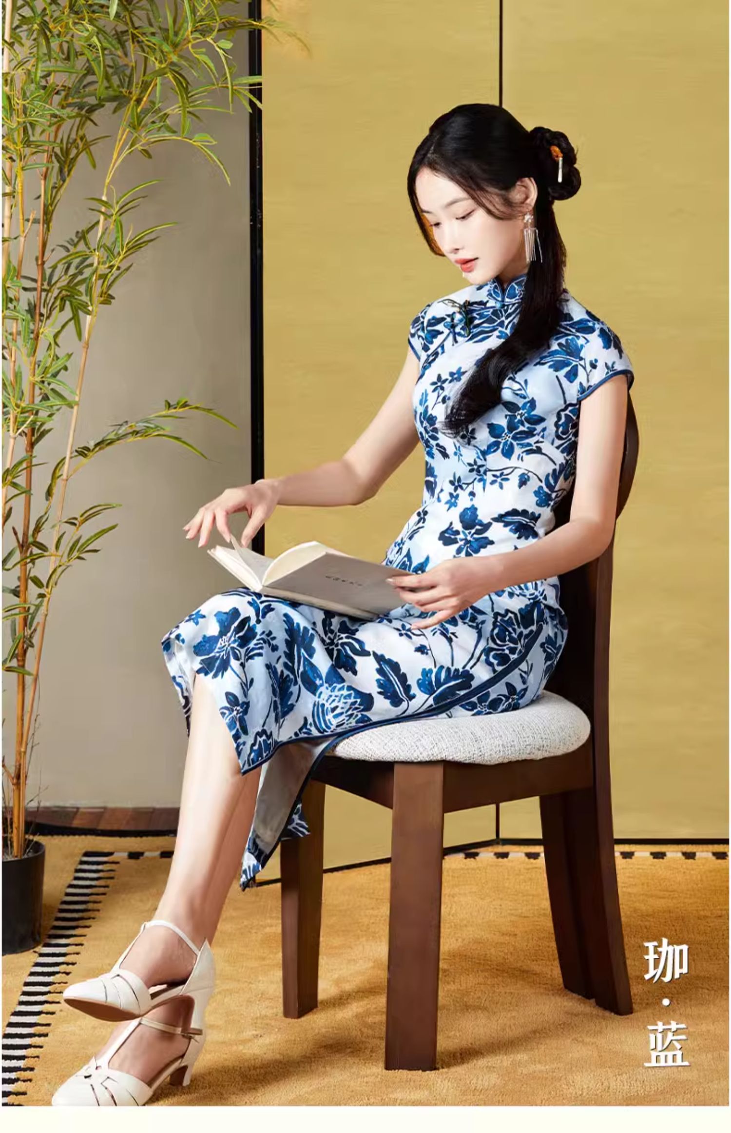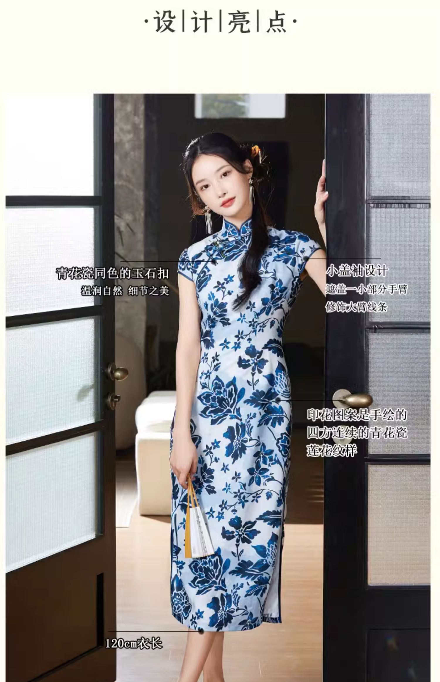 逸红颜珈蓝2025夏新品冰感针织醋酸青花瓷修身显瘦复古改良旗袍女