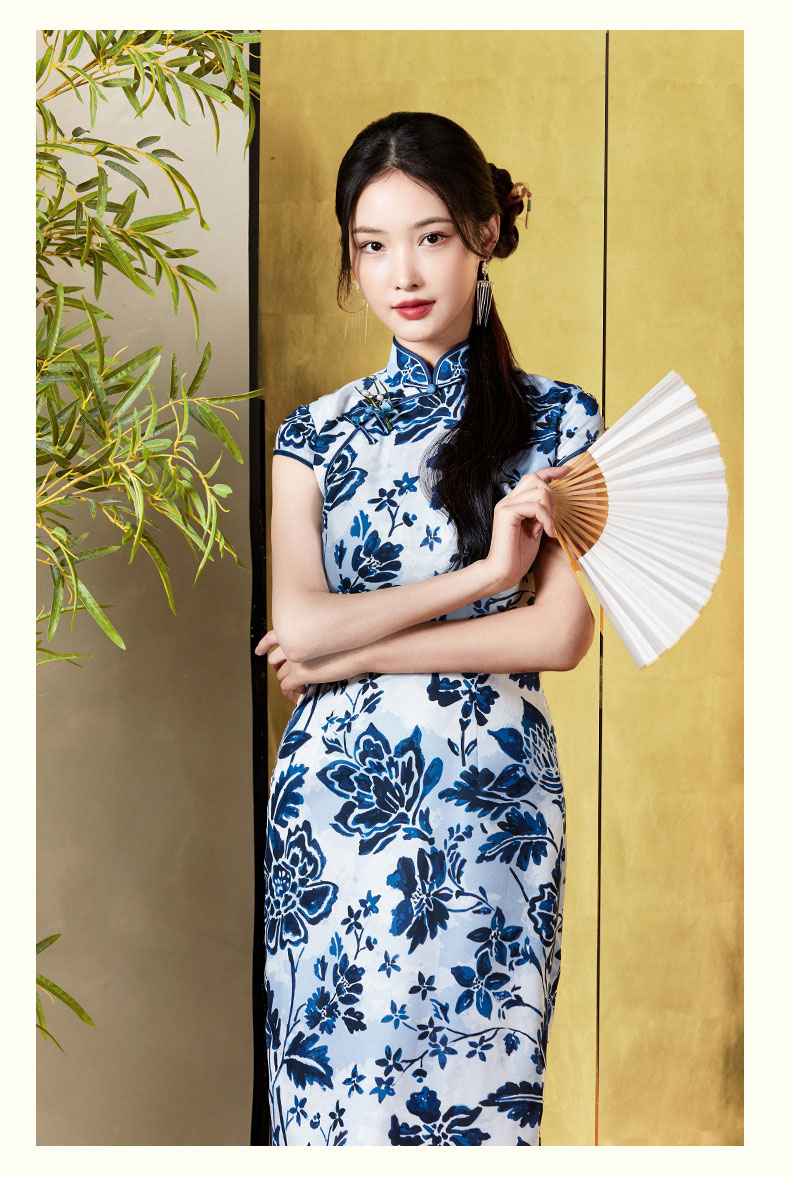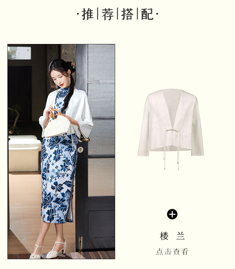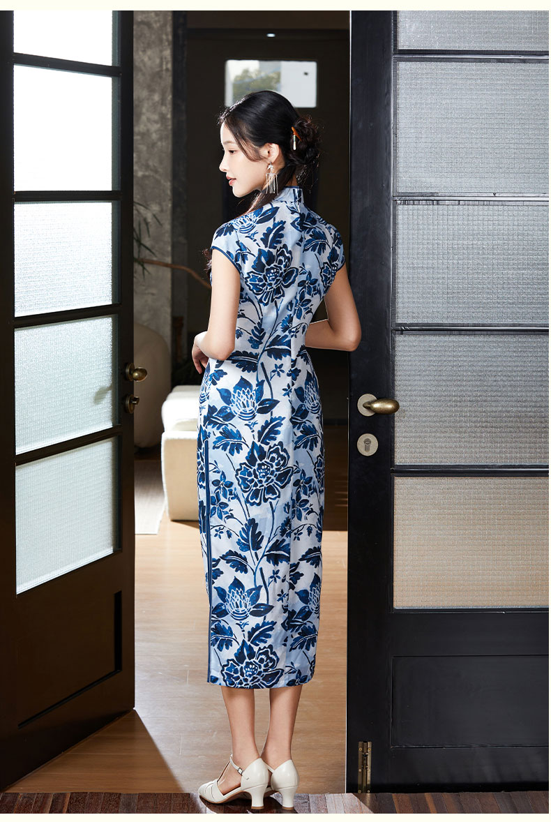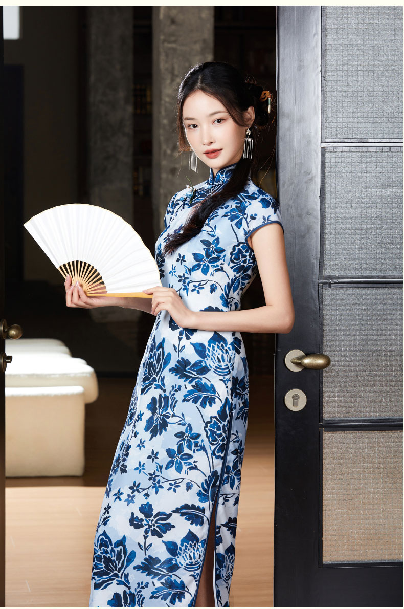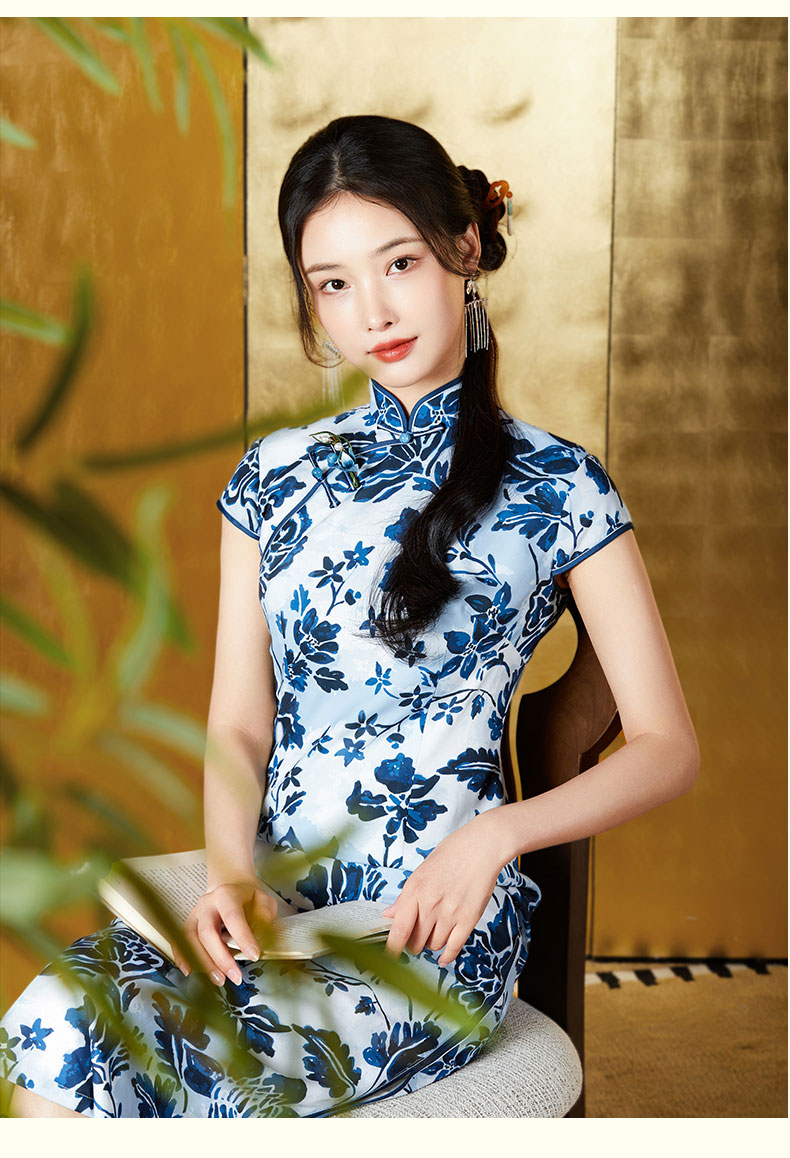 逸红颜珈蓝2025夏新品冰感针织醋酸青花瓷修身显瘦复古改良旗袍女
